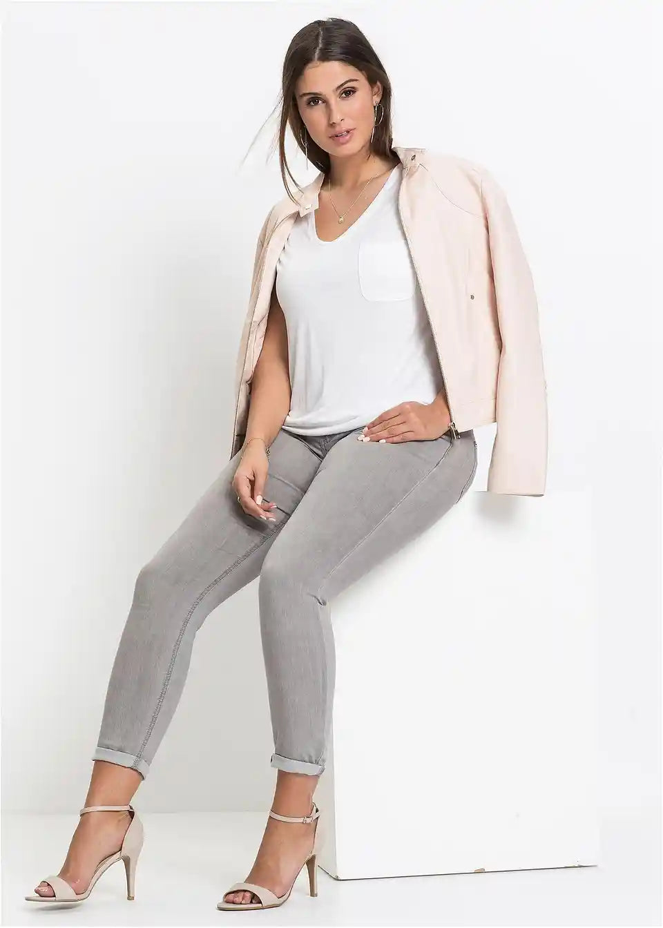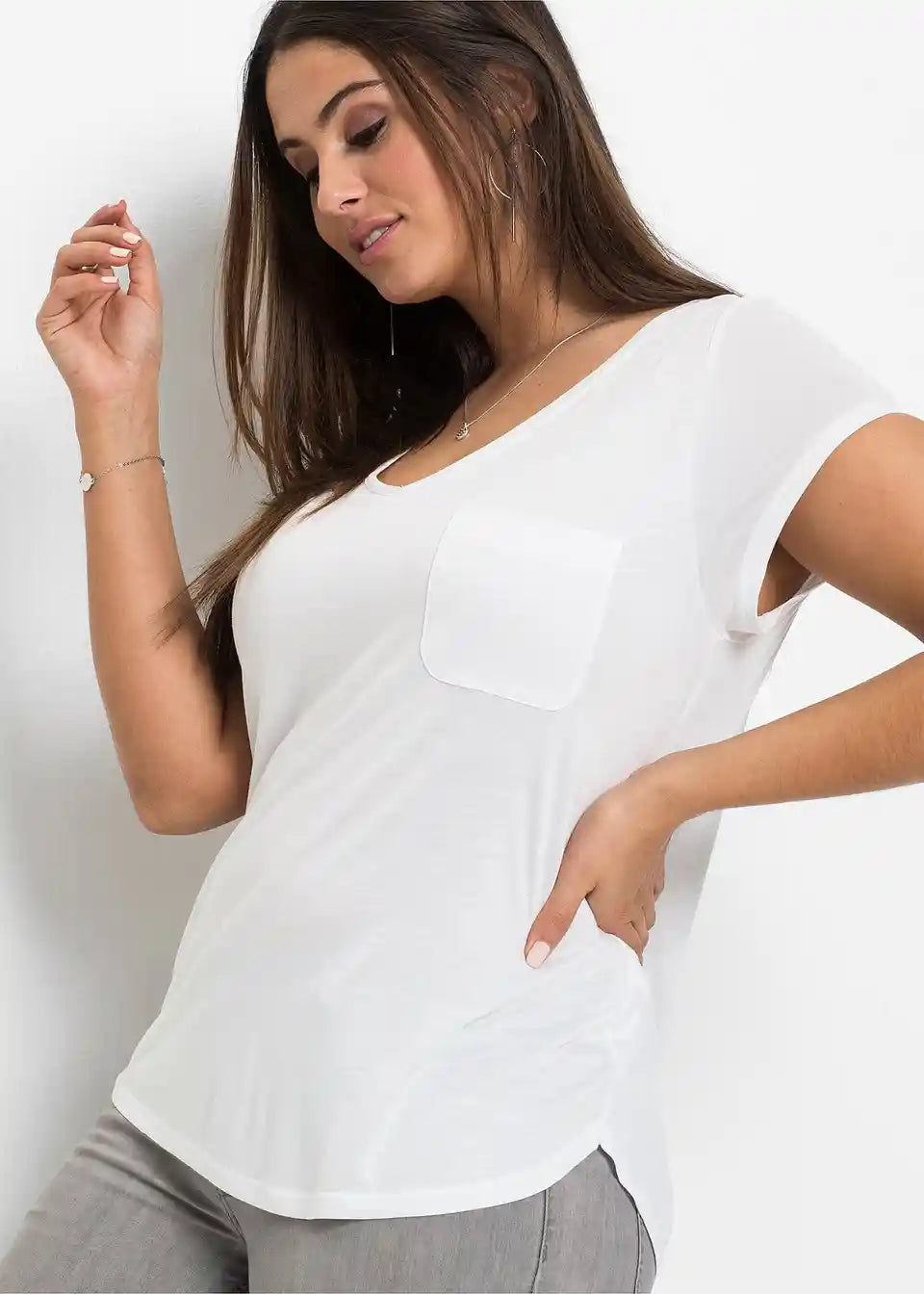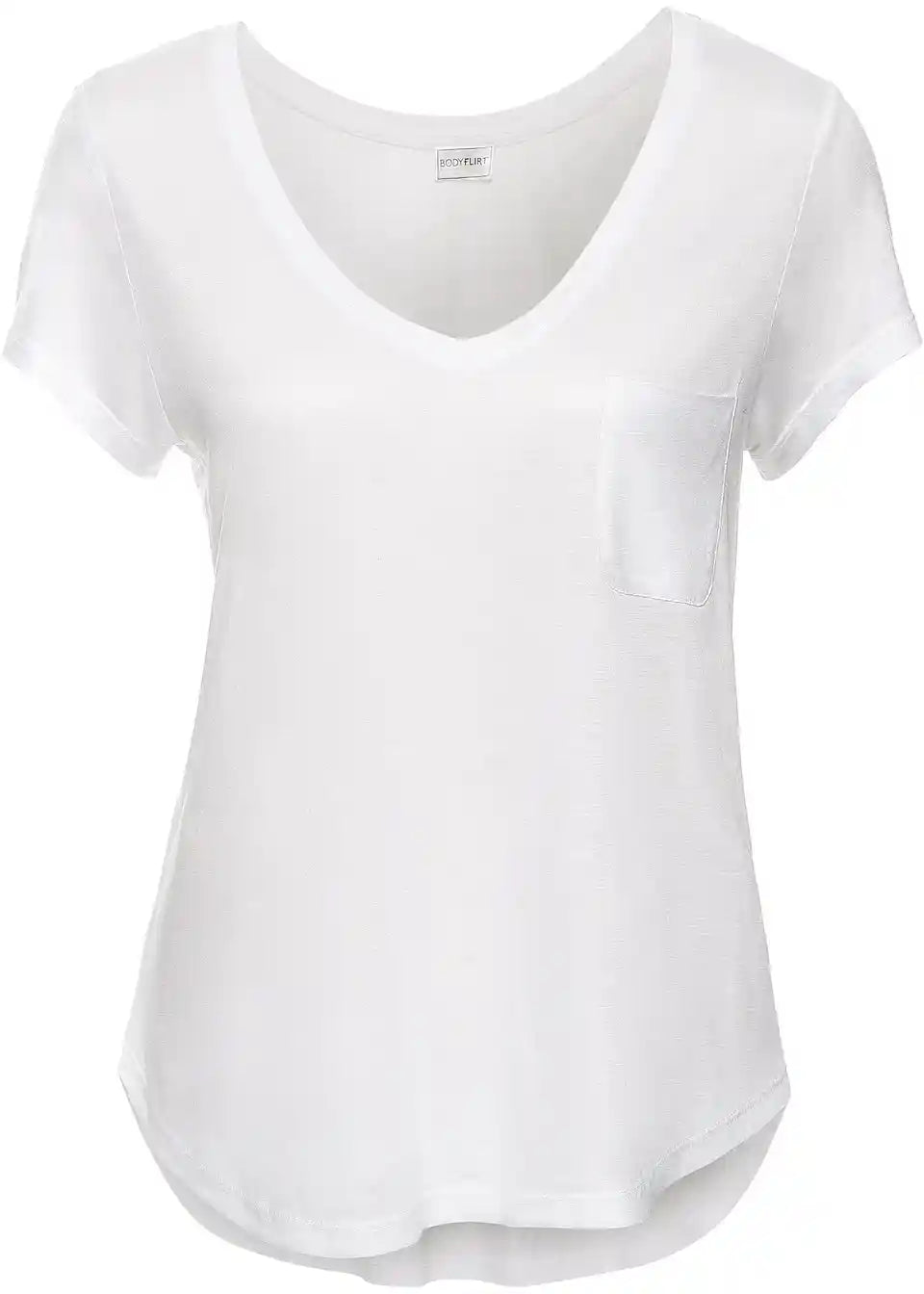 Prekrasna majica s lagano sjajnim materijalom, diskretnim V-izrezom, zaobljenim rubom i malim džepom na prsima. Duljina u veličini 36/38 otprilike 64 cm.