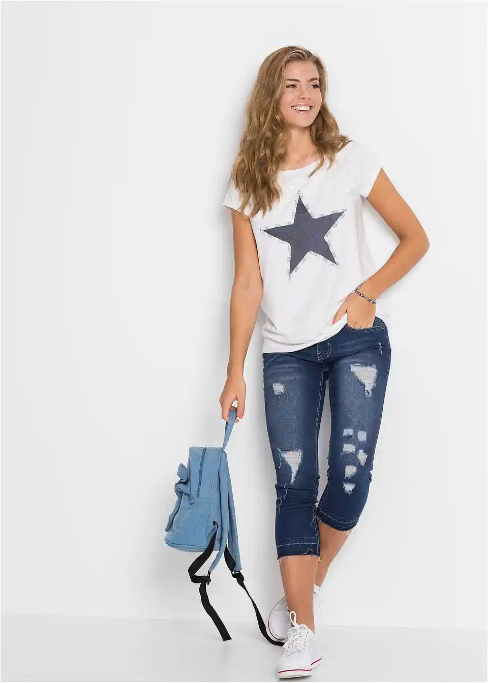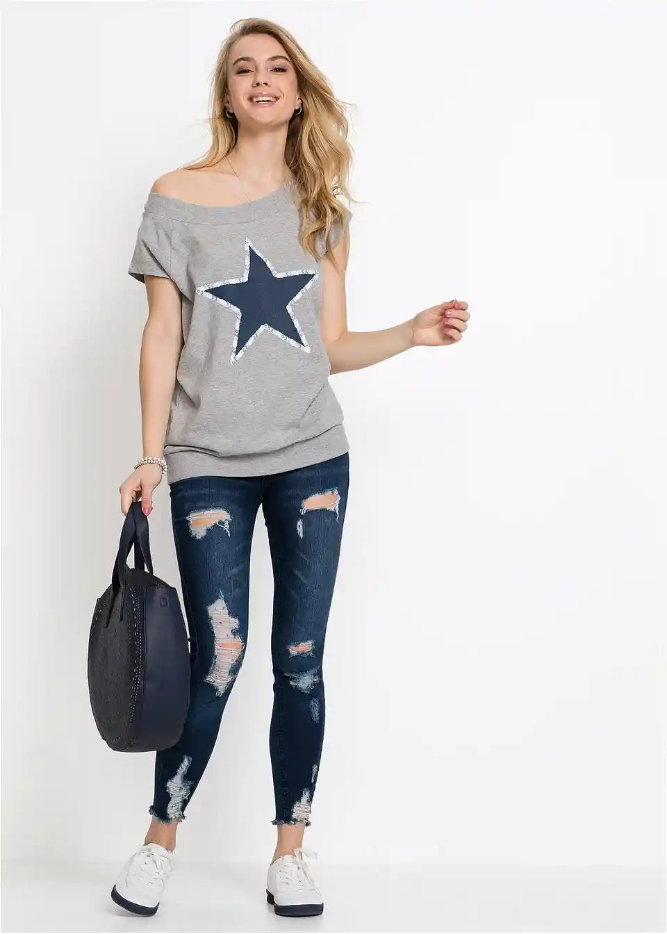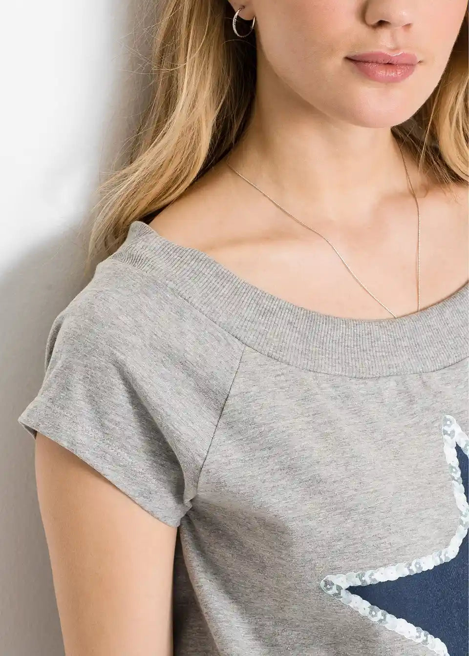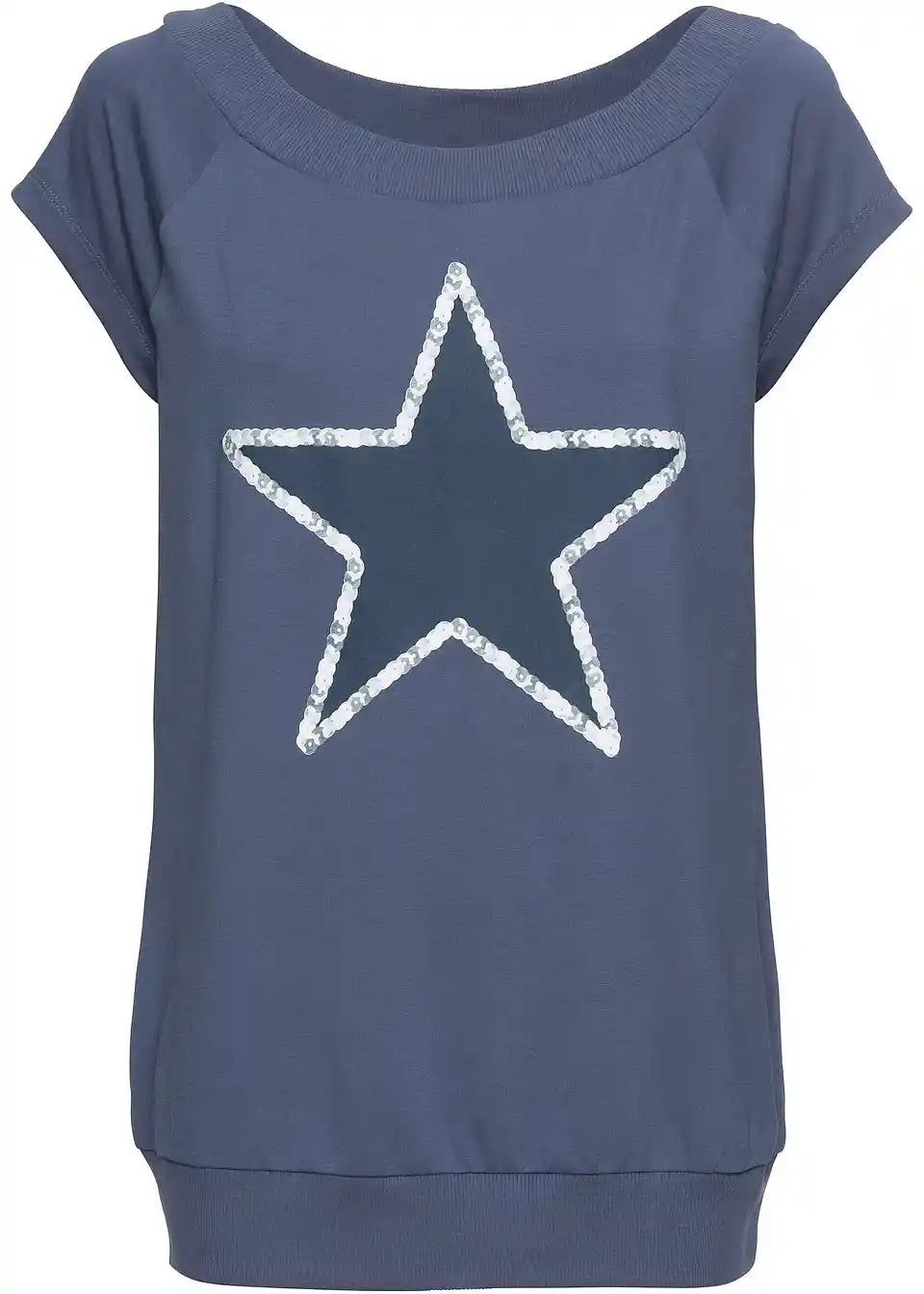 Ova majica, inspirirana dizajnom sweatshirt-a, osigurava cool izgled. Široki lađa izrez u rebrastom stilu savršeno se slaže s kratkim rukavima u raglan-stilu. Elastični ravni rub također je rebrast. Majica s printom zvijezda odlično se kombinira s uskim trapericama ili tajicama. Također sjajno izgleda uz kratke hlače ili mini suknje.