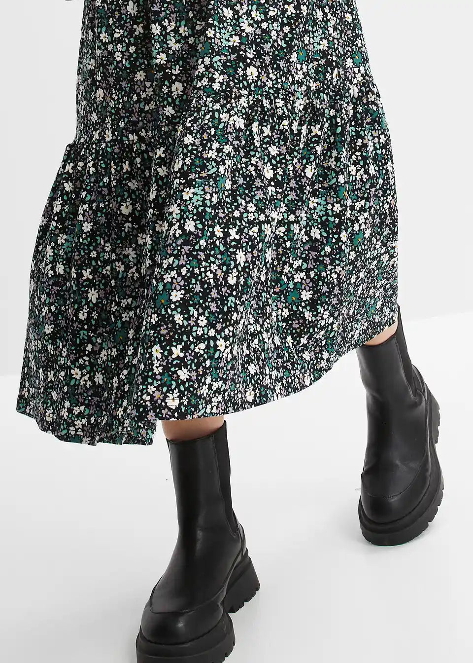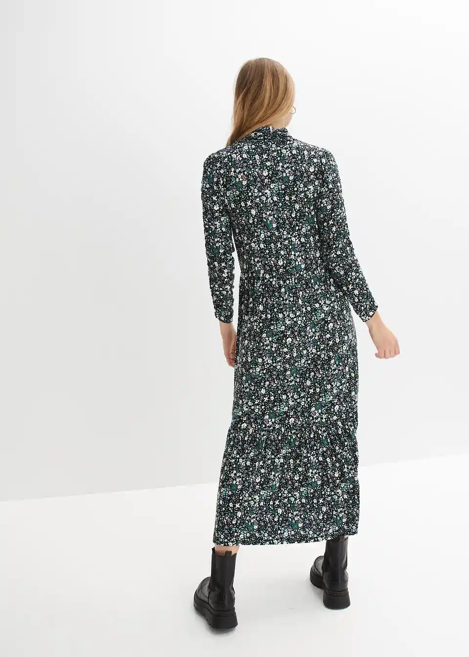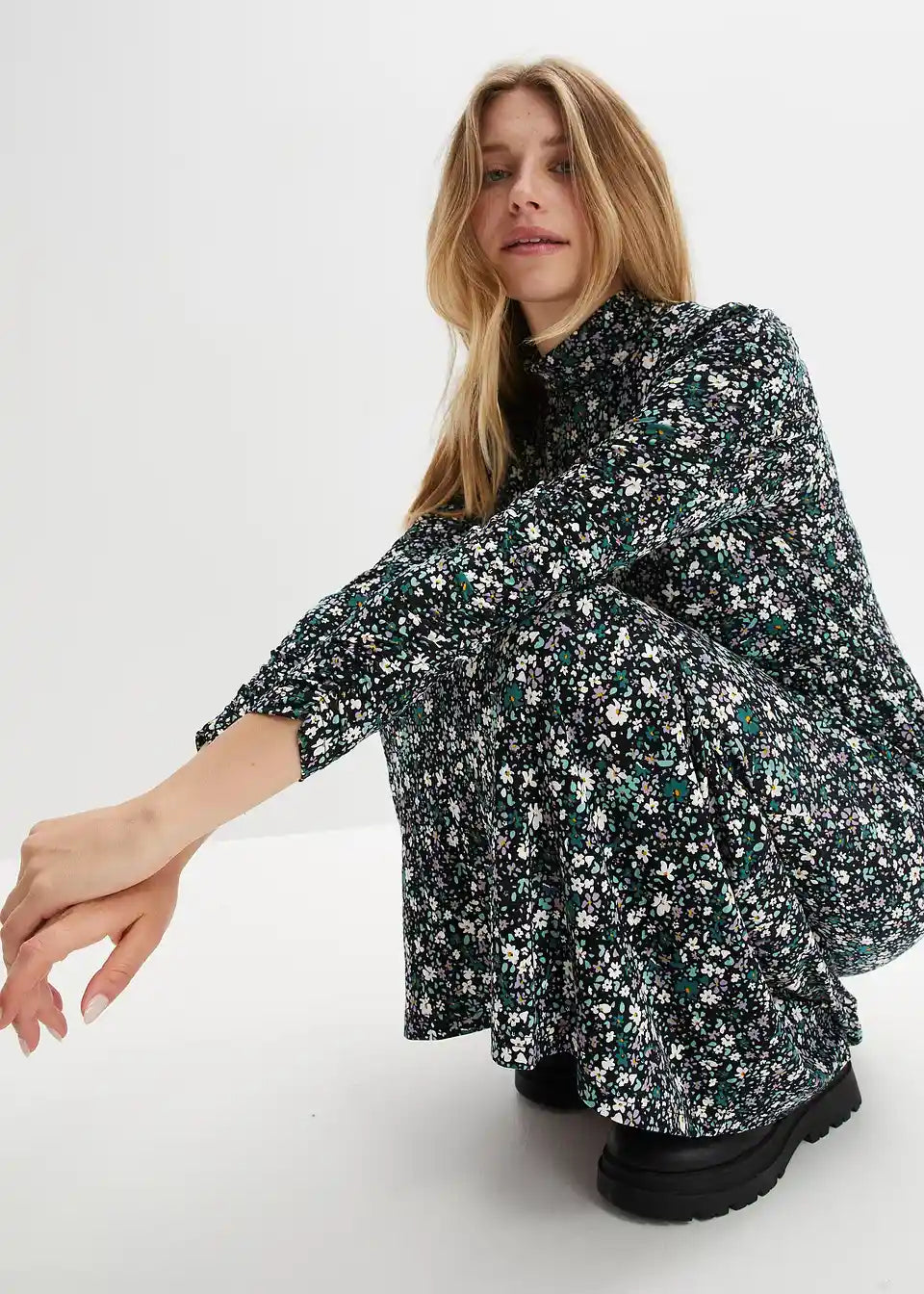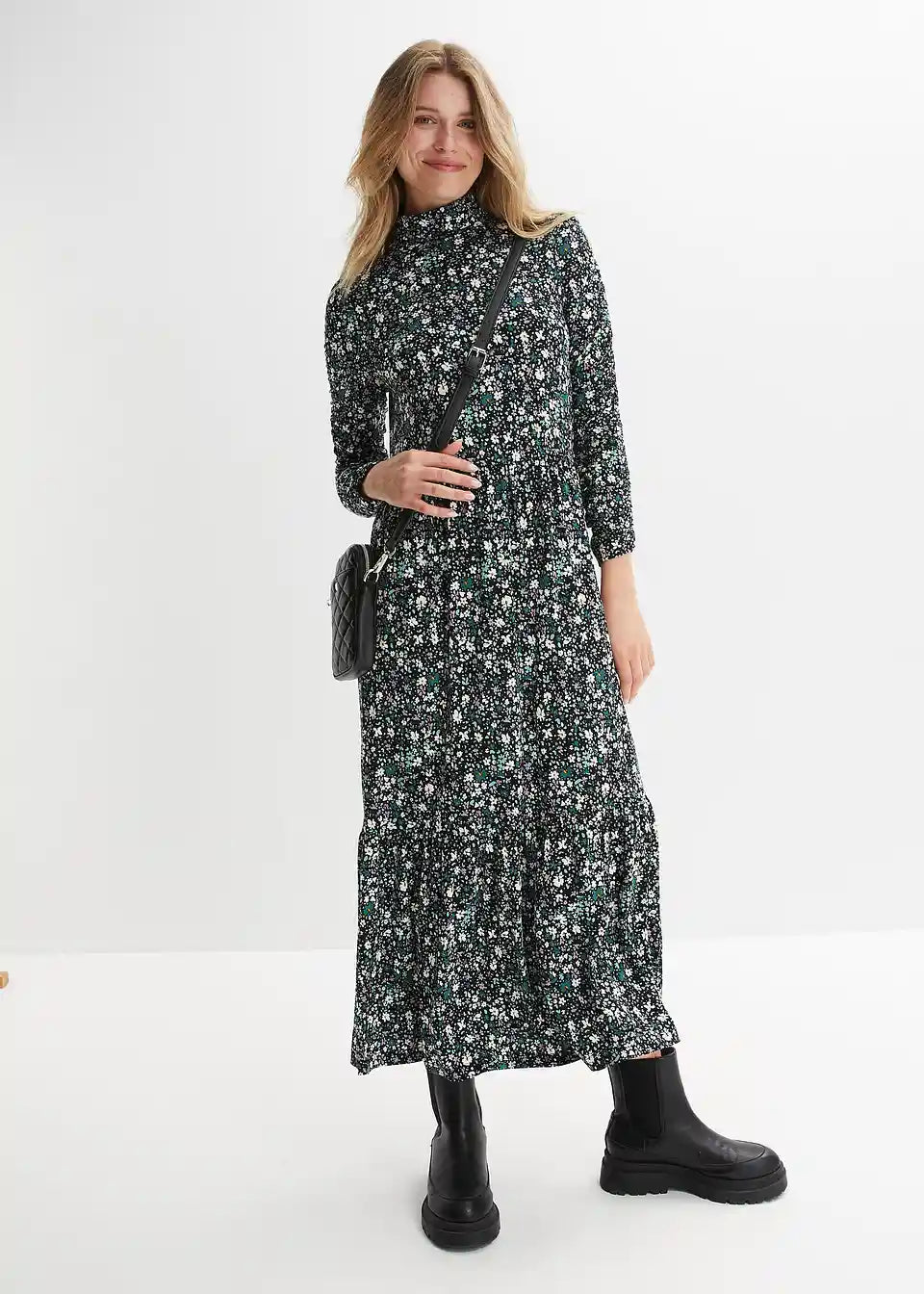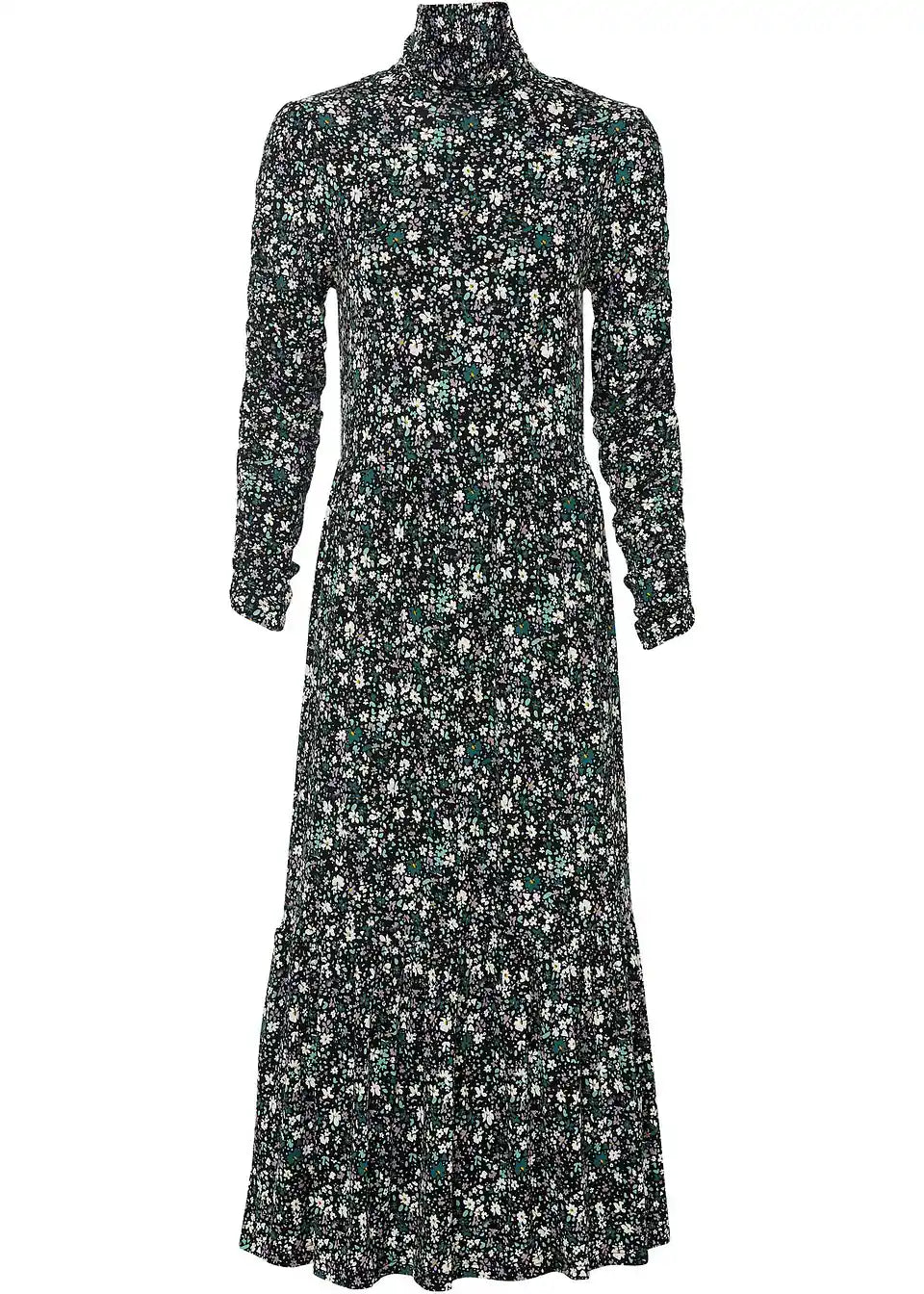 Jerse haljina s cvjetnim uzorkom, dolčevitom i naborima na rukavima