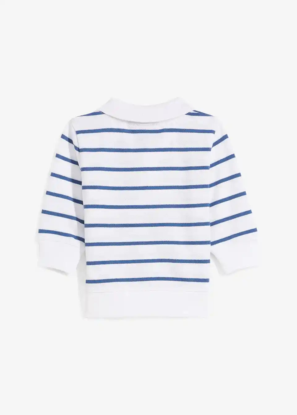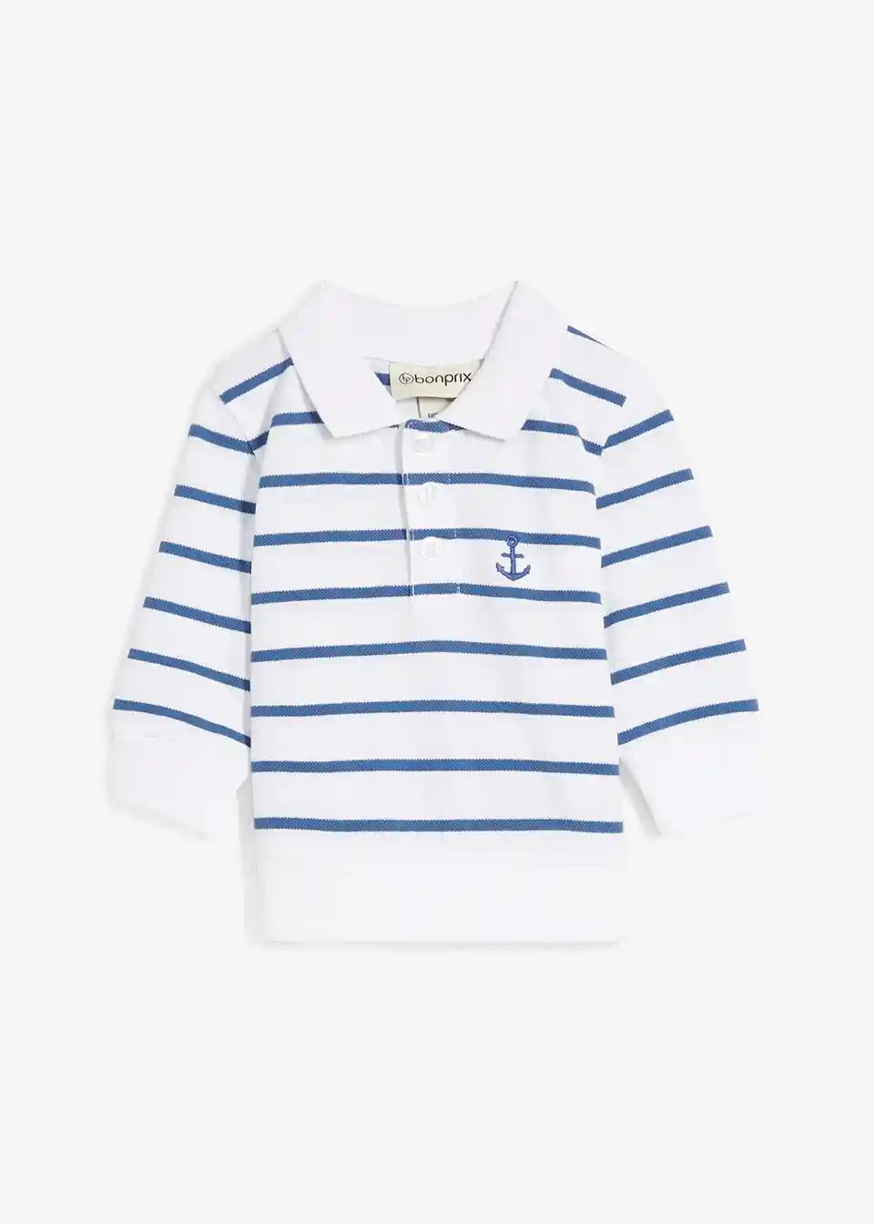 Piqué Polo majica od čistog organskog pamuka s dugim rukavima i klasičnim ovratnikom. Prugasti dizajn s prednjim kopčanjem na gumbe i izvezenim motivom sidra na prsima. Mekana Piqué struktura za ugodno nošenje.