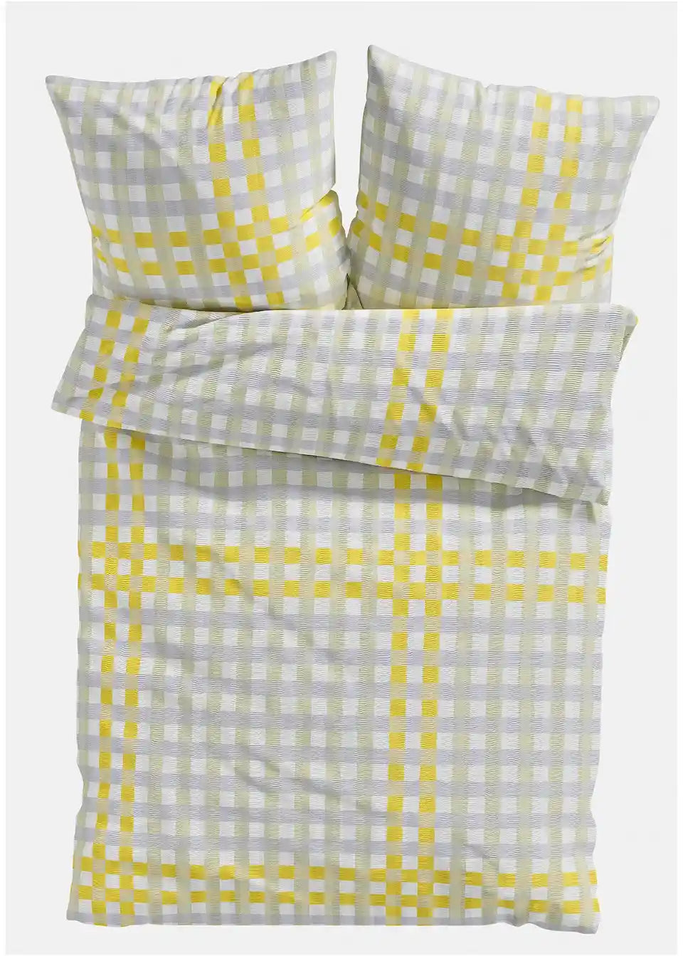 Posteljina s modernim kariranim dizajnom u nježnim sivim tonovima, upotpunjena živopisnim žutim naglascima