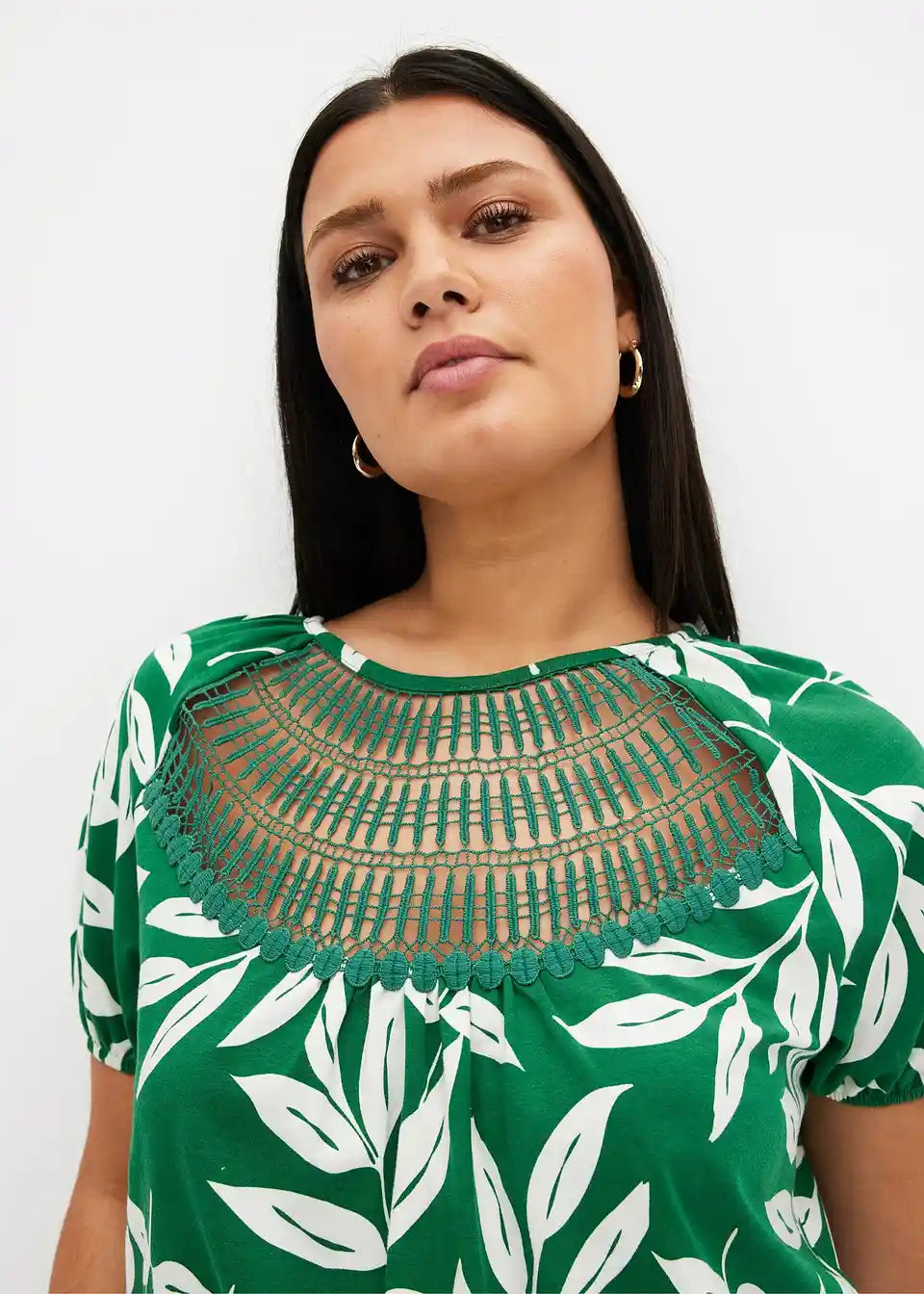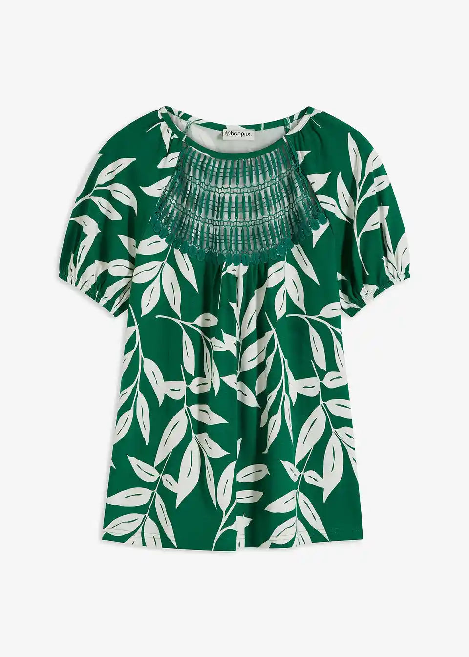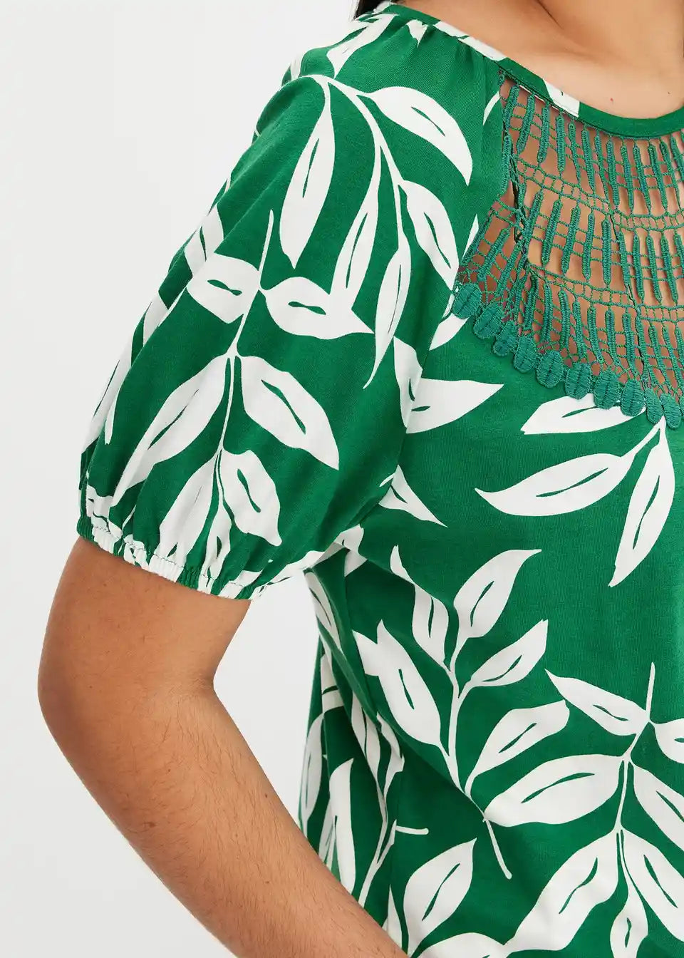 cvjetno printana majica s čipkastim umetkom sprijeda na dekolteu i malim puff rukavima