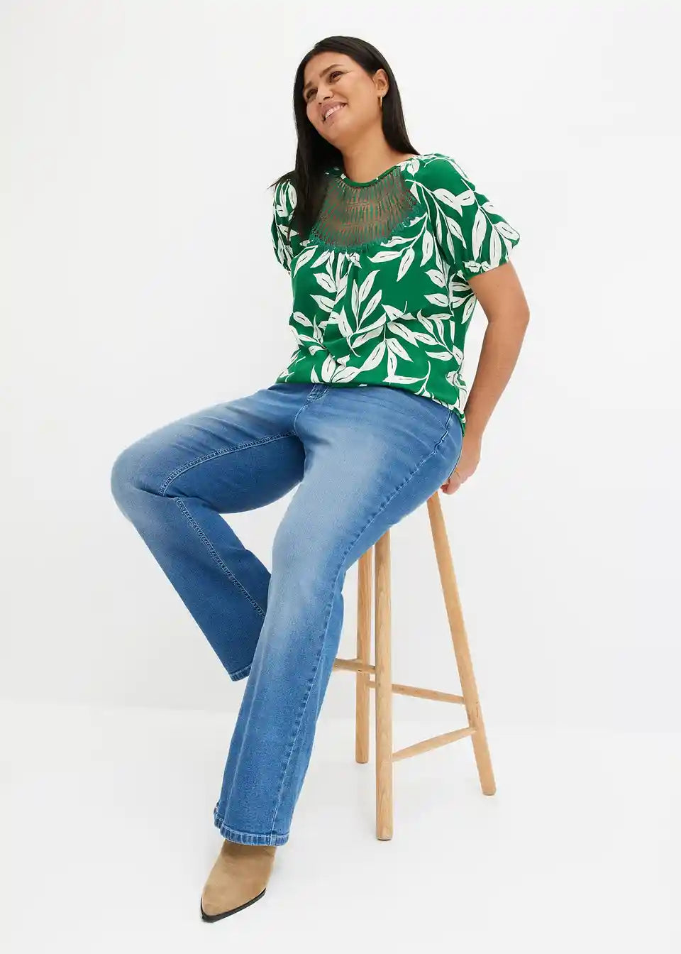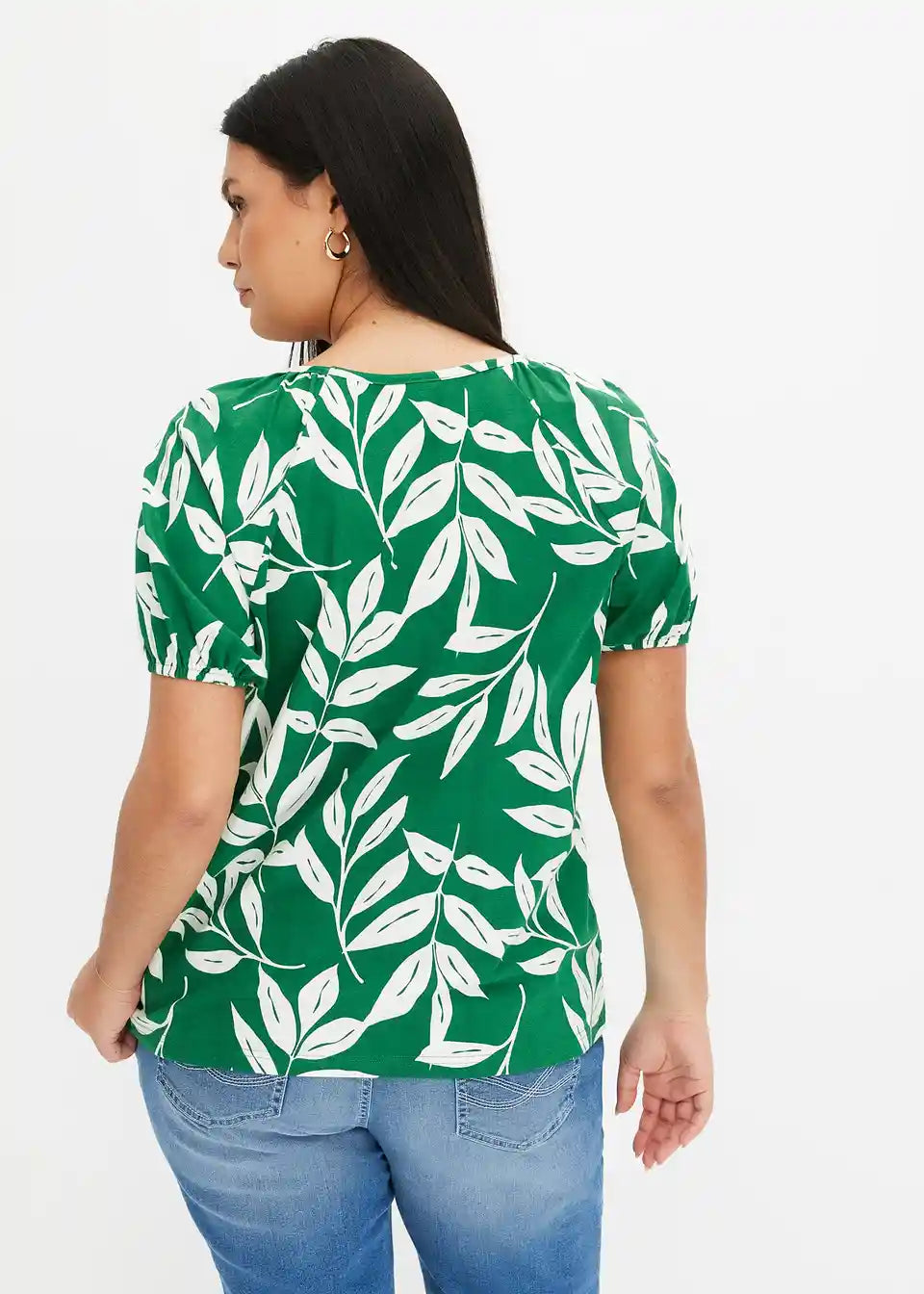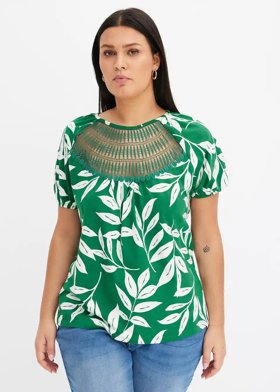 cvjetno printana majica s čipkastim umetkom sprijeda na dekolteu i malim puff rukavima
