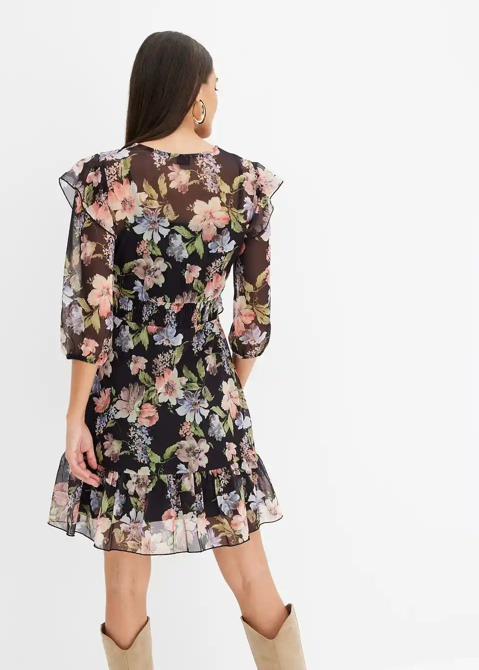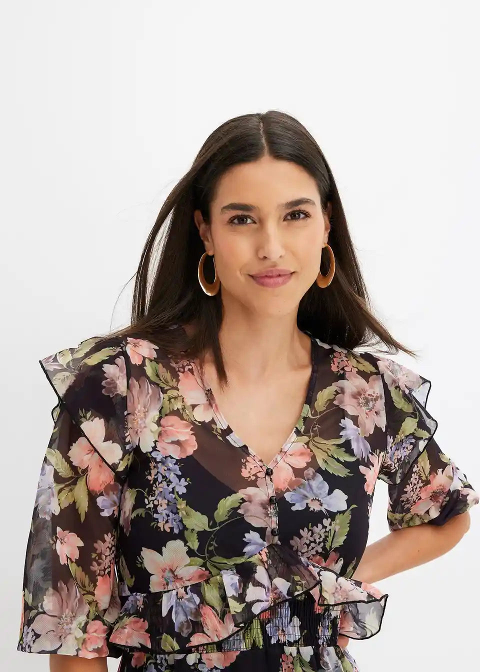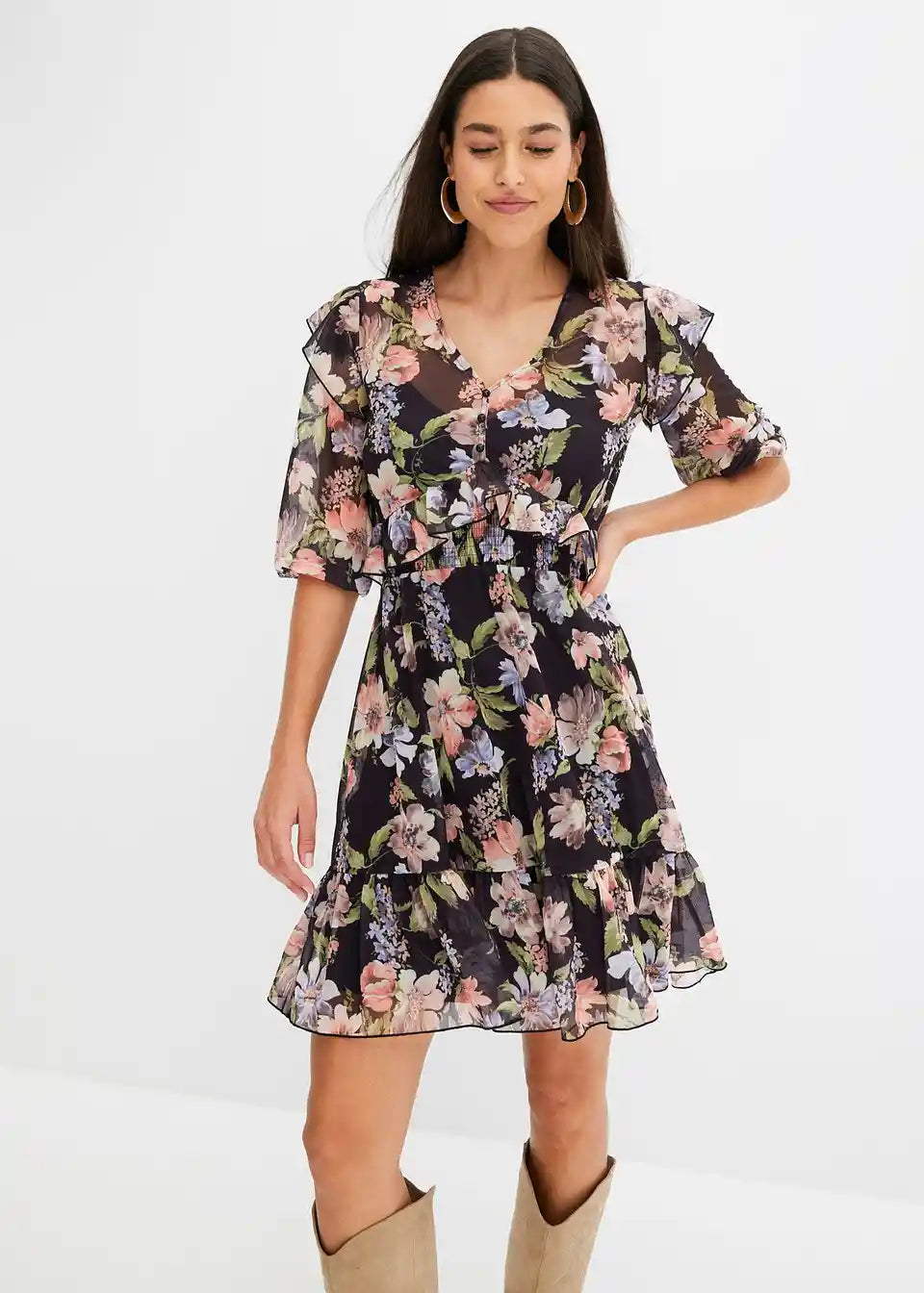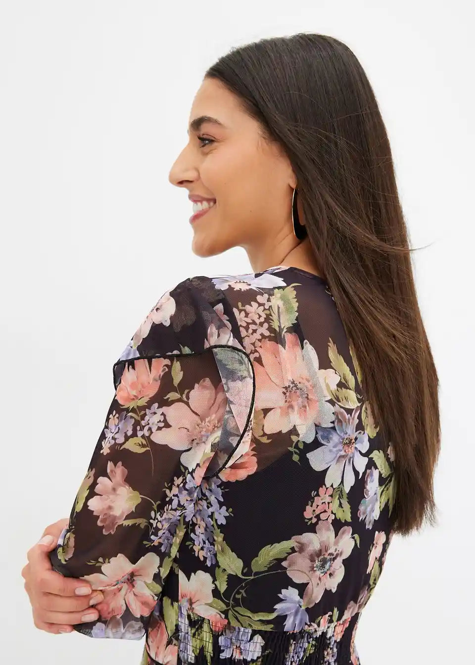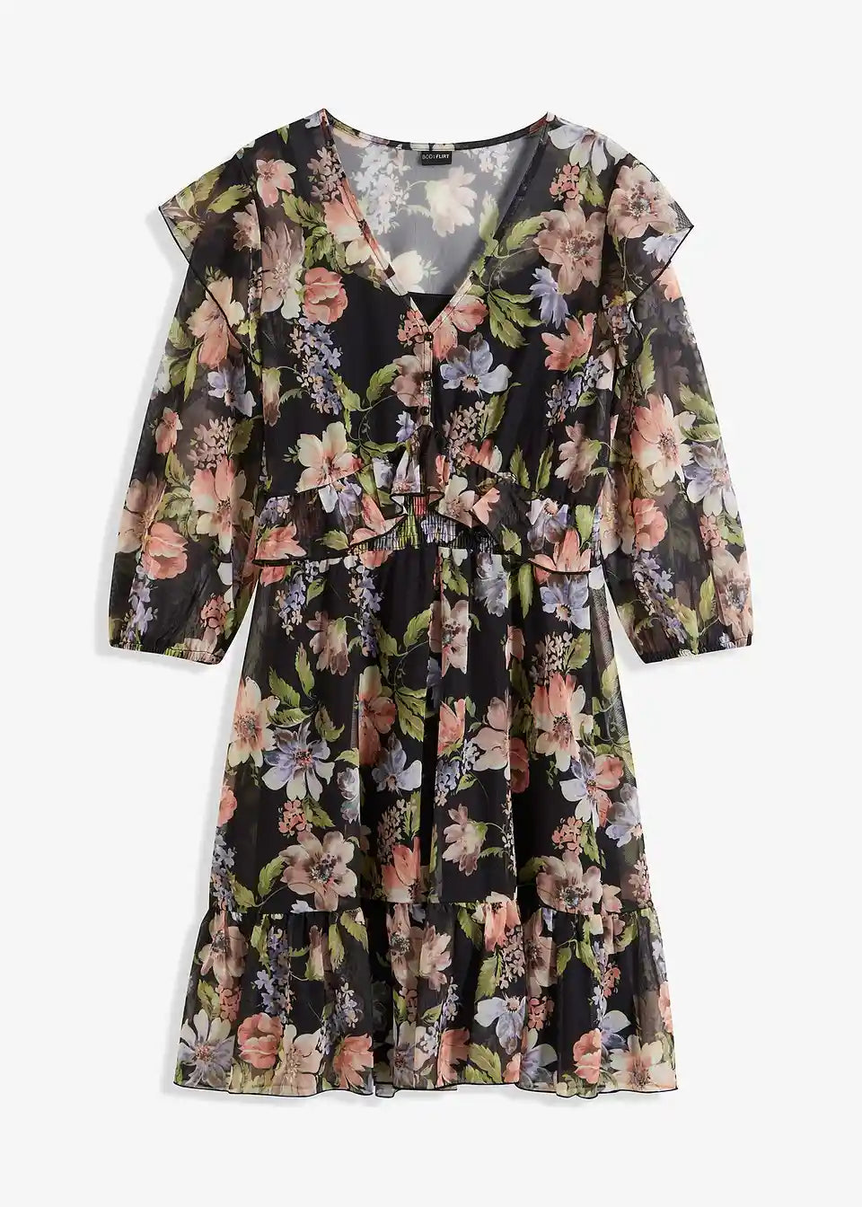 ženstvena Mesh-haljina s ukrasnim gumbima i volanima