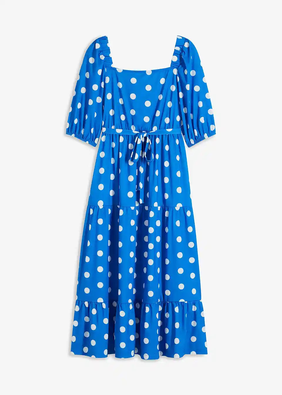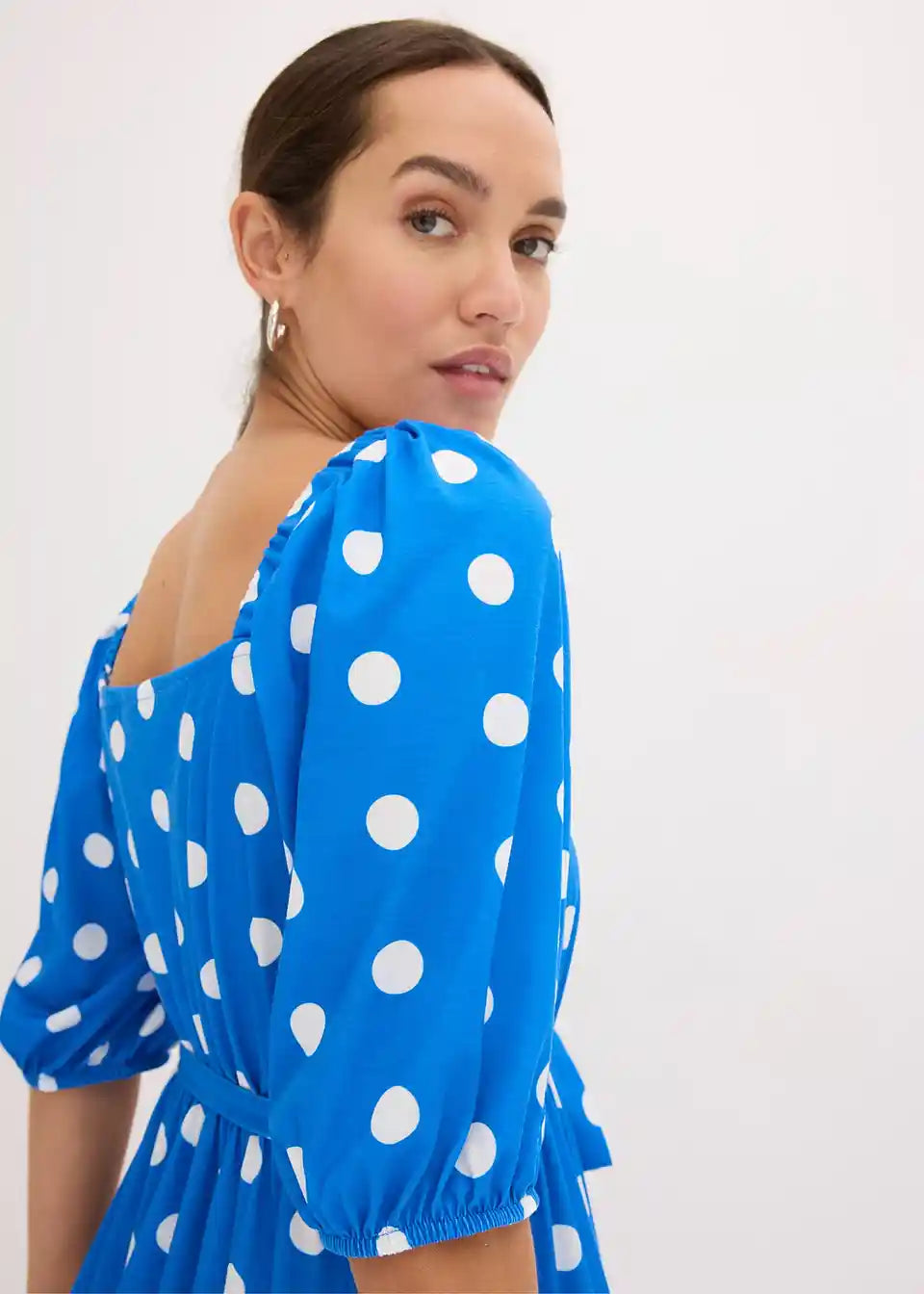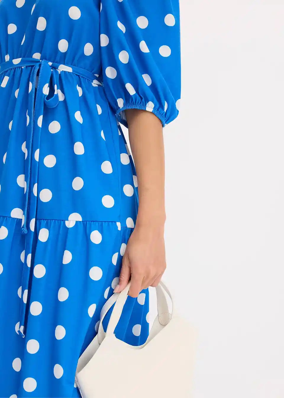 ženstvena midi jersey haljina s modernim točkastim printom.