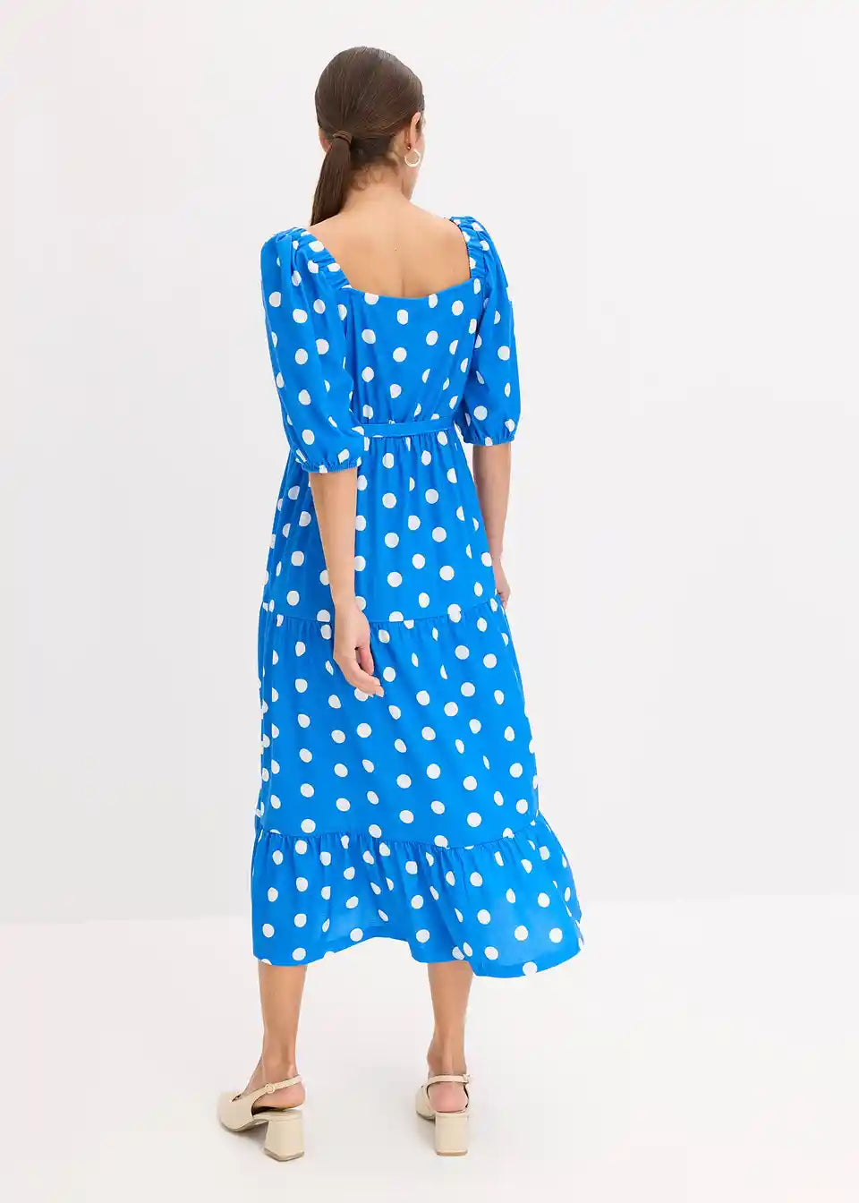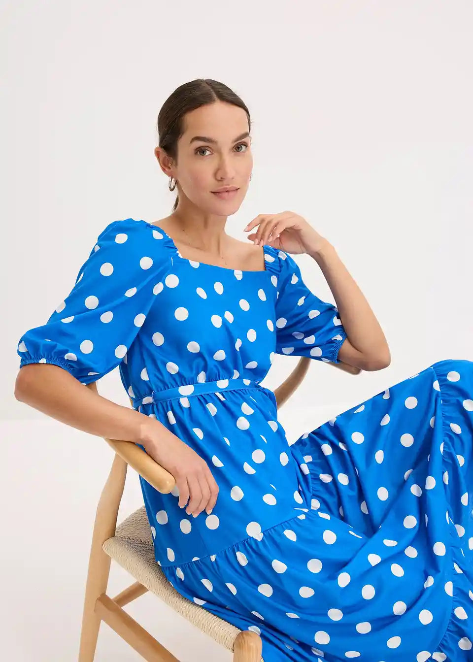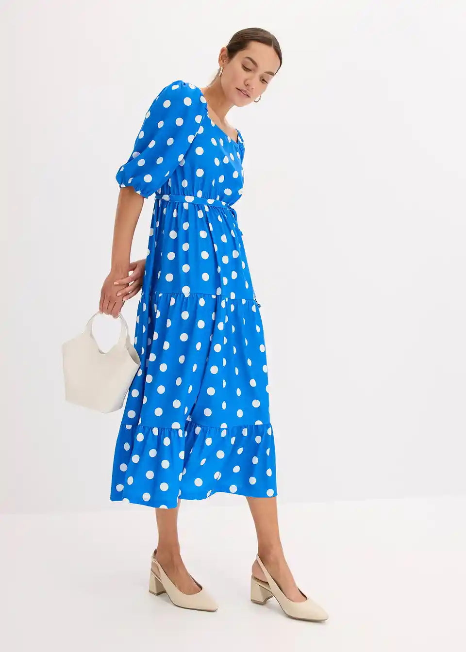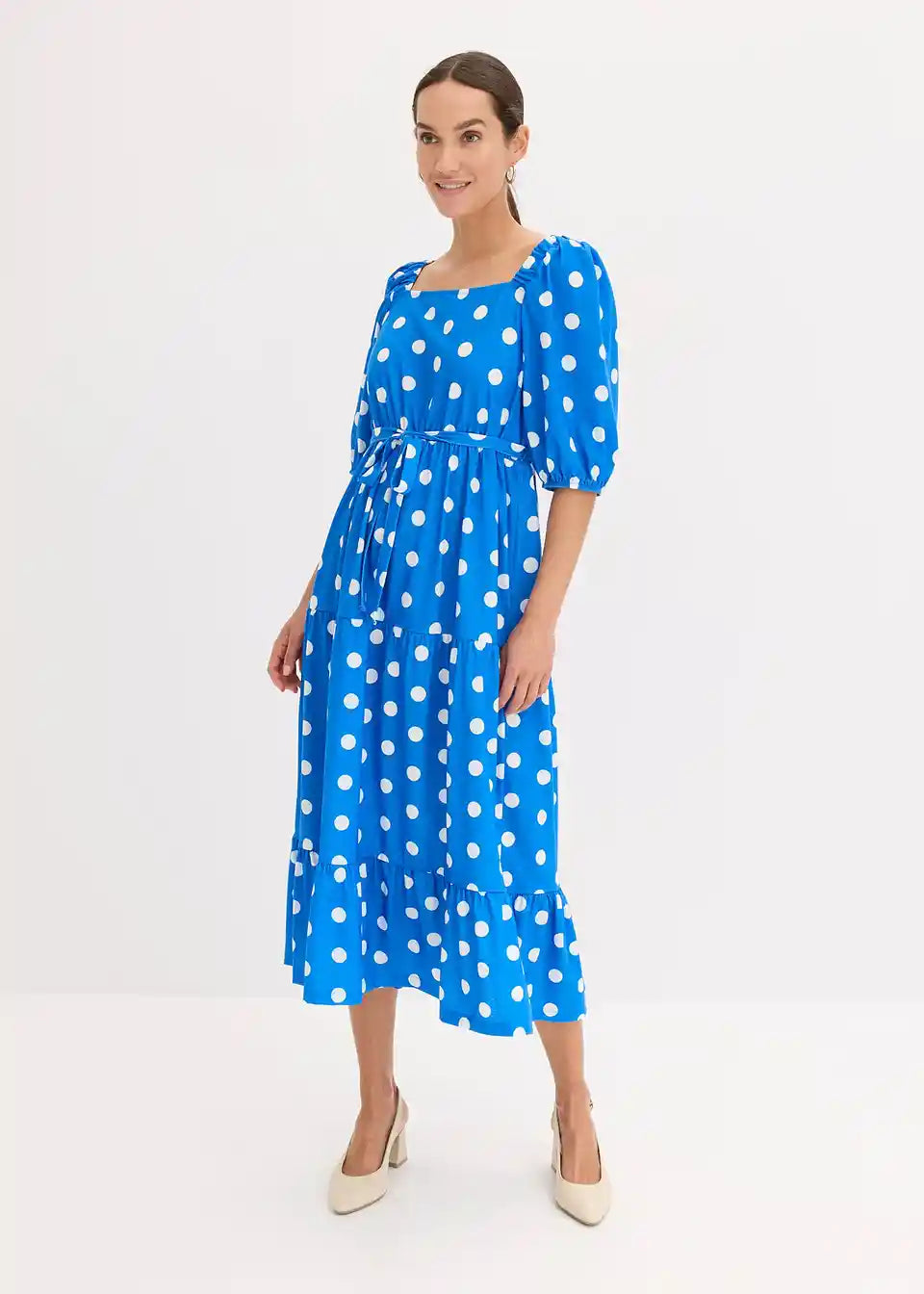 ženstvena midi jersey haljina s modernim točkastim printom.