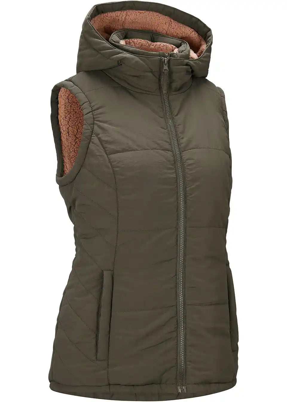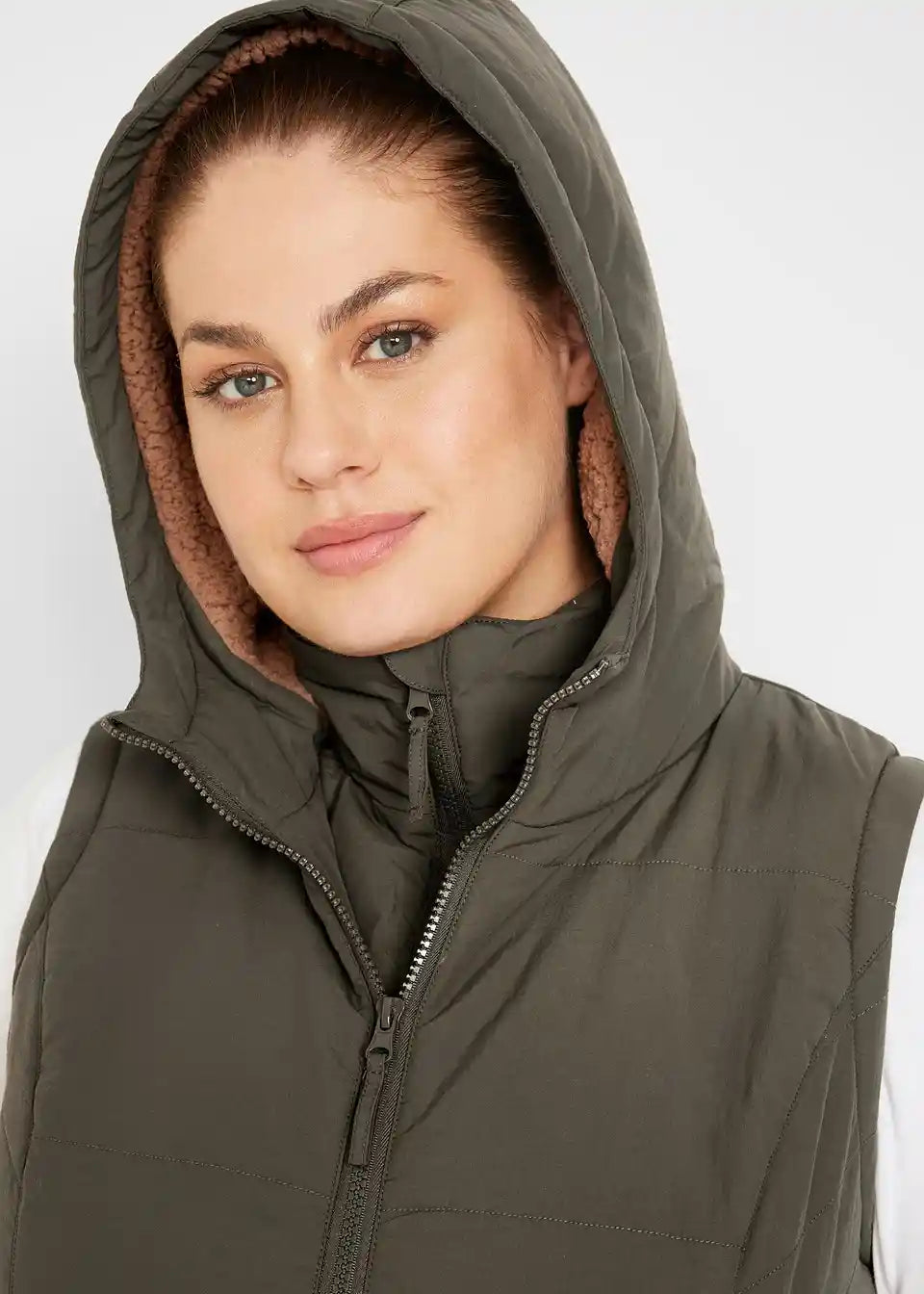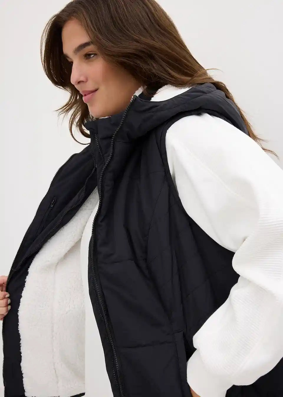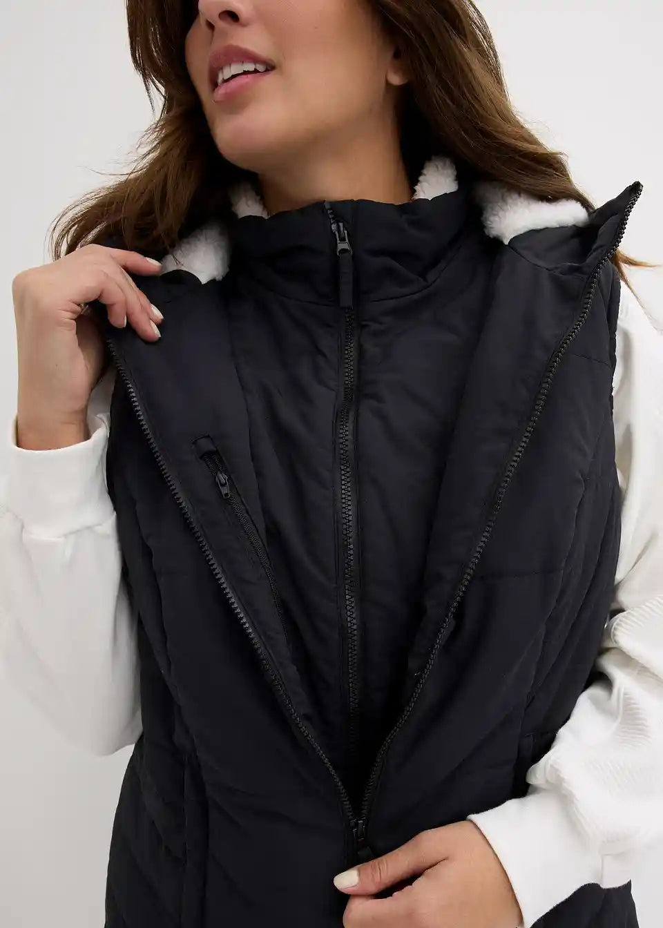 Prošiveni prsluk s teddy podstavom, bočni umetci, džepovi na zatvarač, unutarnji džep, dužina u vel. 42 cca. 74 cm.