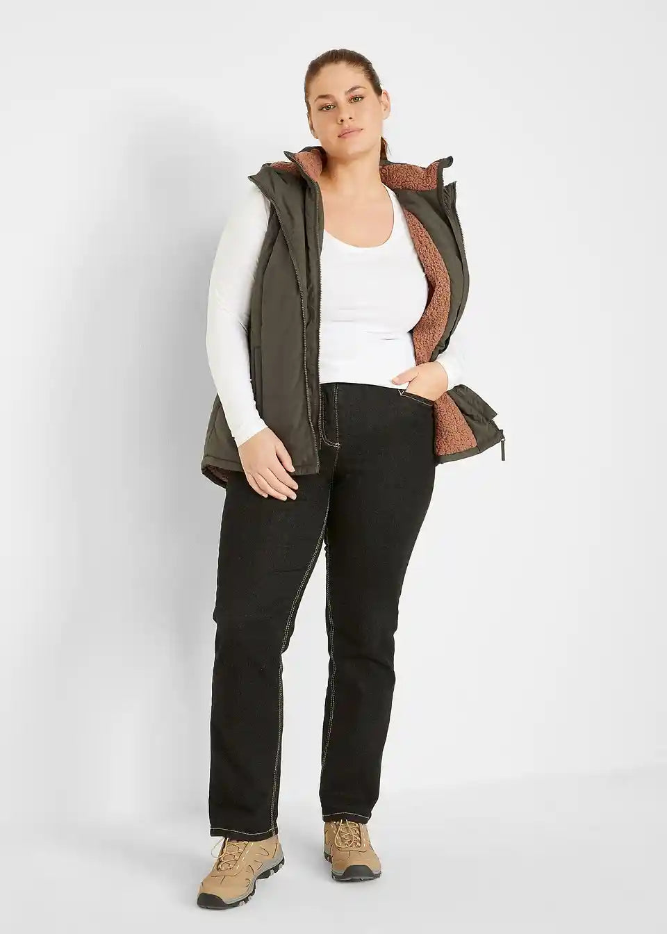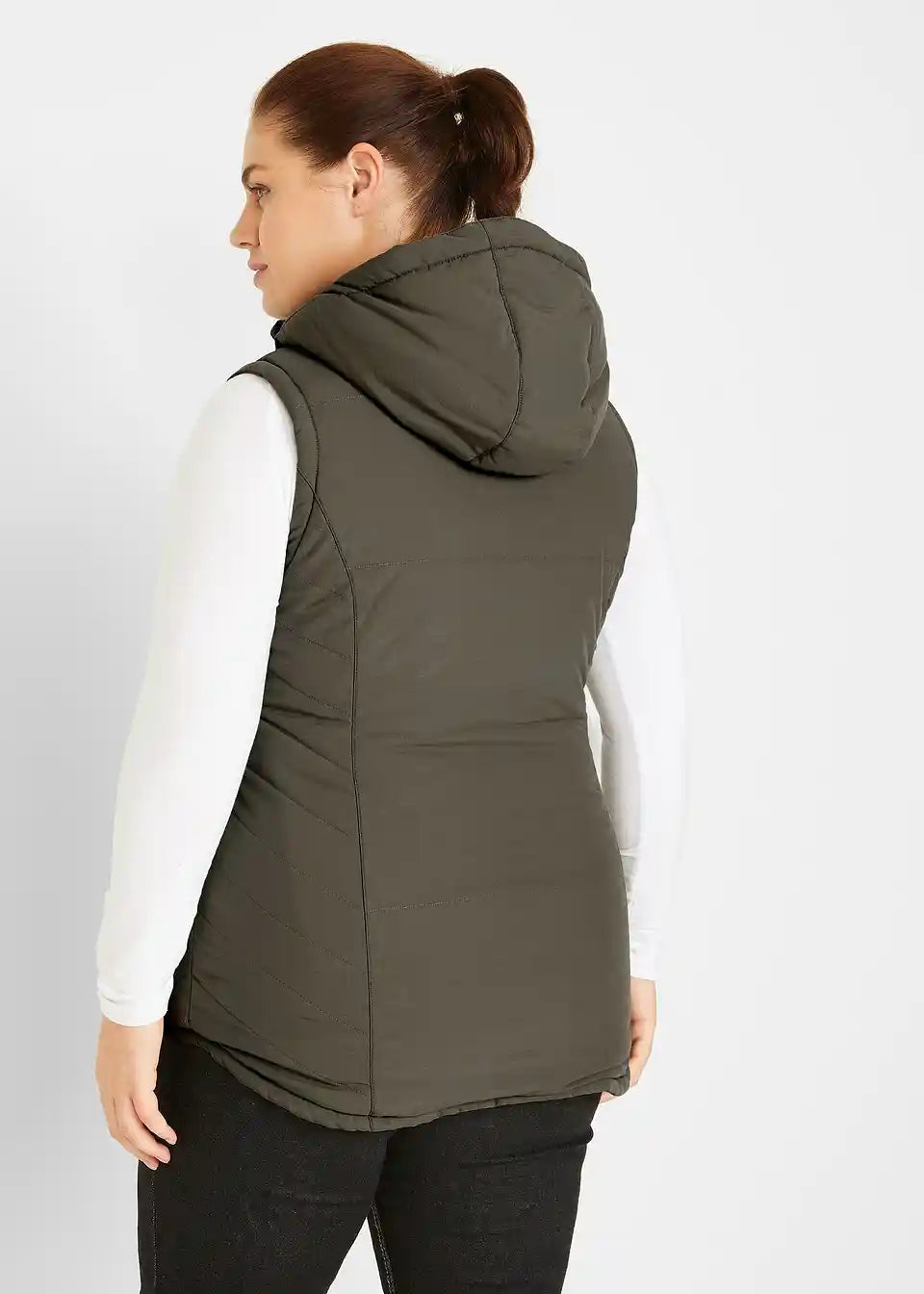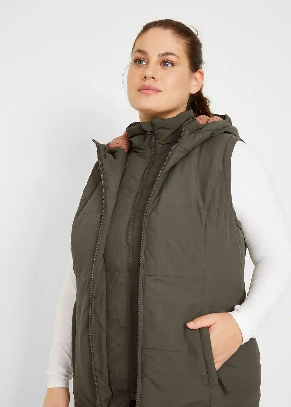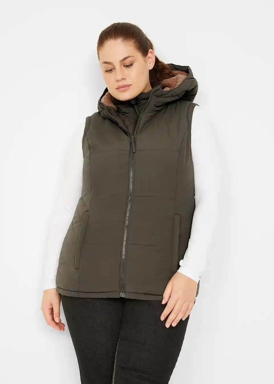 Prošiveni prsluk s teddy podstavom, bočni umetci, džepovi na zatvarač, unutarnji džep, dužina u vel. 42 cca. 74 cm.