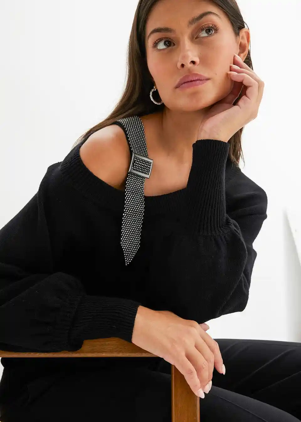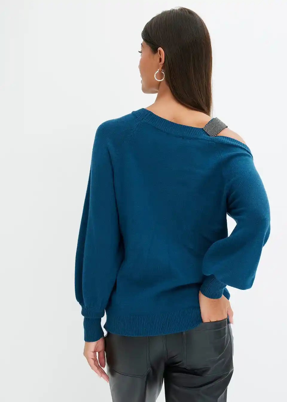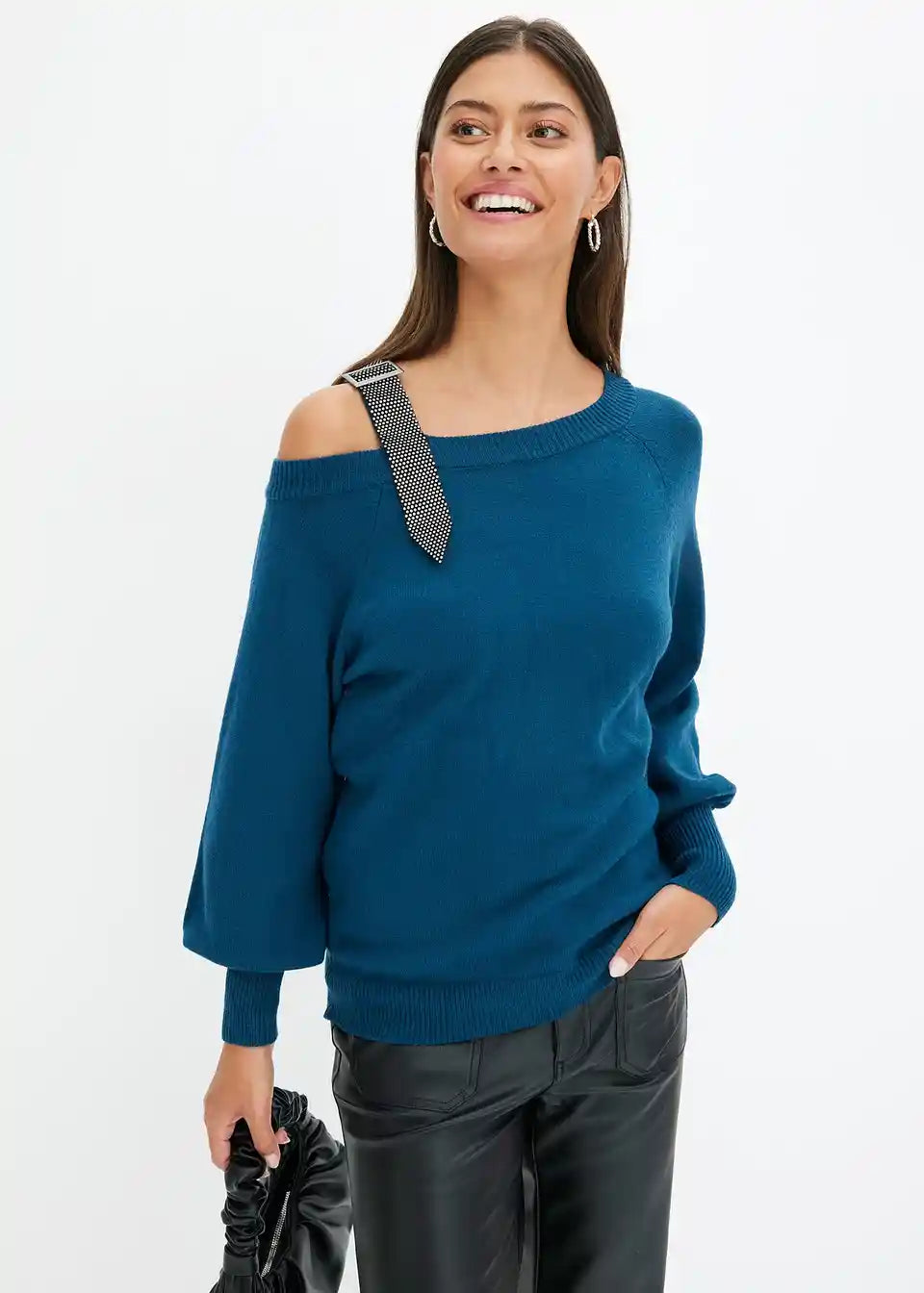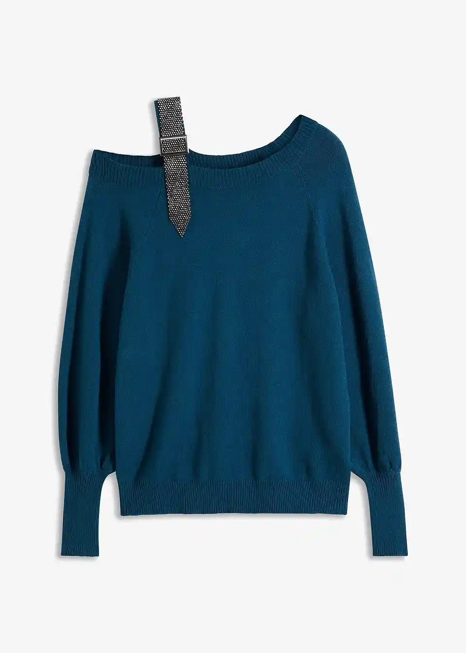 Pulover s otvorenim ramenom i sjajnim kamenčićima