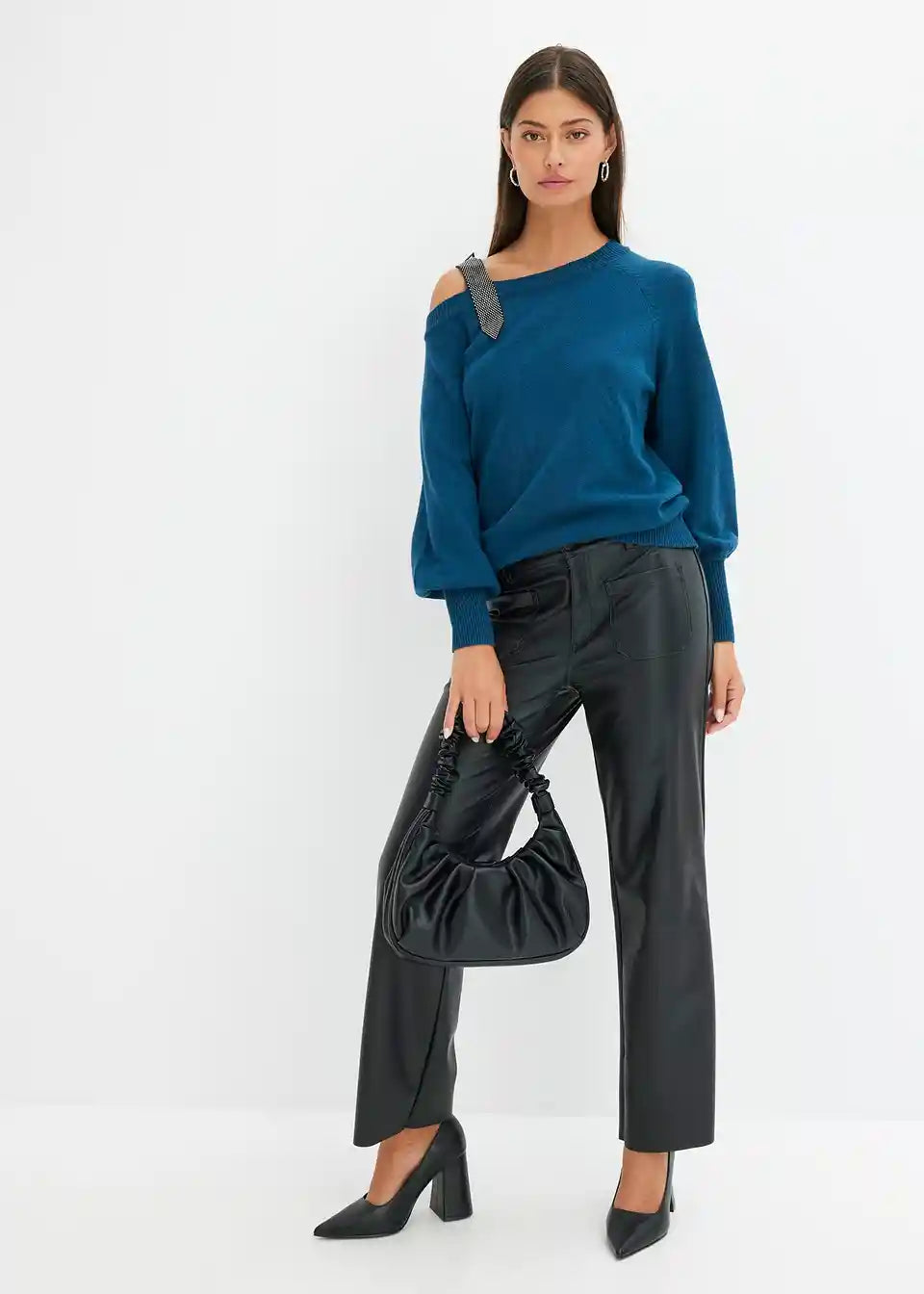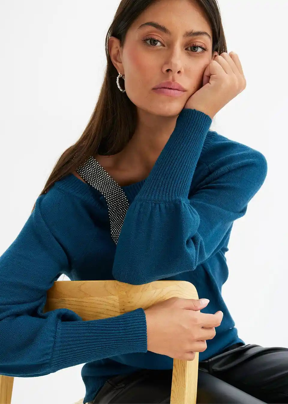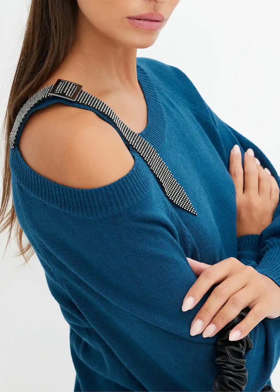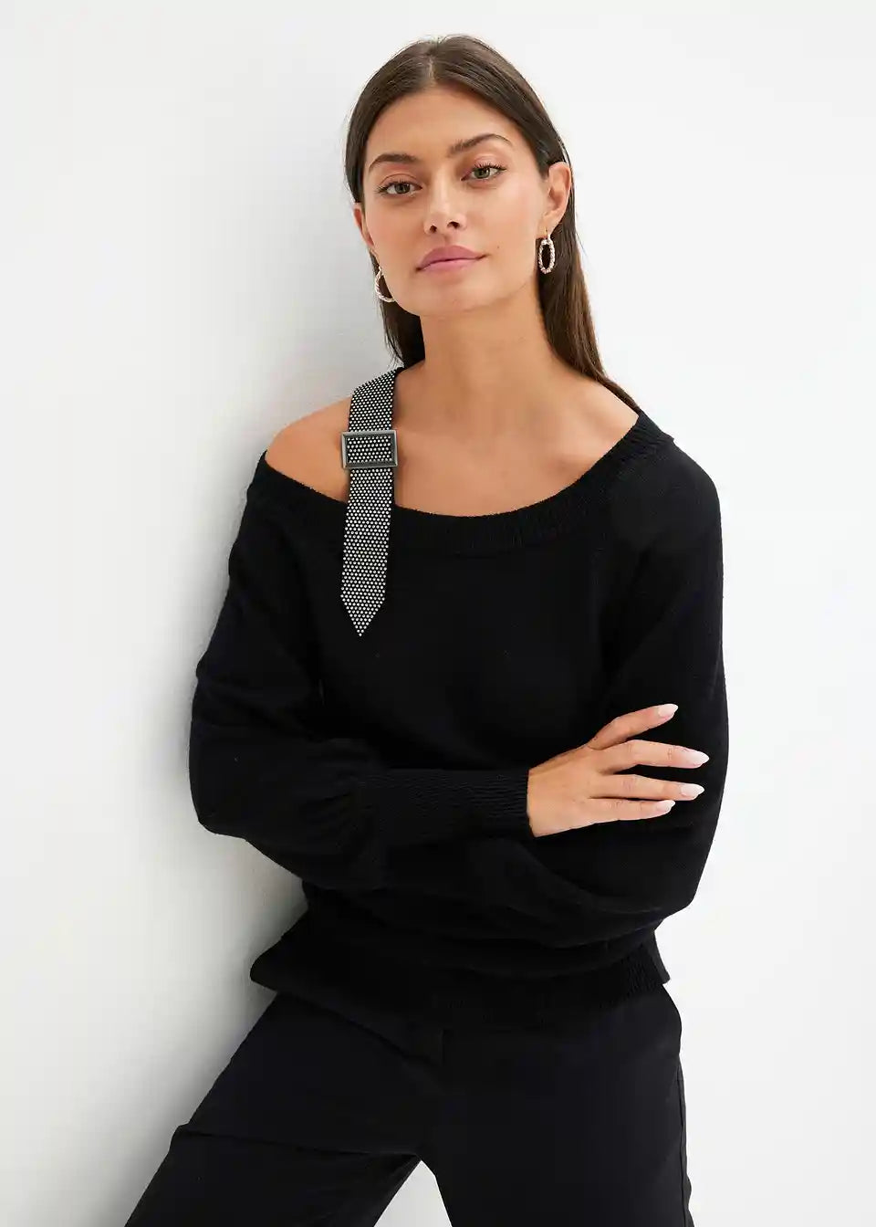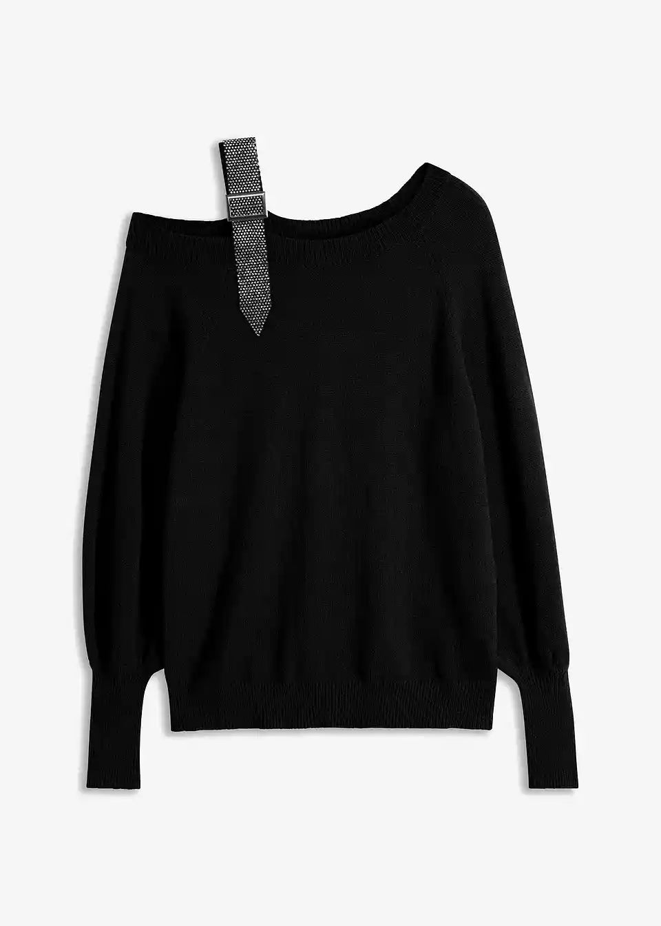 Pulover s otvorenim ramenom i sjajnim kamenčićima