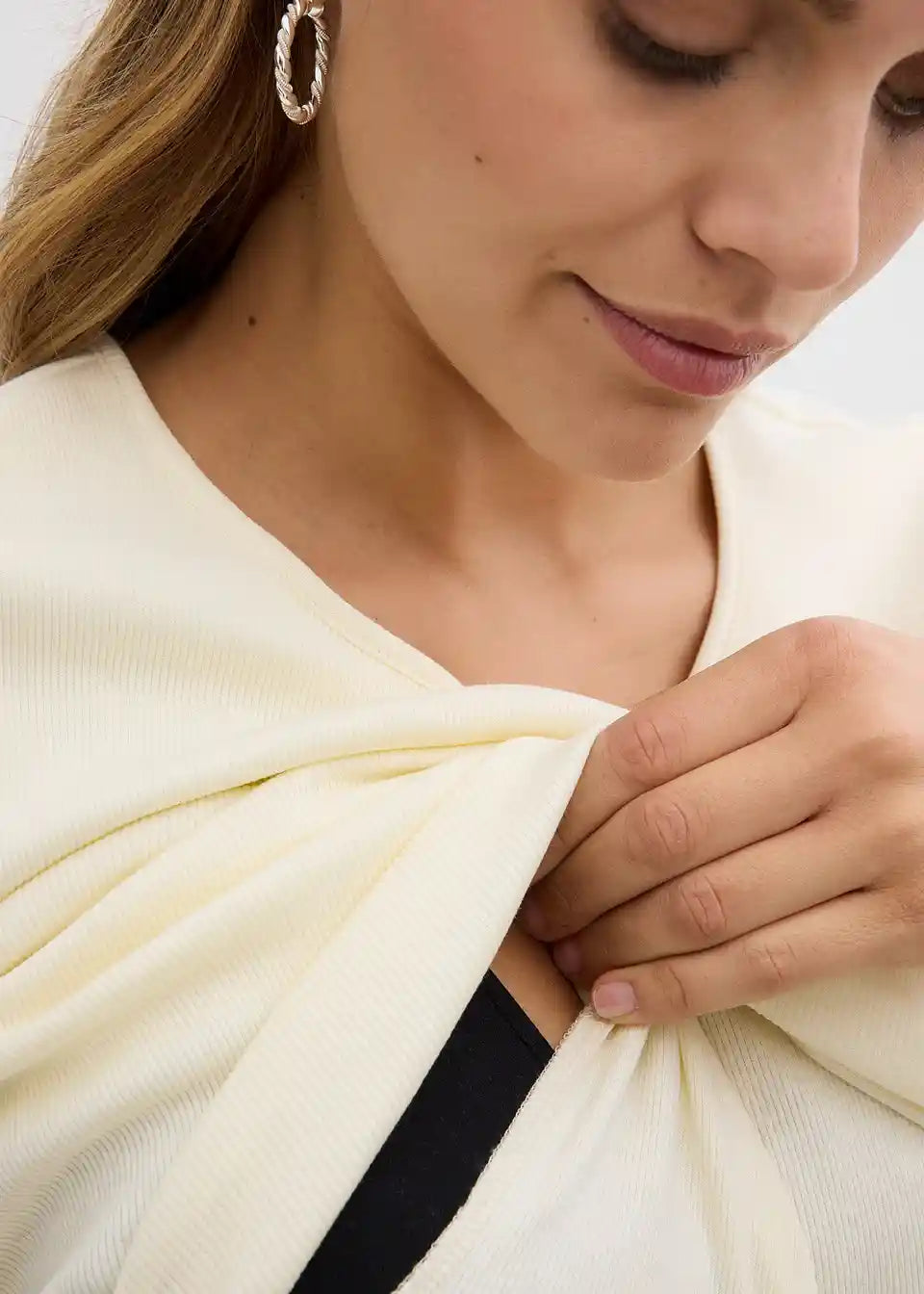Rebraste majice za trudnice od organskog pamuka u praktičnom dvostrukom pakiranju s okruglim izrezom i kratkim rukavima laskave dužine. Elastičan, mekan organski pamuk pruža ugodan osjećaj pri nošenju i savršeno se prilagođava rastućem trbuhu. Praktična funkcija dojenja kroz dizajn s dvostrukim slojevima pomaže u sprječavanju gubitka topline i omogućuje ugodno dojenje za majku i dijete.