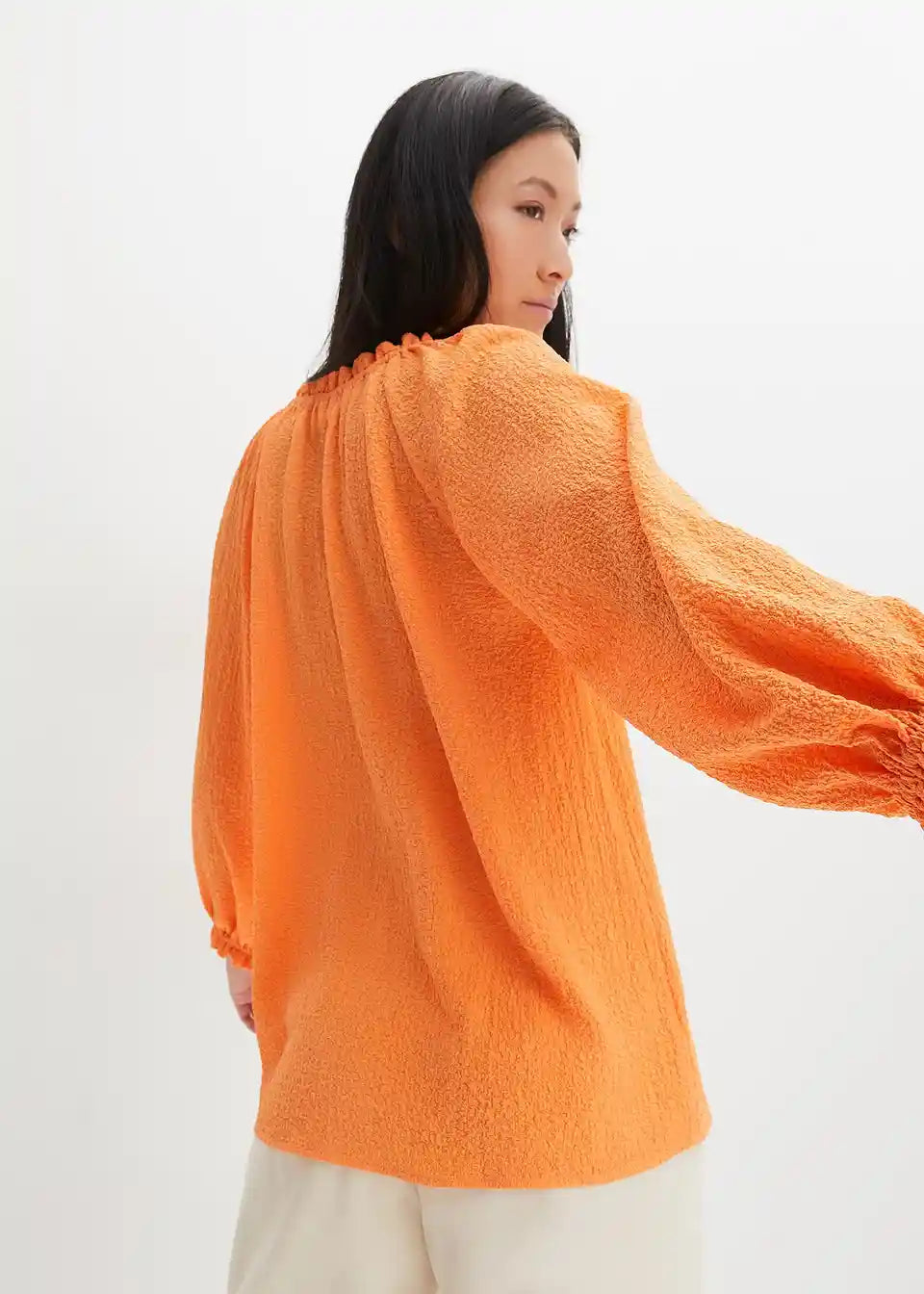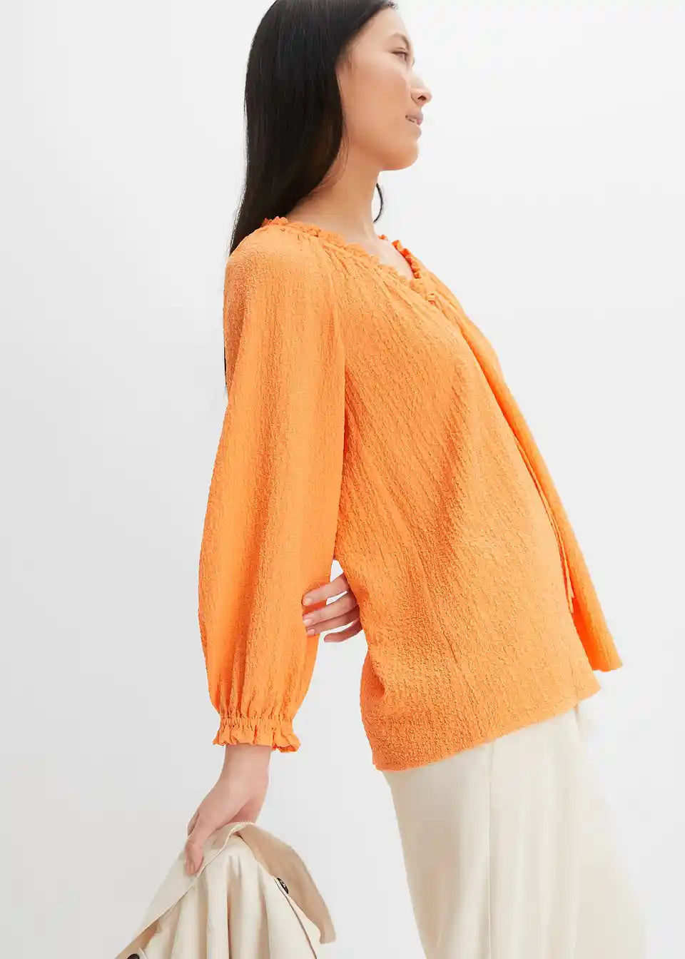 Široka strukturirana bluza s volanima prikriva problematične zone zahvaljujući A-kroju