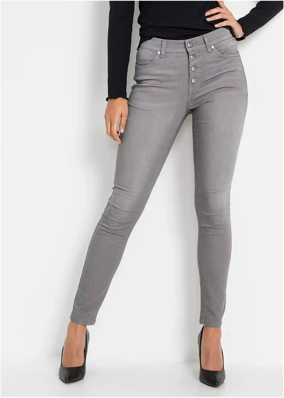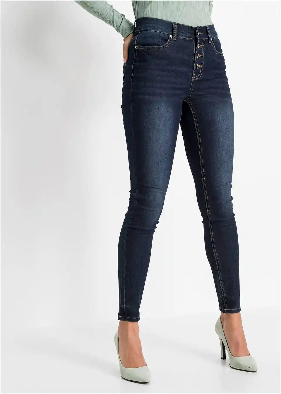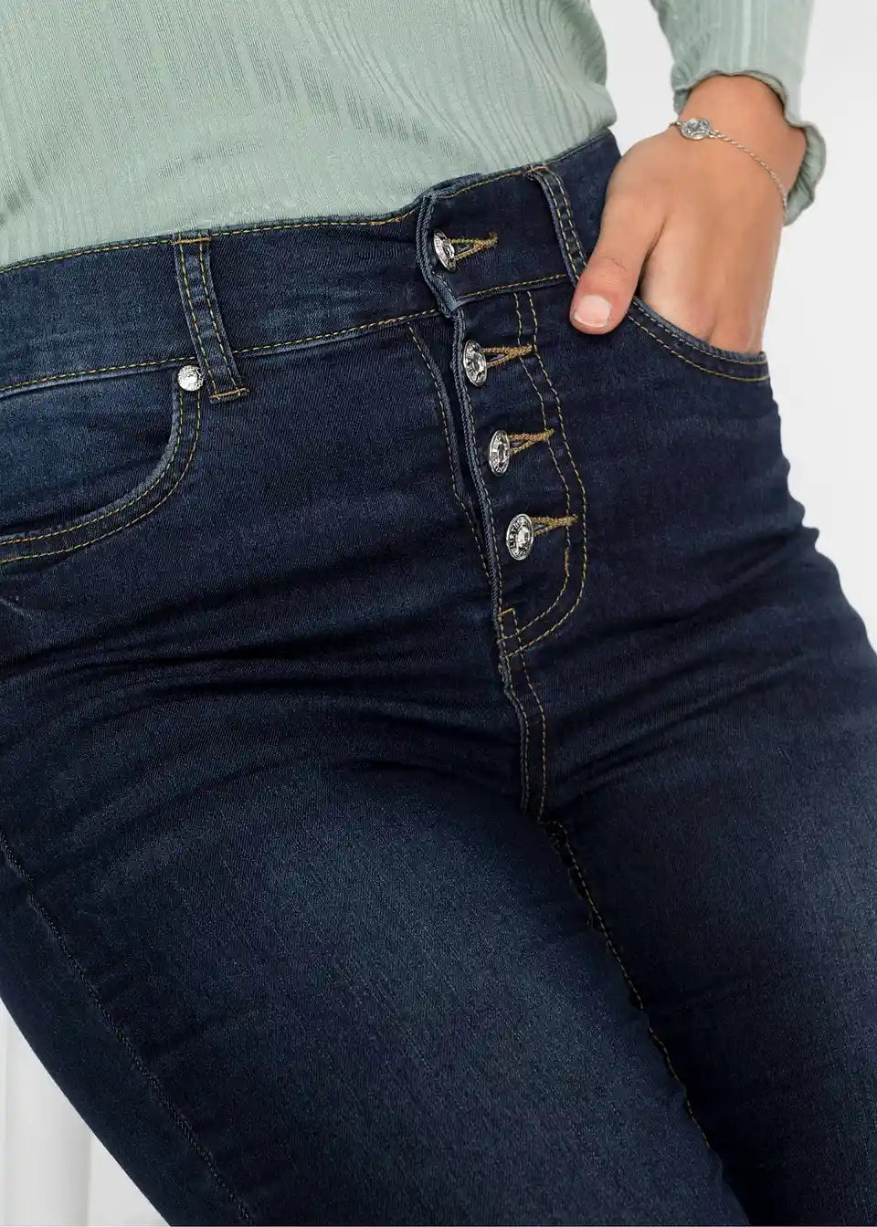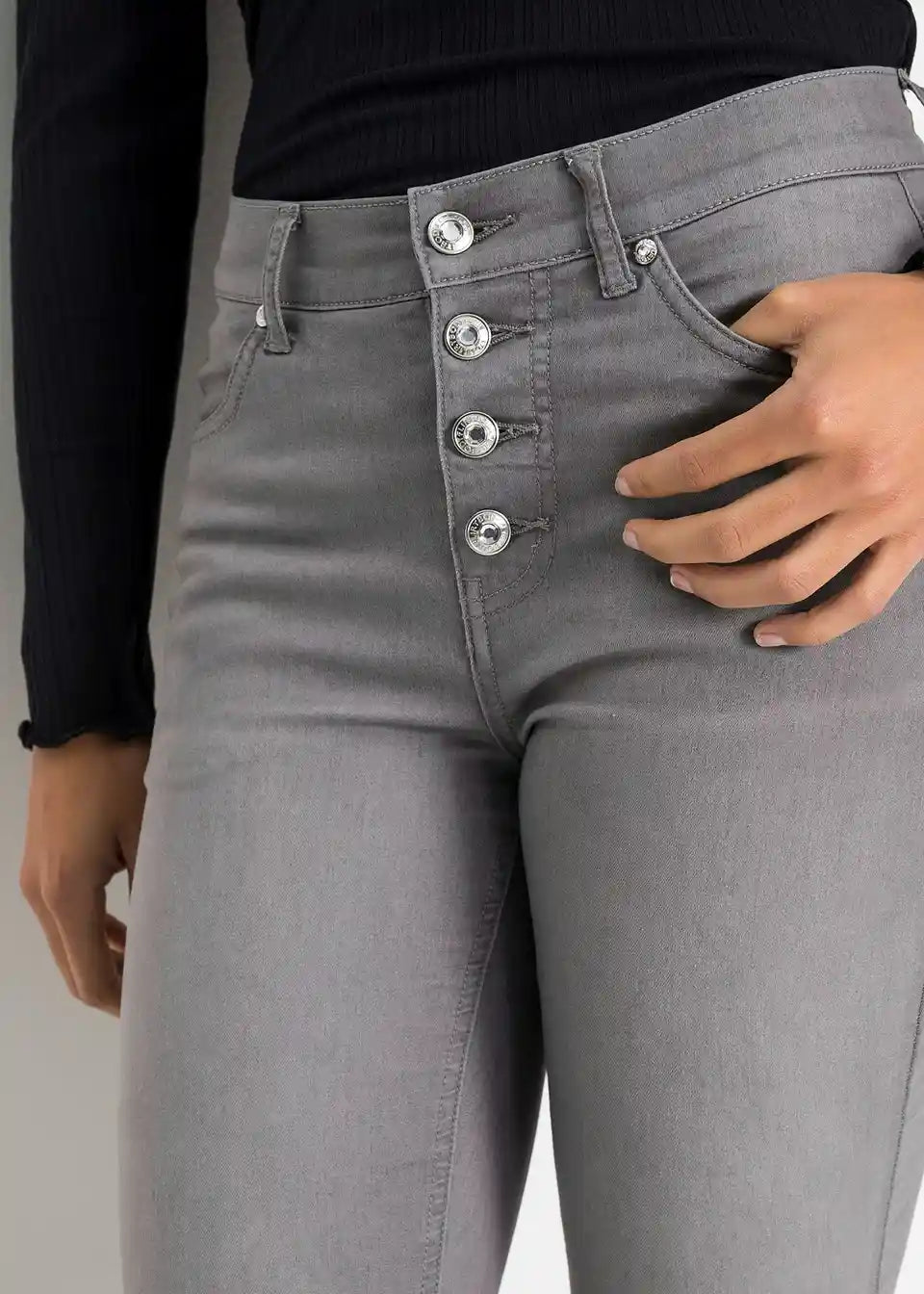 Stilne rastezljive traperice s dekorativnim redom gumba za zatvaranje.