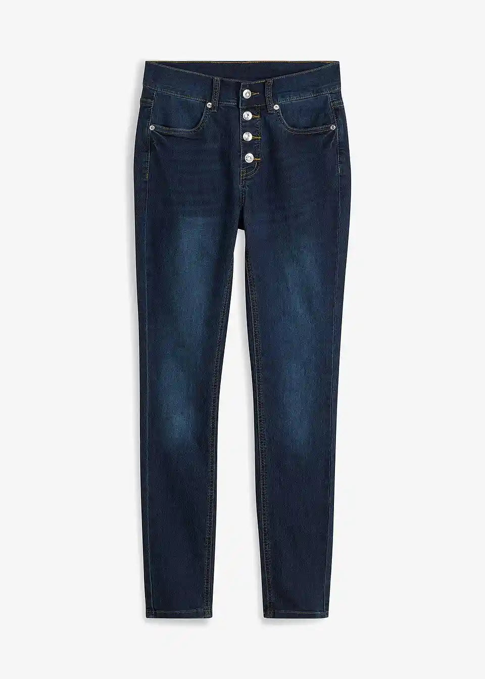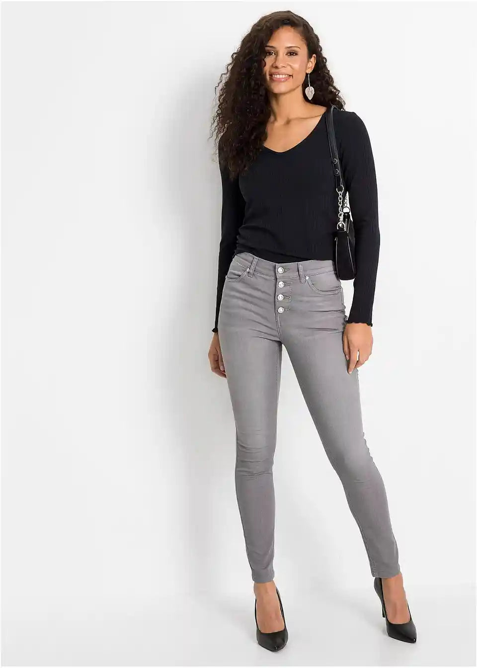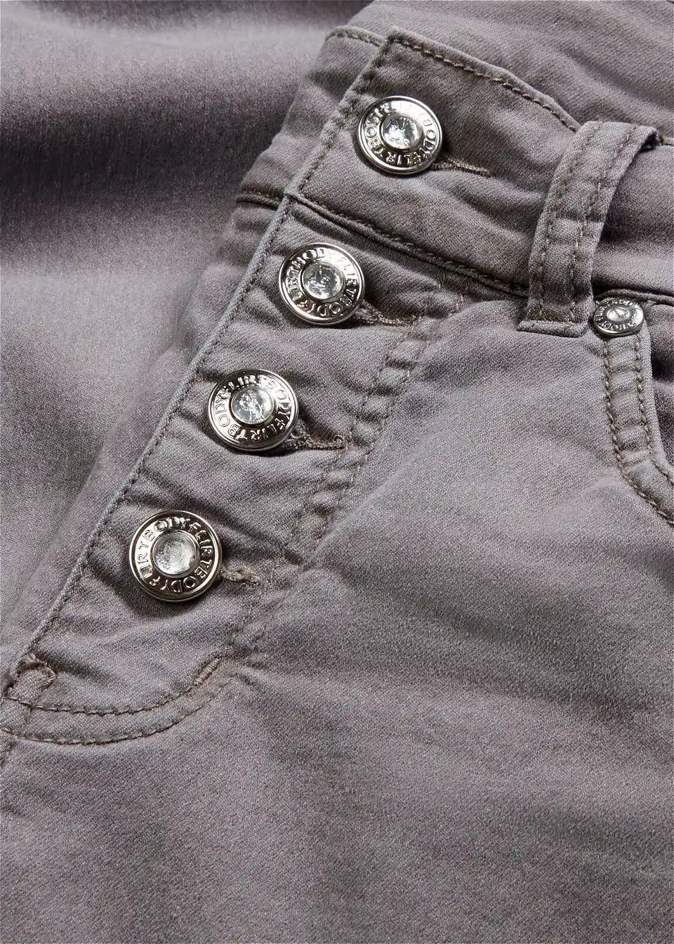 Stilne rastezljive traperice s dekorativnim redom gumba za zatvaranje.