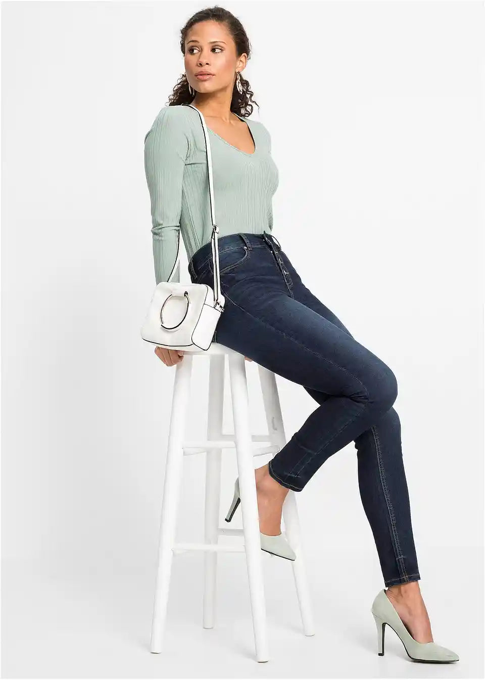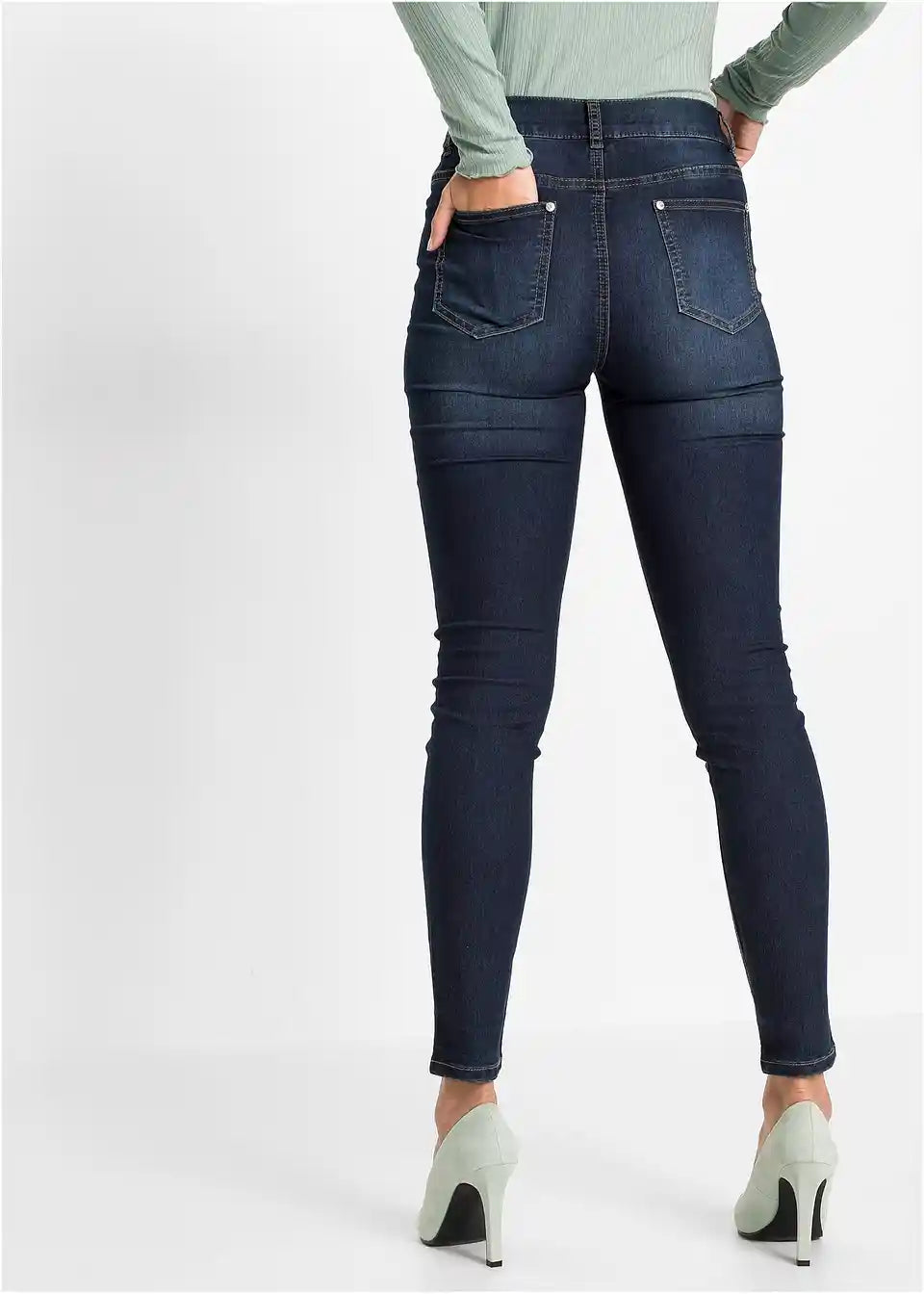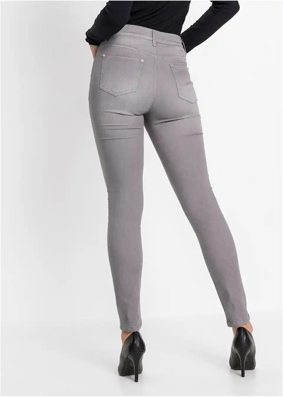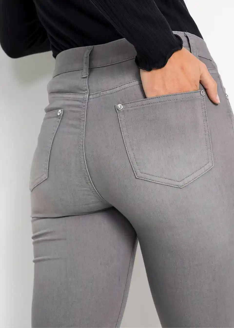 Stilne rastezljive traperice s dekorativnim redom gumba za zatvaranje.