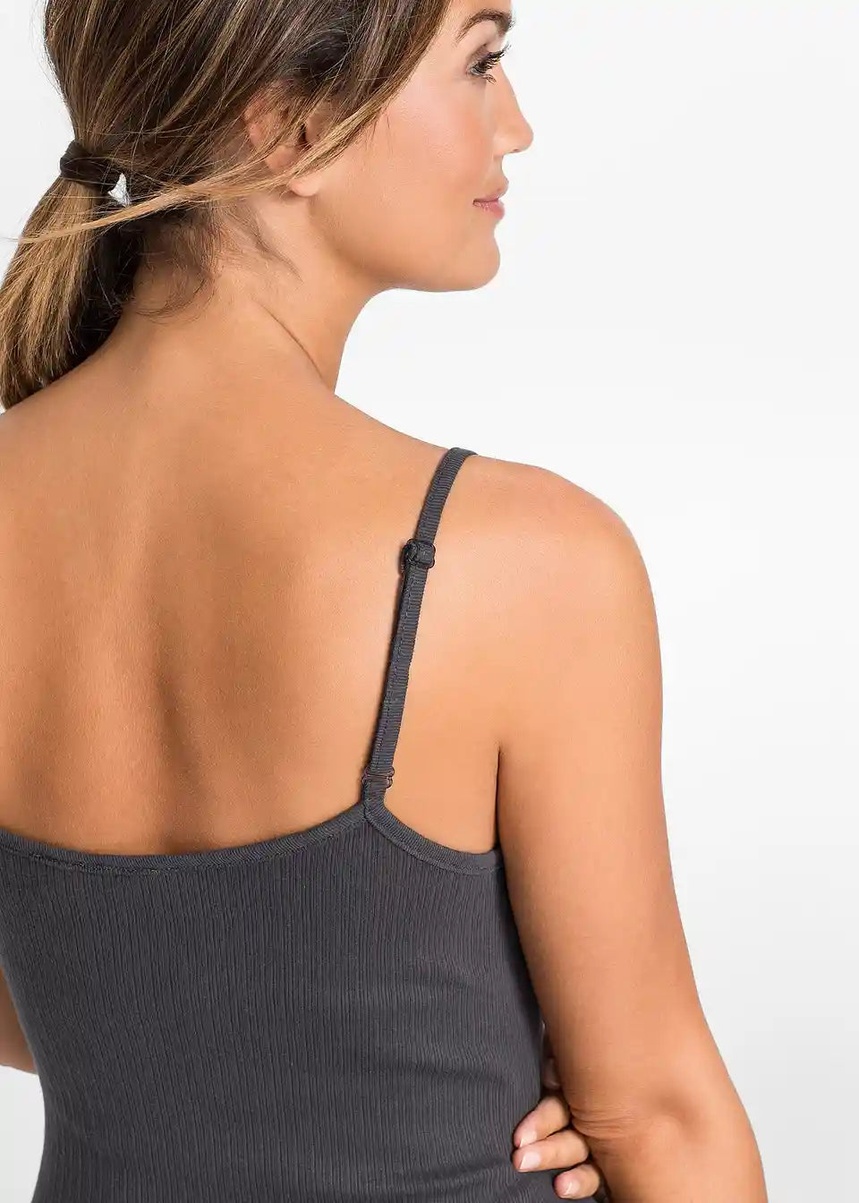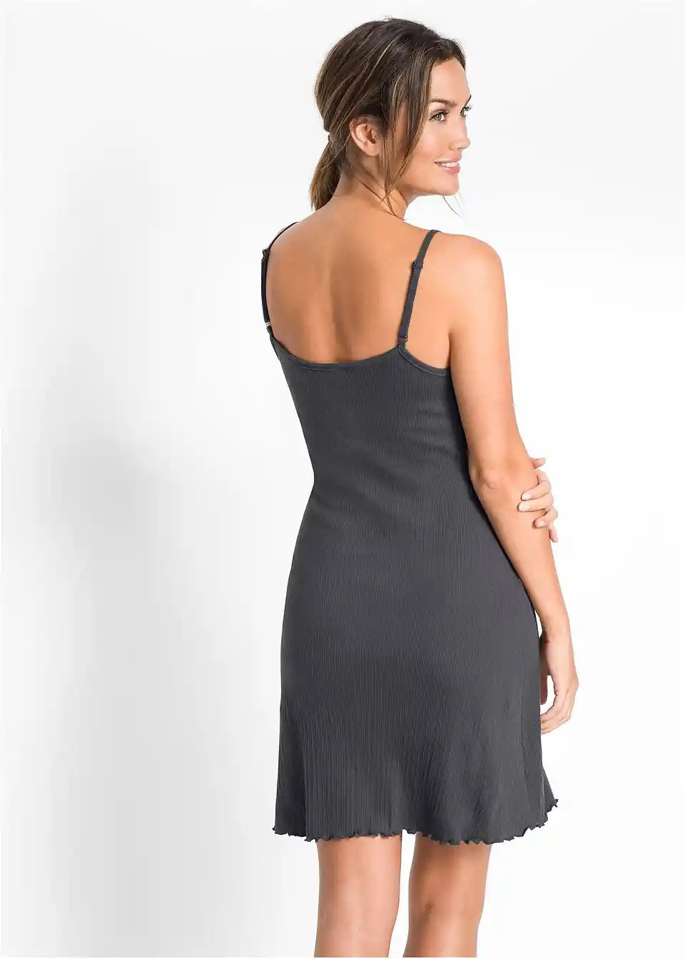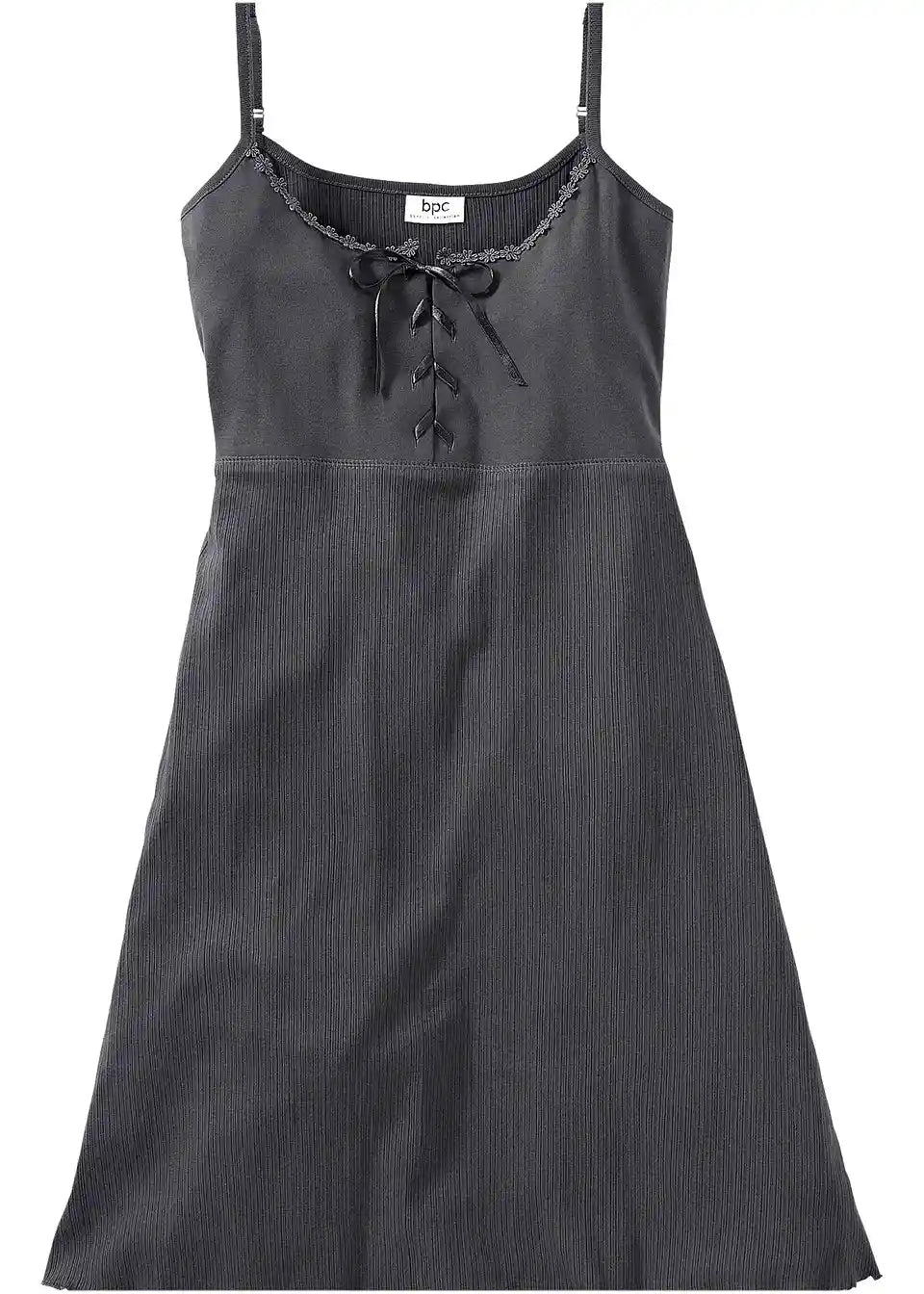 Lagano i zaista sofisticirano, ova udobna spavaćica iz aktualne kolekcije bpc-a je savršen odabir. Praktična spavaćica izrađena je od kože-prijateljskog rebrastog materijala i dolazi s podesivim spaghetti naramenicama. Slatki ukrasni rub s vezenim cvjetovima na izrezu i čipka na dekolteu naglašavaju moderan izgled kratke spavaćice.