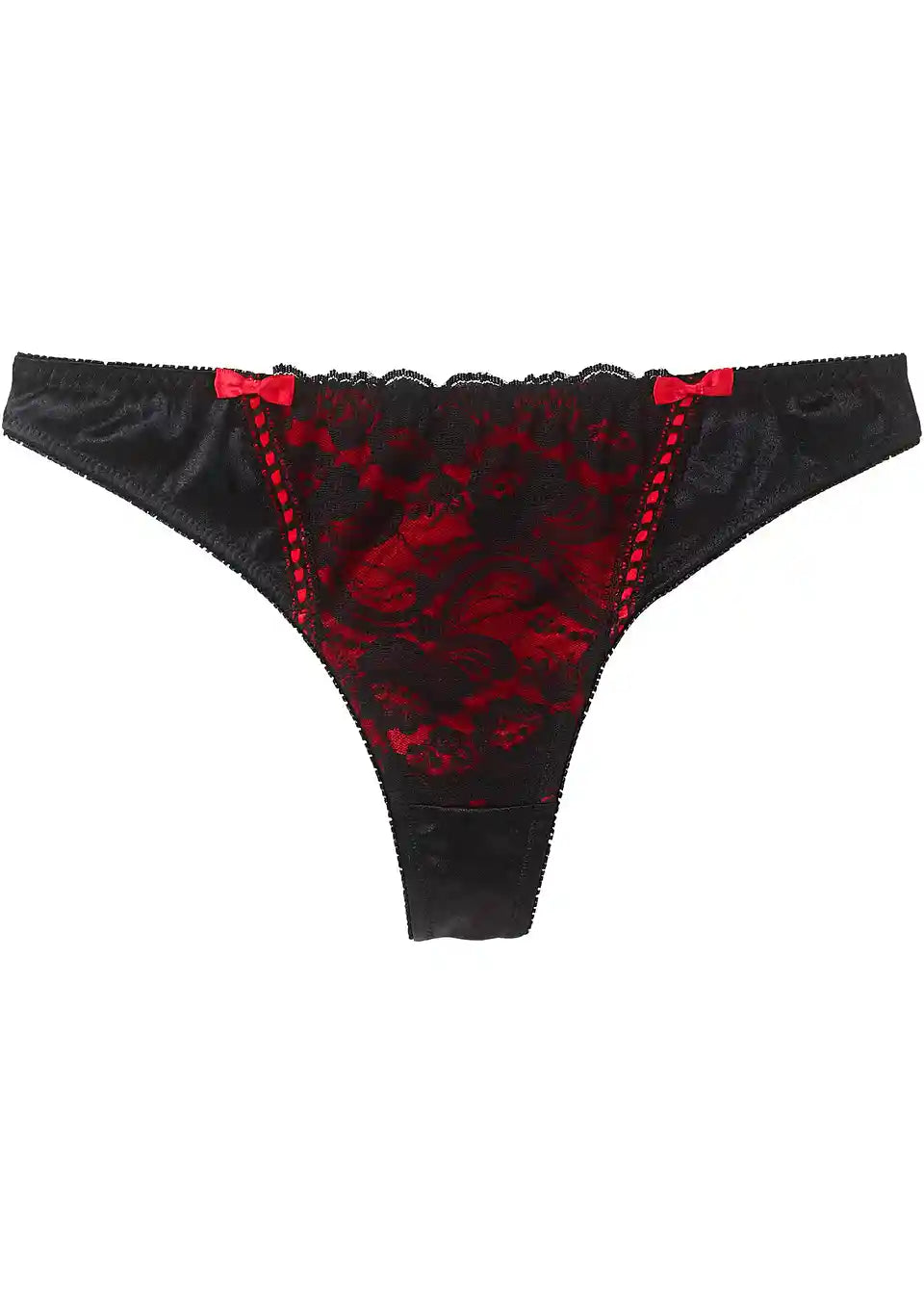 Zavođenje u seksi donjem rublju savršeno uspijeva s ovim sofisticiranim stringom. Uski kroj erotično naglašava ženske obline. Poluproziran prednji dio izrađen je od podložene čipke, dok je stražnji dio od jednostavnog, sjajnog materijala. Upečatljiv detalj na pojasu je mala mašnica u upadljivo kontrastnoj boji, koja naglašava privlačan karakter stringa.