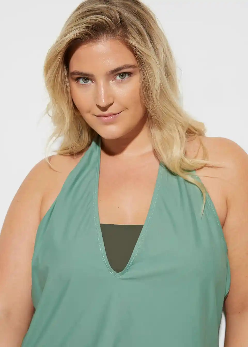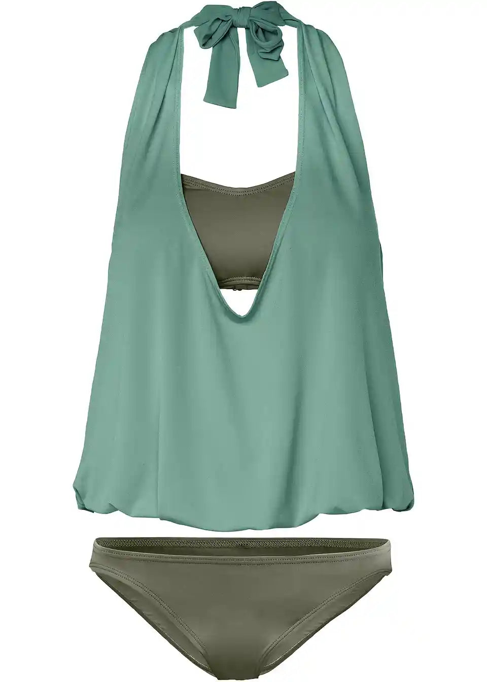 3-dijelni Tankini sastoji se od bustiera, tank-topa i bikini gaćica. Top šireg kroja s V-izrezom u obliku haltera. Bandeau-top s podstavom za grudi i uklonjivim softcups umetkom. Oko cijelog topa elastična traka ispod grudi. Obične bikini gaćice.