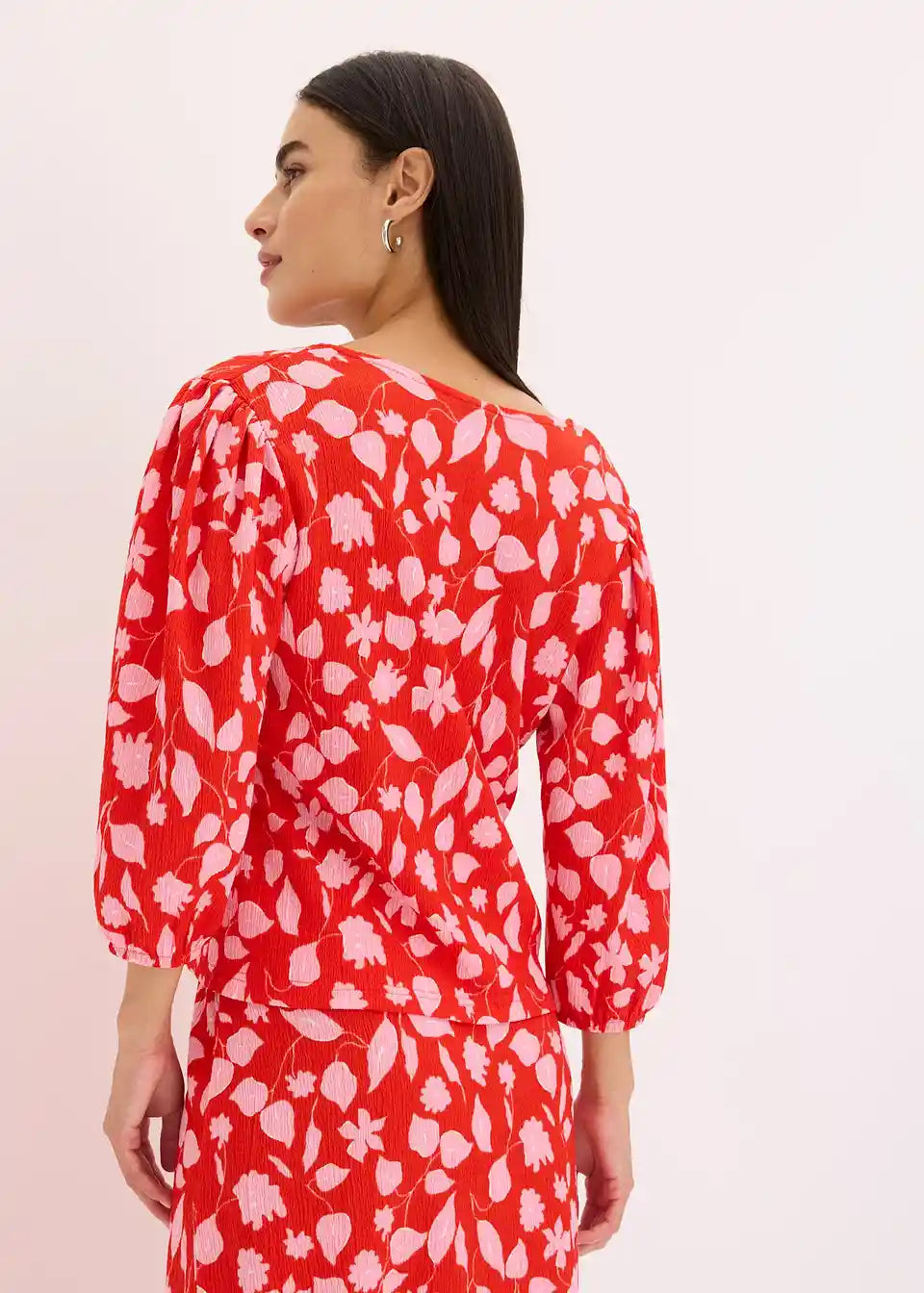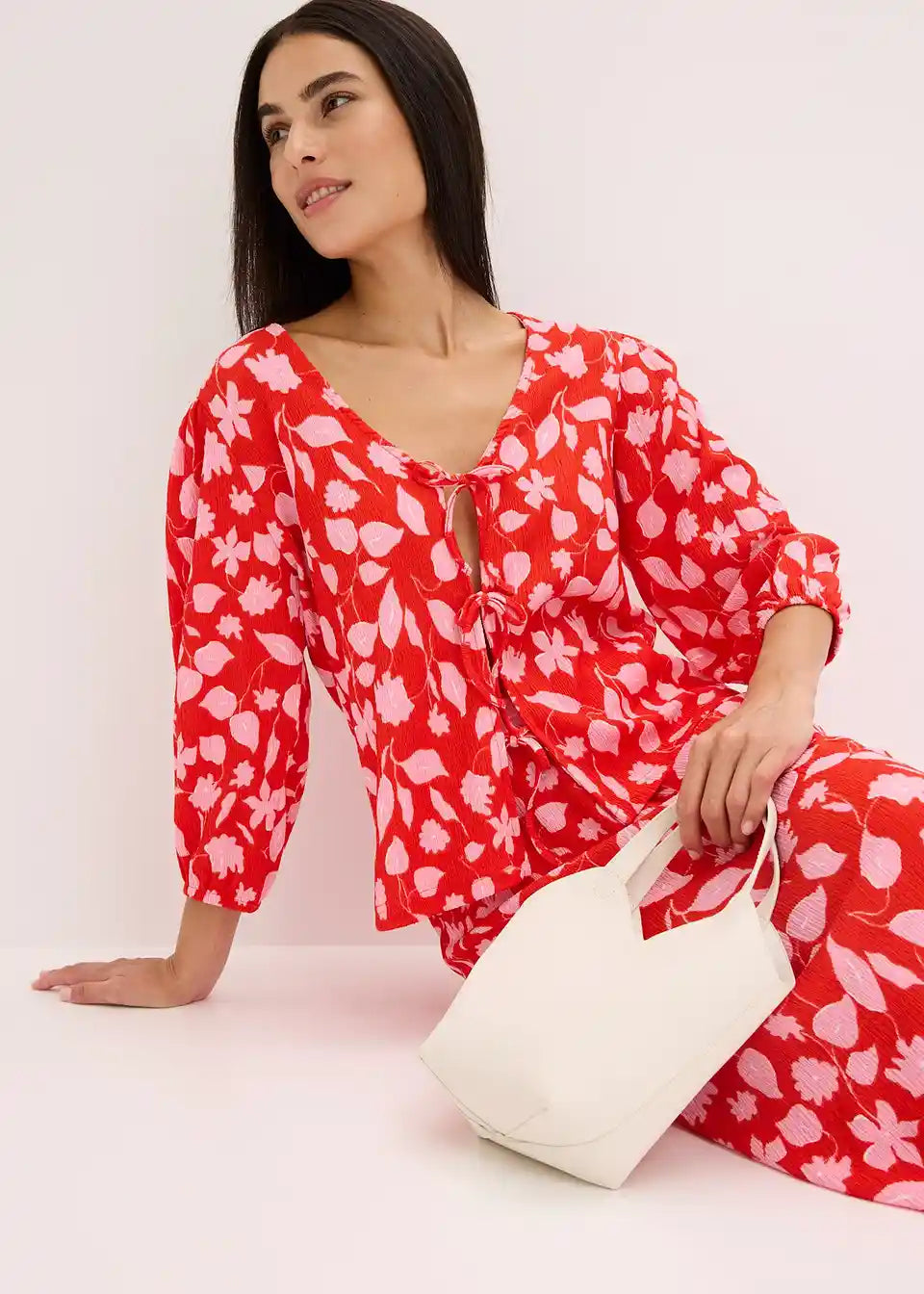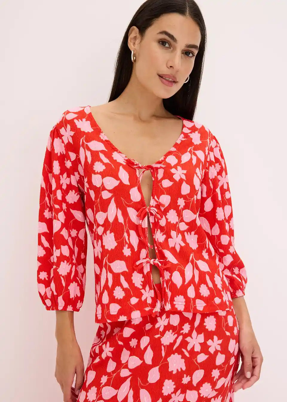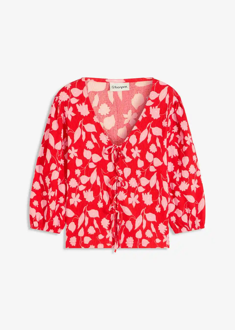 Majica s cvjetnim tiskom od strukturirane jersei tkanine s vezicama sprijeda