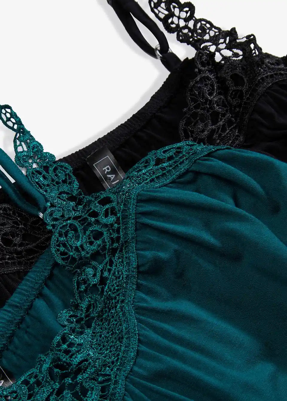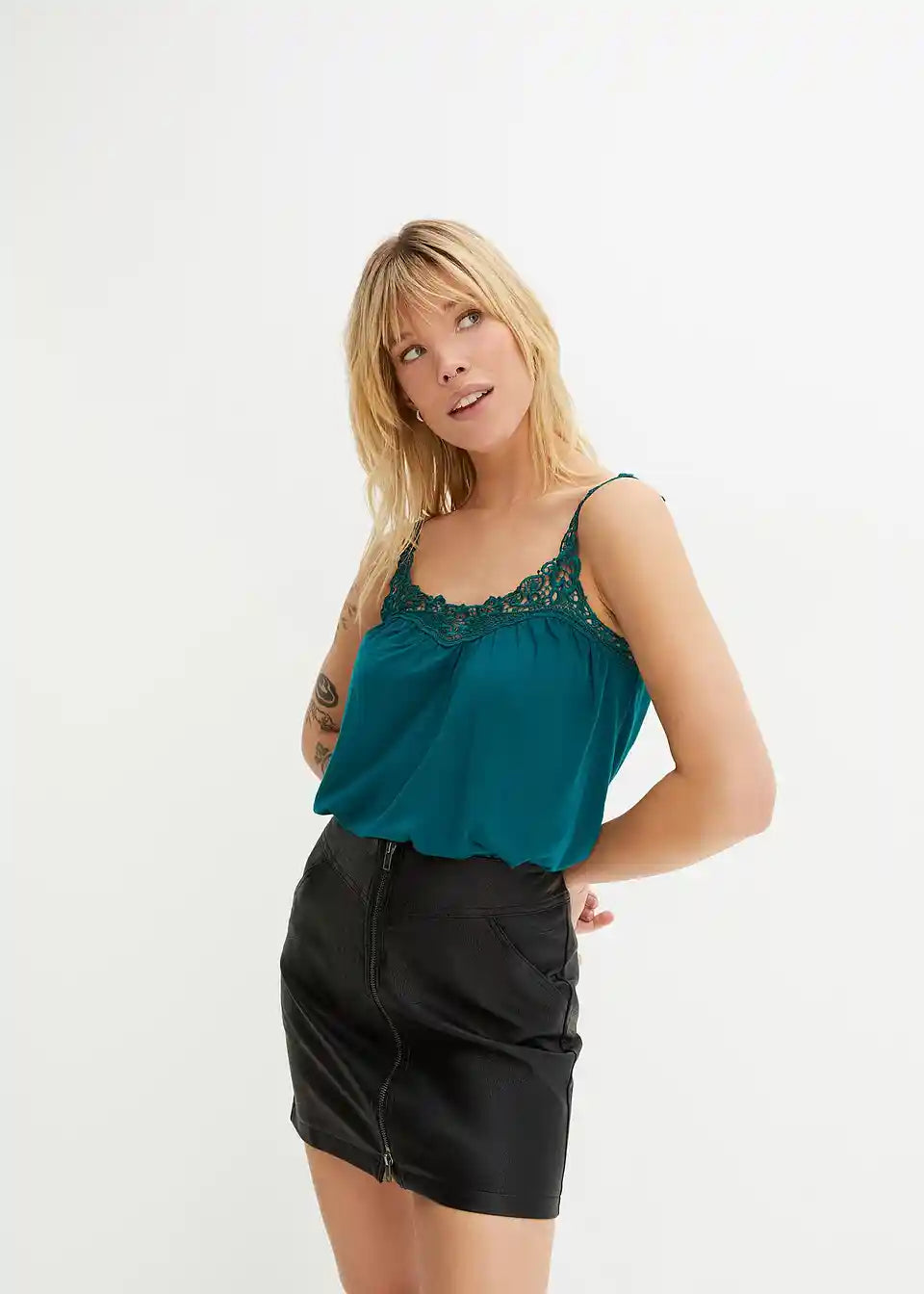 Elegantni čipkasti detalj ukrašava ovaj top na dekolteu u obliku srca, kao i uzduž prednje strane naramenica. Prozračan kroj laskavo pristaje figuri. U večernjim satima ovaj top u pakiranju od dva komada može se nositi s kožnim tajicama ili minicom. U hladnijim danima, rub čipke simpatično izviruje ispod toplog V-pulovera. Boyfriend traperice i kožna jakna daju moderan kontrast.