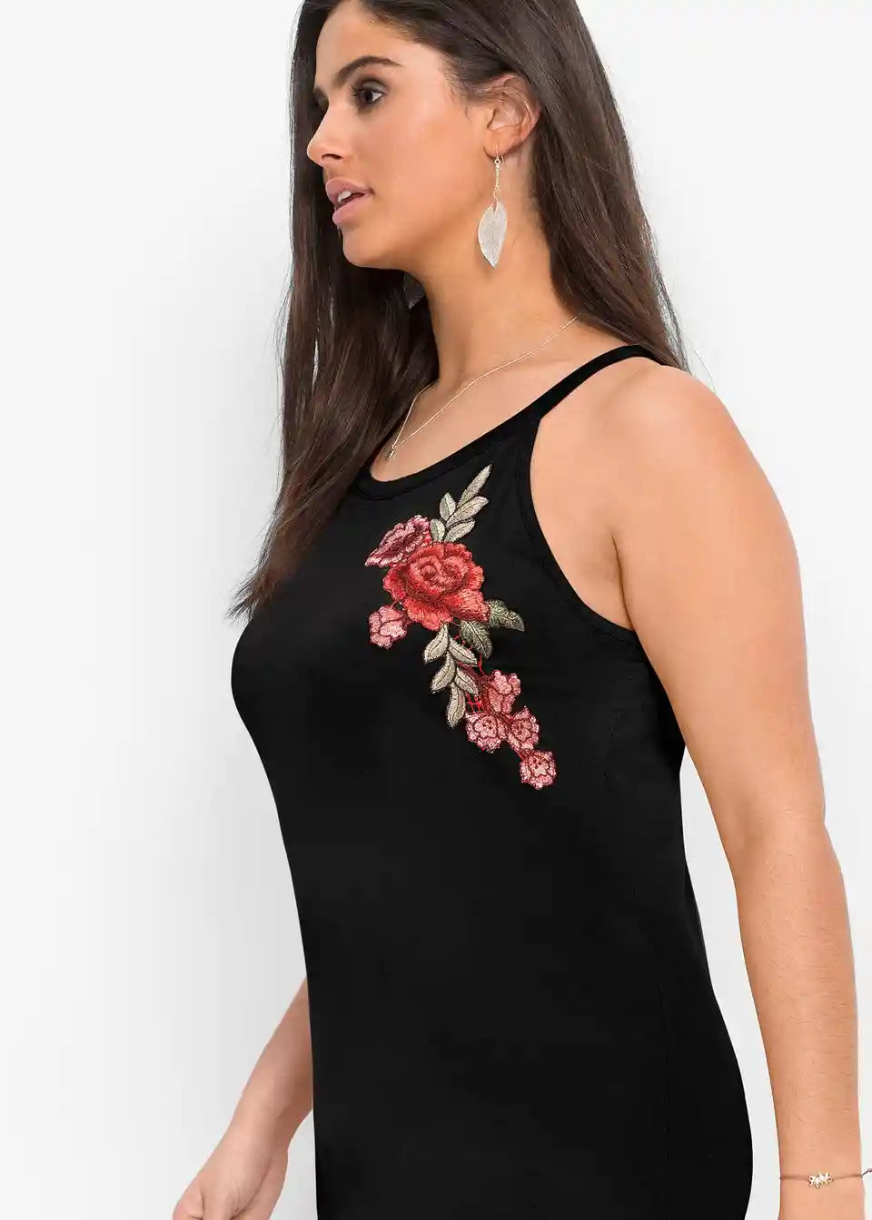 Top s vezom ističe se kao trendi modni komad koji ne smije nedostajati u ormaru ove sezone. Zahvaljujući kroju bez rukava, model atraktivno naglašava ramena i leđa. Poseban detalj je cvjetni vez sprijeda. Na stražnjoj strani, top marke BODYFLIRT otkriva svoj šarm uz lijepi izrez i mali gumb za kopčanje. Zahvaljujući elastičnoj traci u porubu, ovaj top duljine do bokova nježno prati oblik tijela. U kombinaciji s trapericama-šorcem i sandalama, stvara moderan dnevni look.