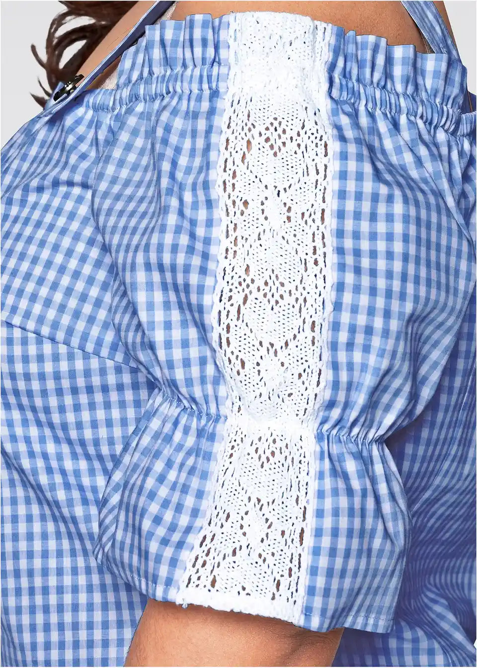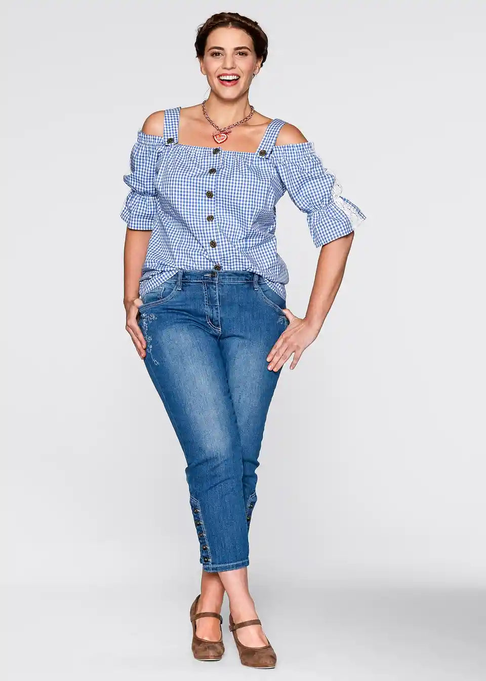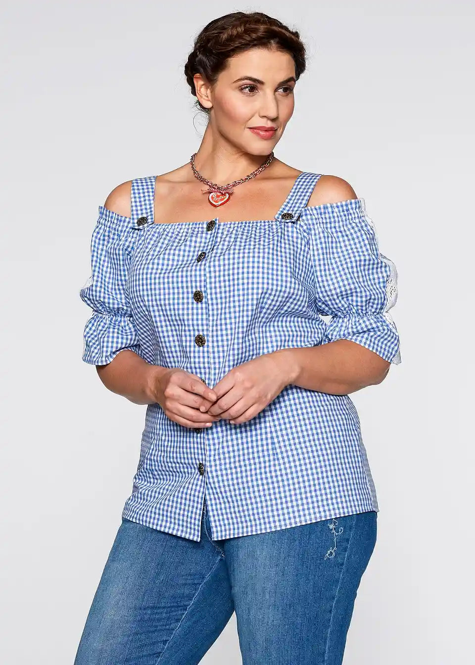 S ovom prekrasnom tradicionalnom bluzom od bpc-a bit ćete odlično odjeveni ne samo za Oktoberfest. Bluza s poludugim rukavima i gumbima impresionira razrađenim dizajnom rukava: zahvaljujući elastičnim umetnim dijelovima, stvoreni su karakteristični puf rukavi. Na bočnim stranama rukavi su ukrašeni čipkom. Široke naramenice mogu se podesiti duljinom kako bi se osigurala odgovarajuća podrška. Carmen izrez ističe ramena i dekolte. Stražnji šavovi u području grudi i struka oblikuju lijepu figuru. Tradicionalna karirana bluza može se savršeno kombinirati s odgovarajućim tradicionalnim hlačama.