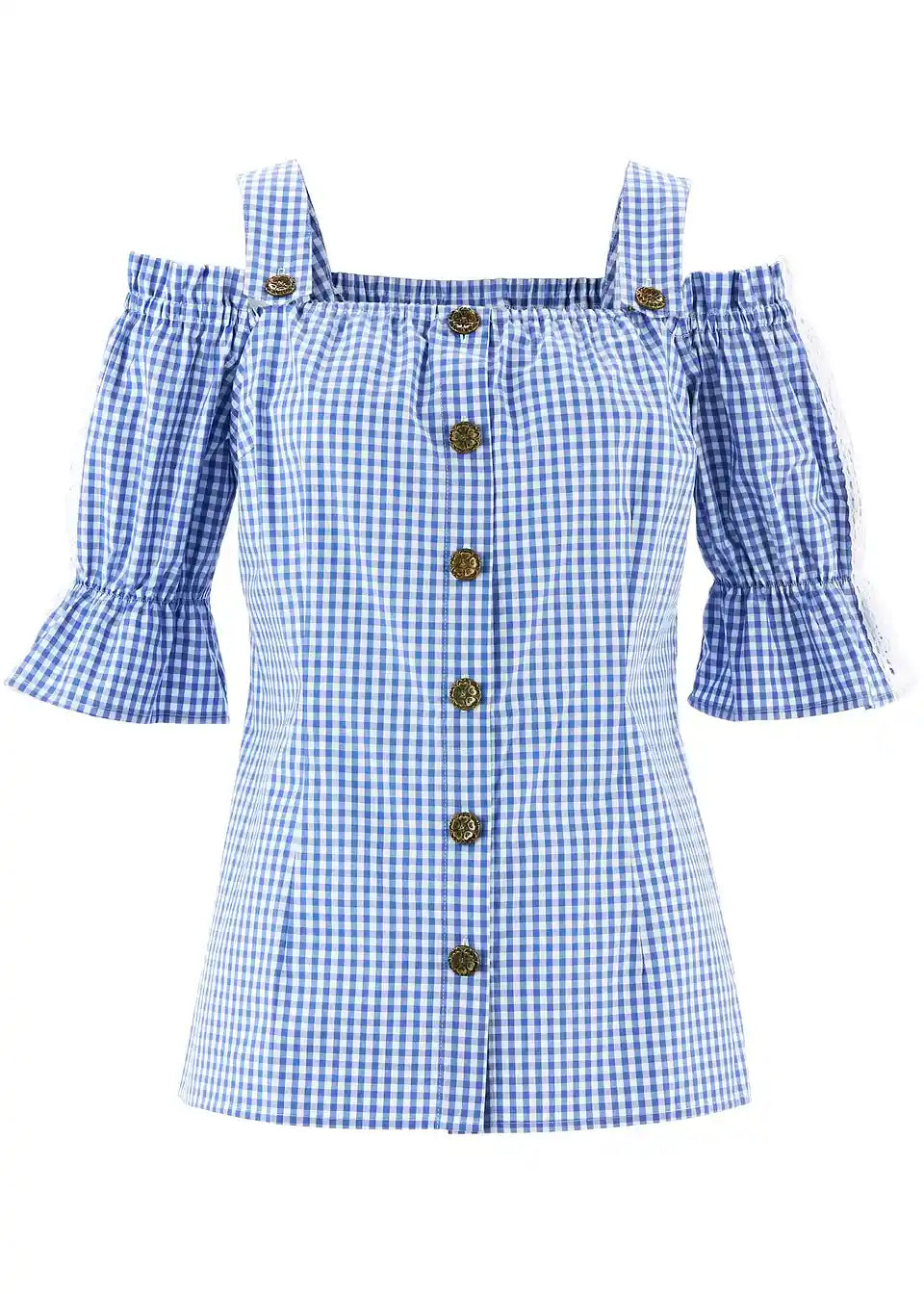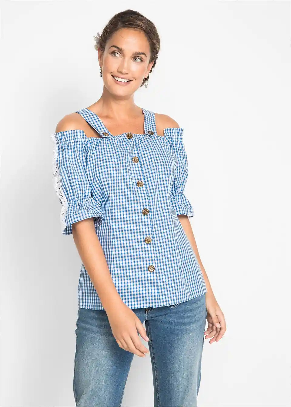 S ovom prekrasnom tradicionalnom bluzom od bpc-a nećete biti dobro odjeveni samo za Oktoberfest. Bluza s pola rukava i gumbima impresionira s pažljivo izrađenim rukavima: zahvaljujući elastičnim umecima nastaju karakteristični puff rukavi. Sa strane rukavi su ukrašeni kukičanim čipkama. Široke naramenice mogu se prilagoditi po duljini kako bi se osigurala odgovarajuća potpora. Carmen izrez ističe ramena i dekolte. Šavovi na prsima i struku straga oblikuju lijepu figuru. Tradicionalna karirana bluza može se savršeno kombinirati s odgovarajućim tradicionalnim hlačama.