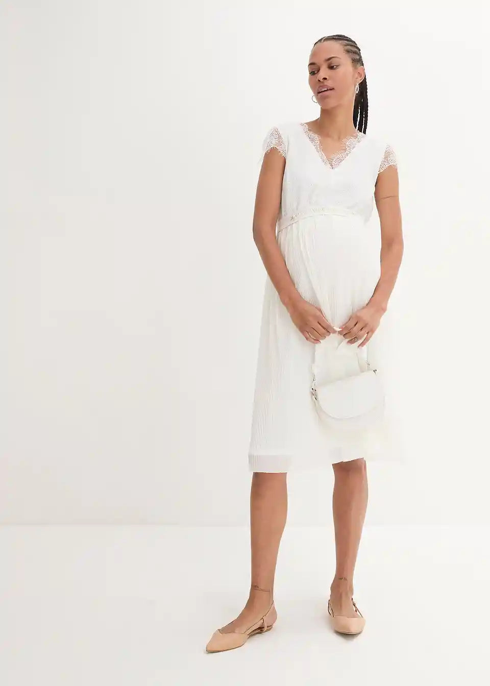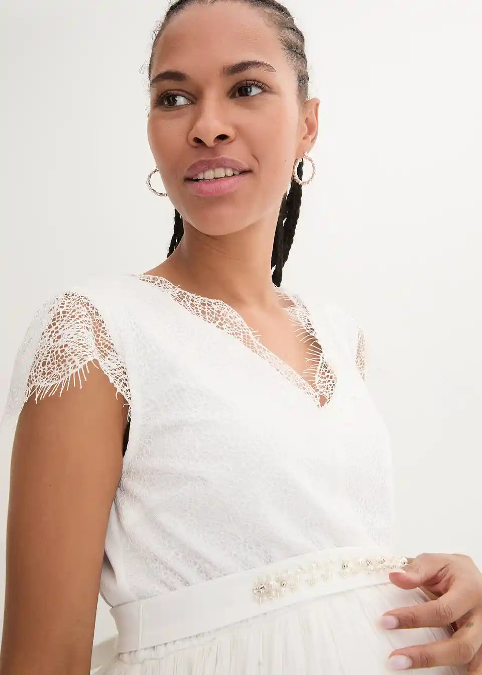 Vjenčanica za trudnice s modernom čipkom i pojasom s blistavim kristalima. Plisirani donji dio omogućava udobno nošenje s dodatnim prostorom za rastući trbuh. Dodatno, elastični stražnji dio osigurava da se haljina prilagođava tijelu. Jednostavna i bezvremenska za posebne prilike.