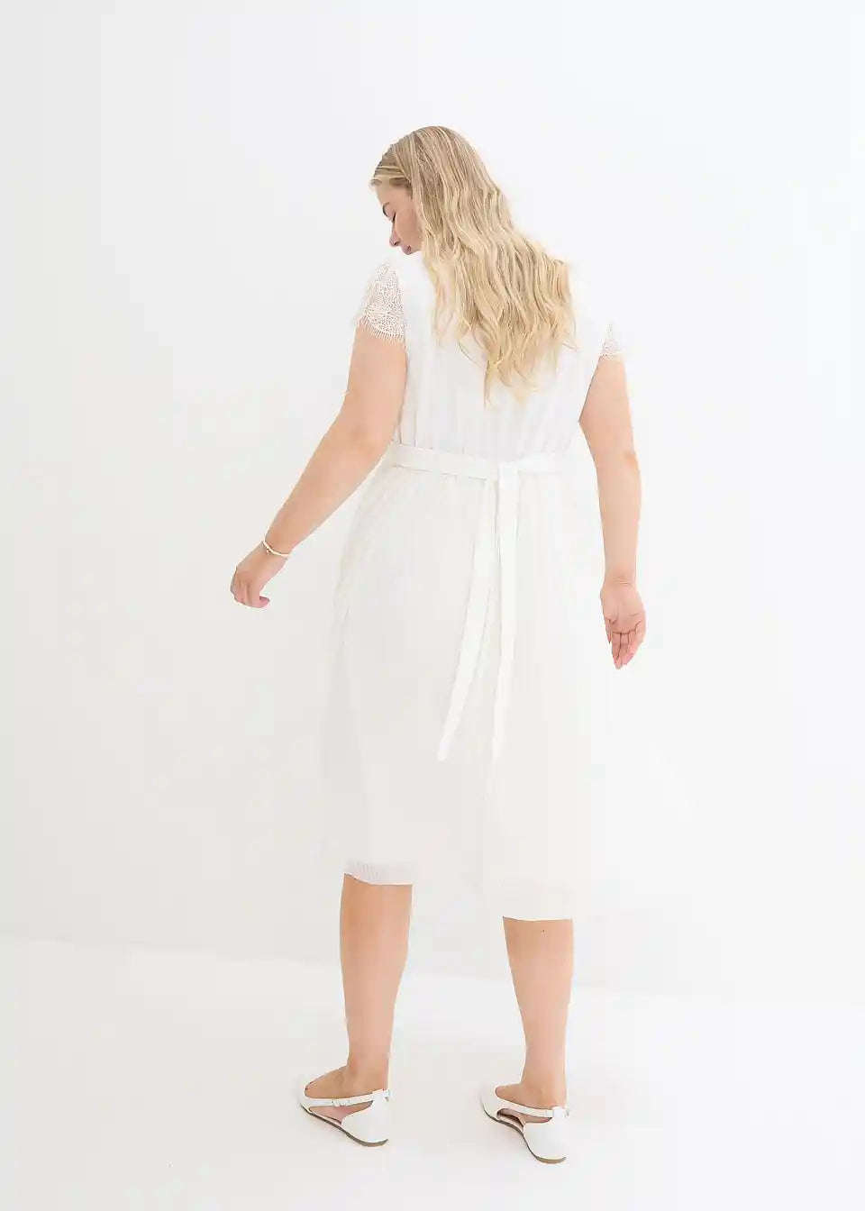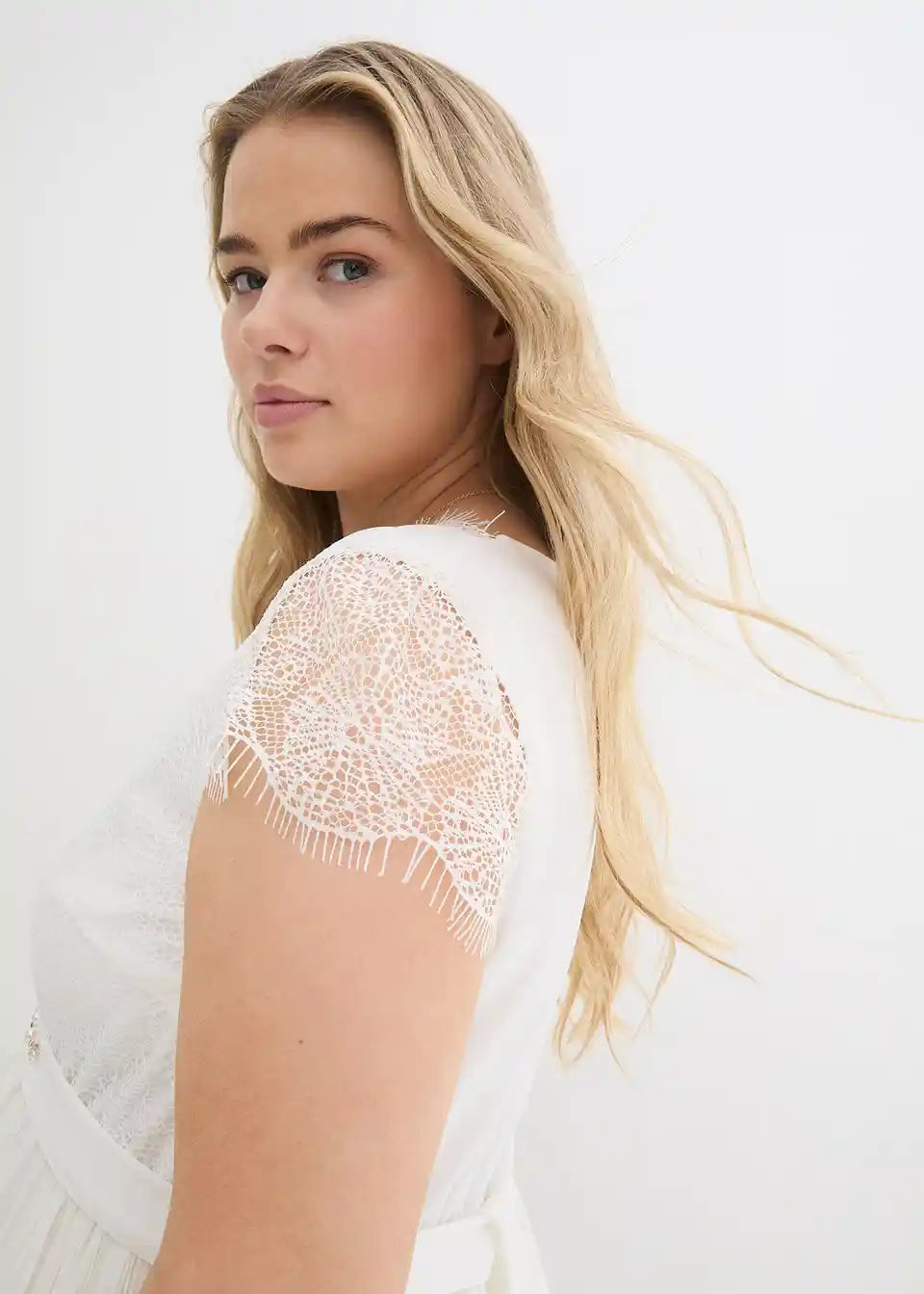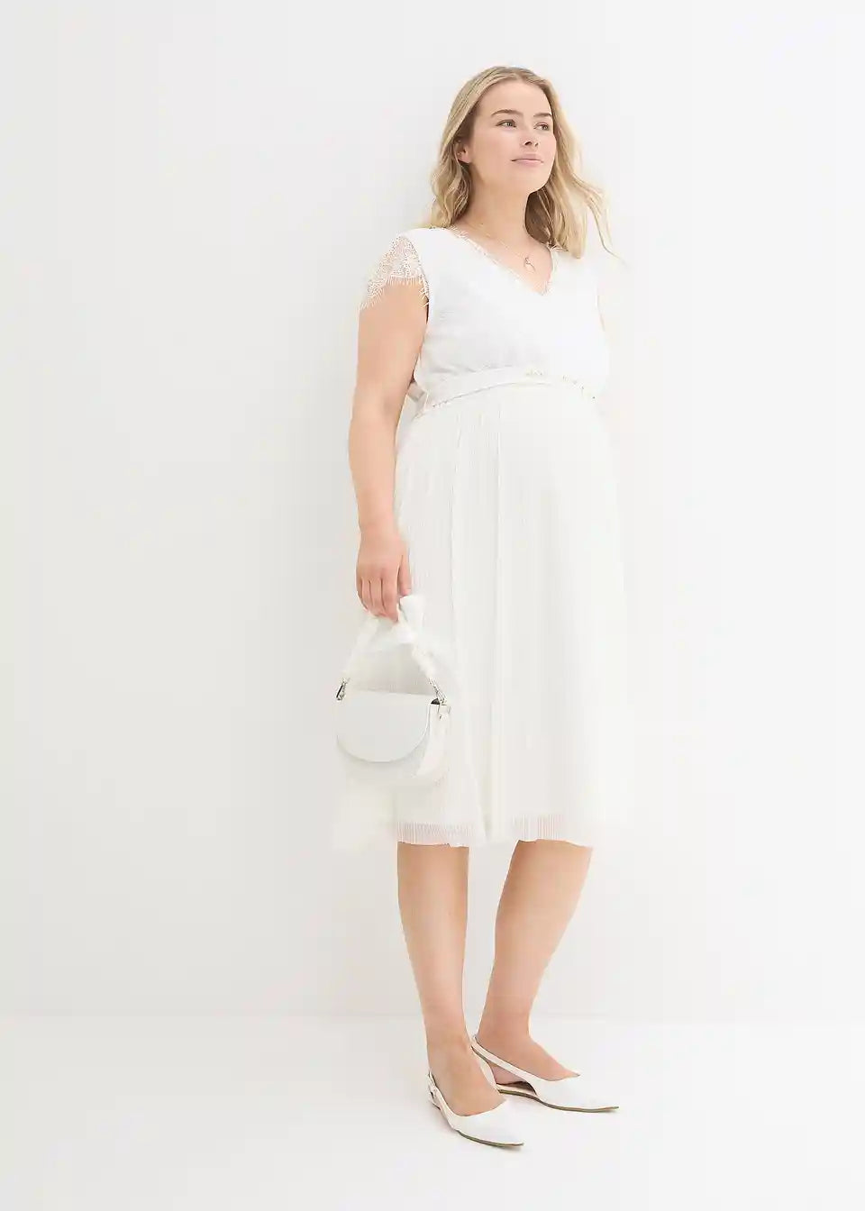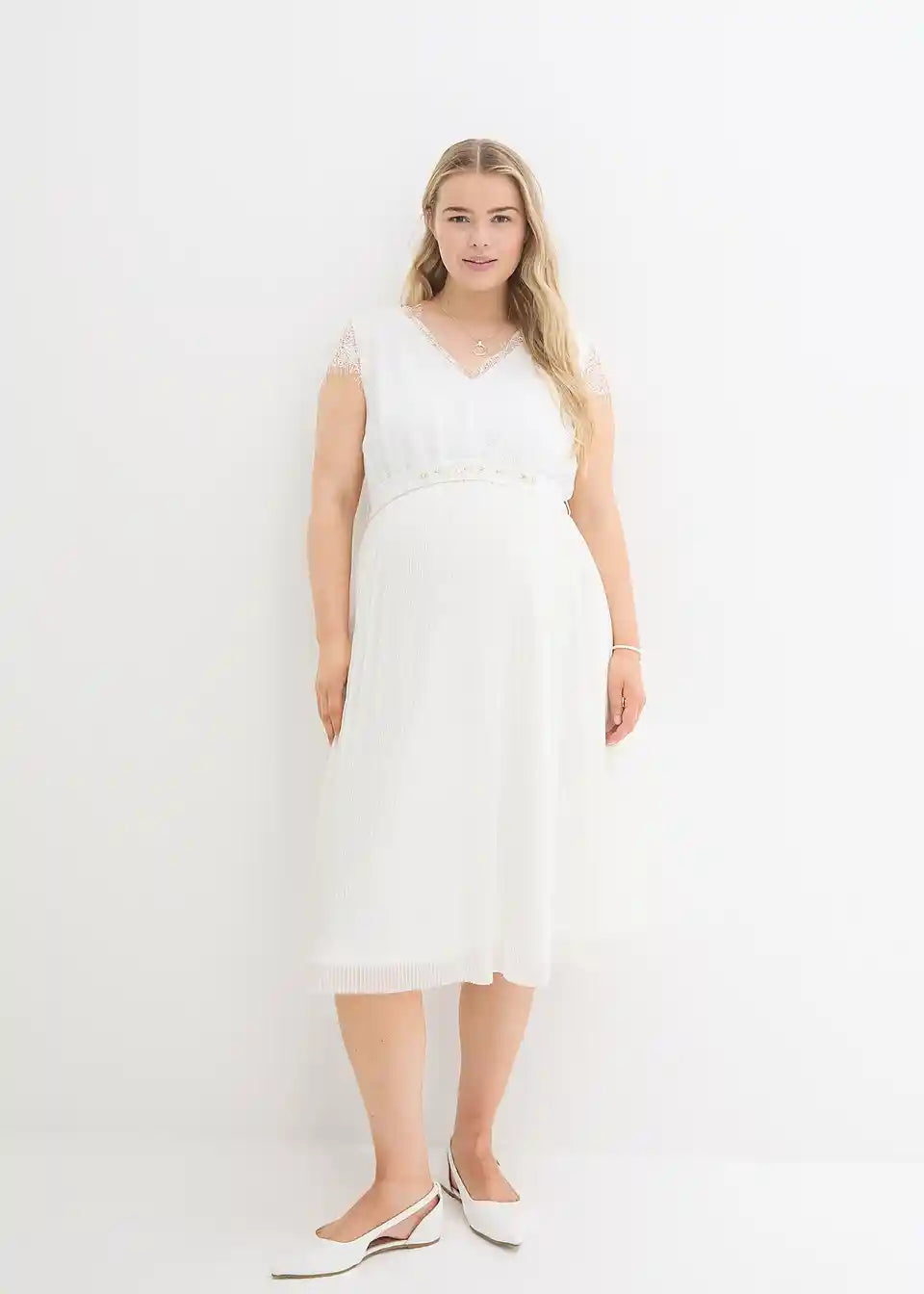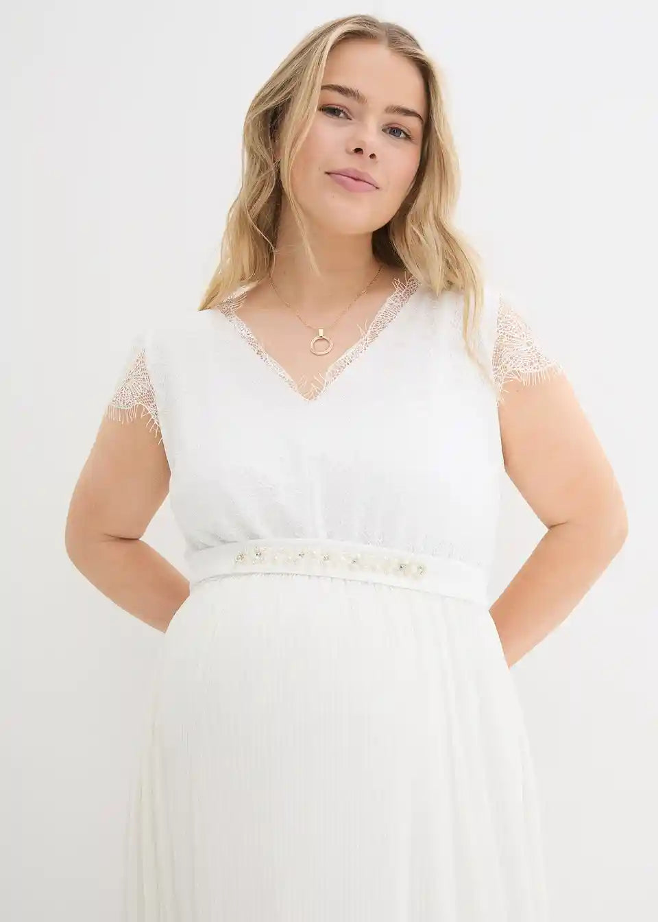 Vjenčanica za trudnoću s modernom čipkom i pojasom ukrašenim blistavim kamenčićima. Plisirani dio suknje pruža udobno pristajanje s dodatnim prostorom za rastući trbuh. Dodatno, elastični stražnji dio osigurava da haljina raste zajedno s trbuhom. Jednostavna i bezvremenska za posebne prilike.