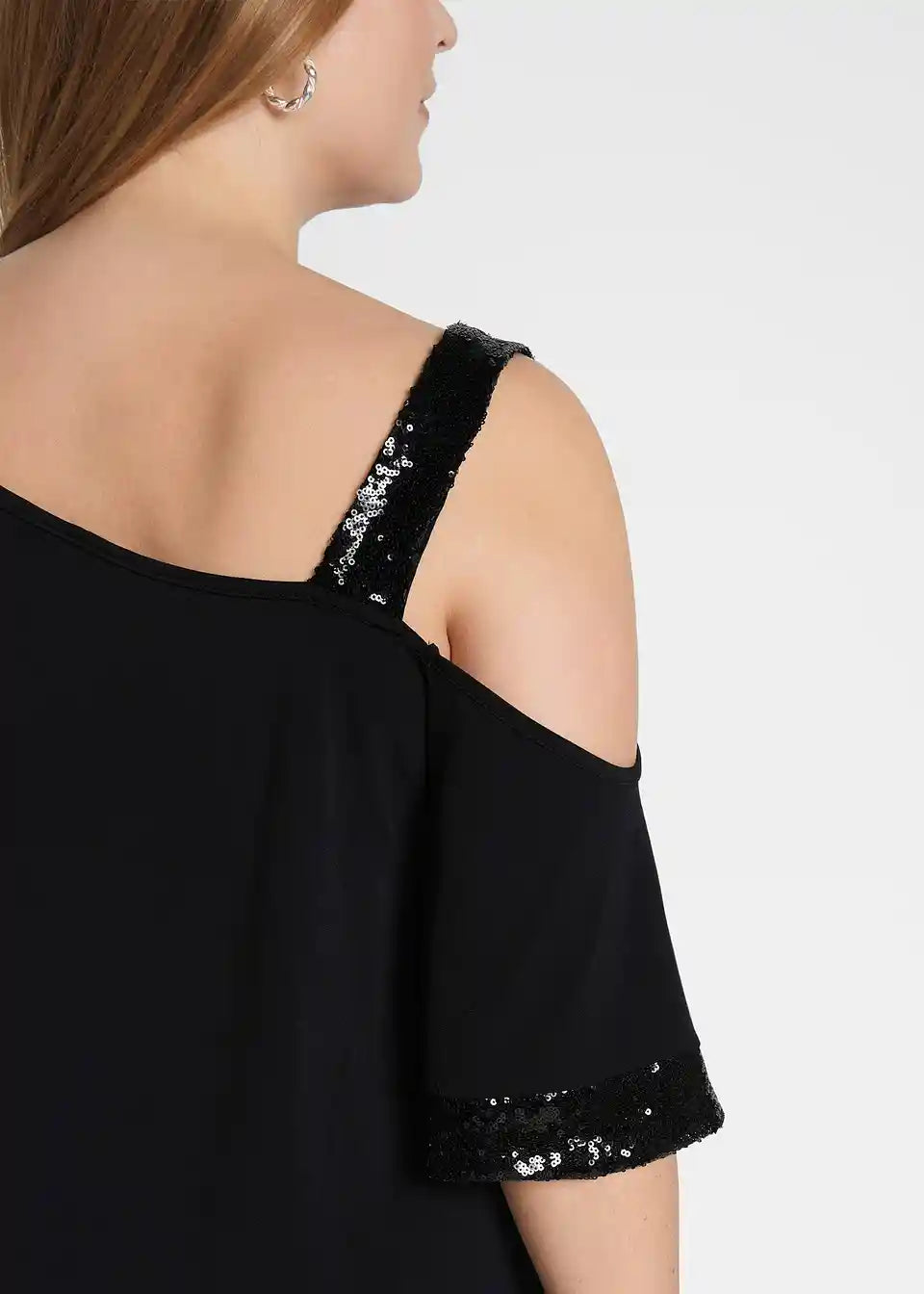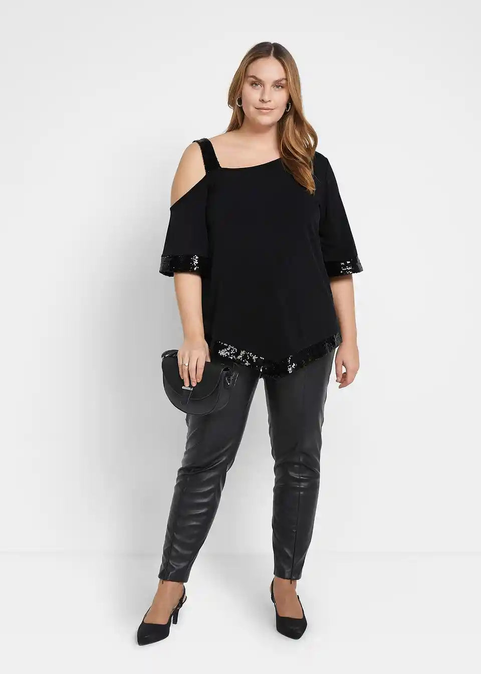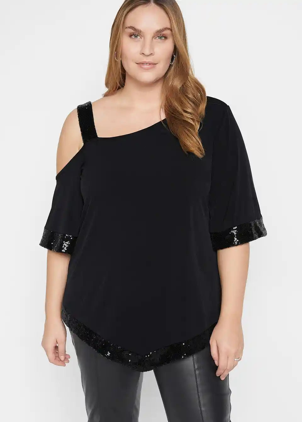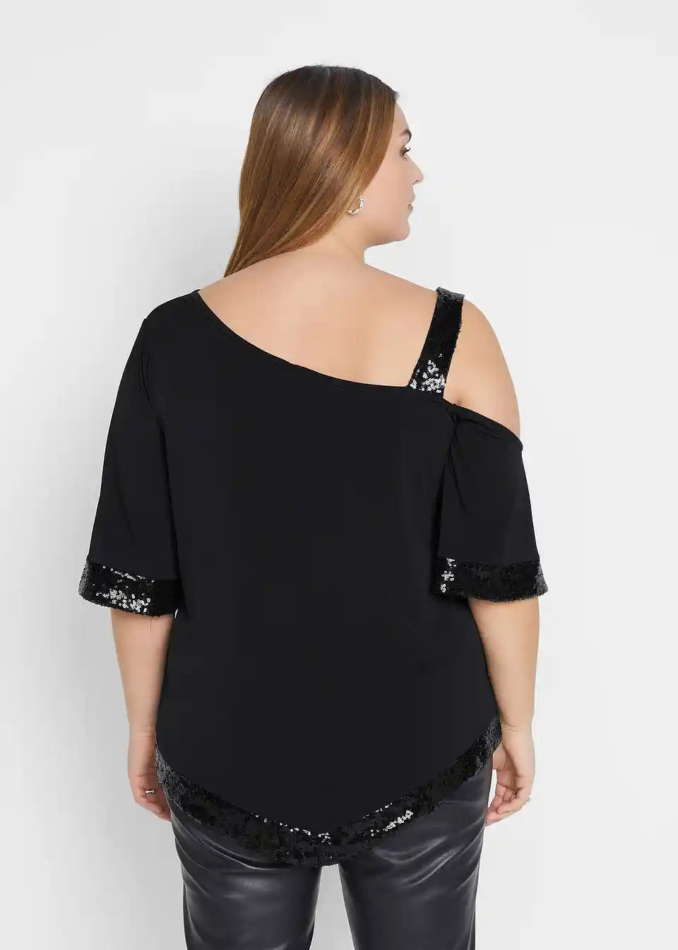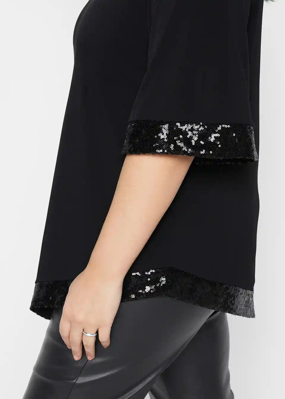 Tunika-Shirt s asimetričnim krojem, širokim rukavima i špicastim rubom. Detalji s pailettama.
