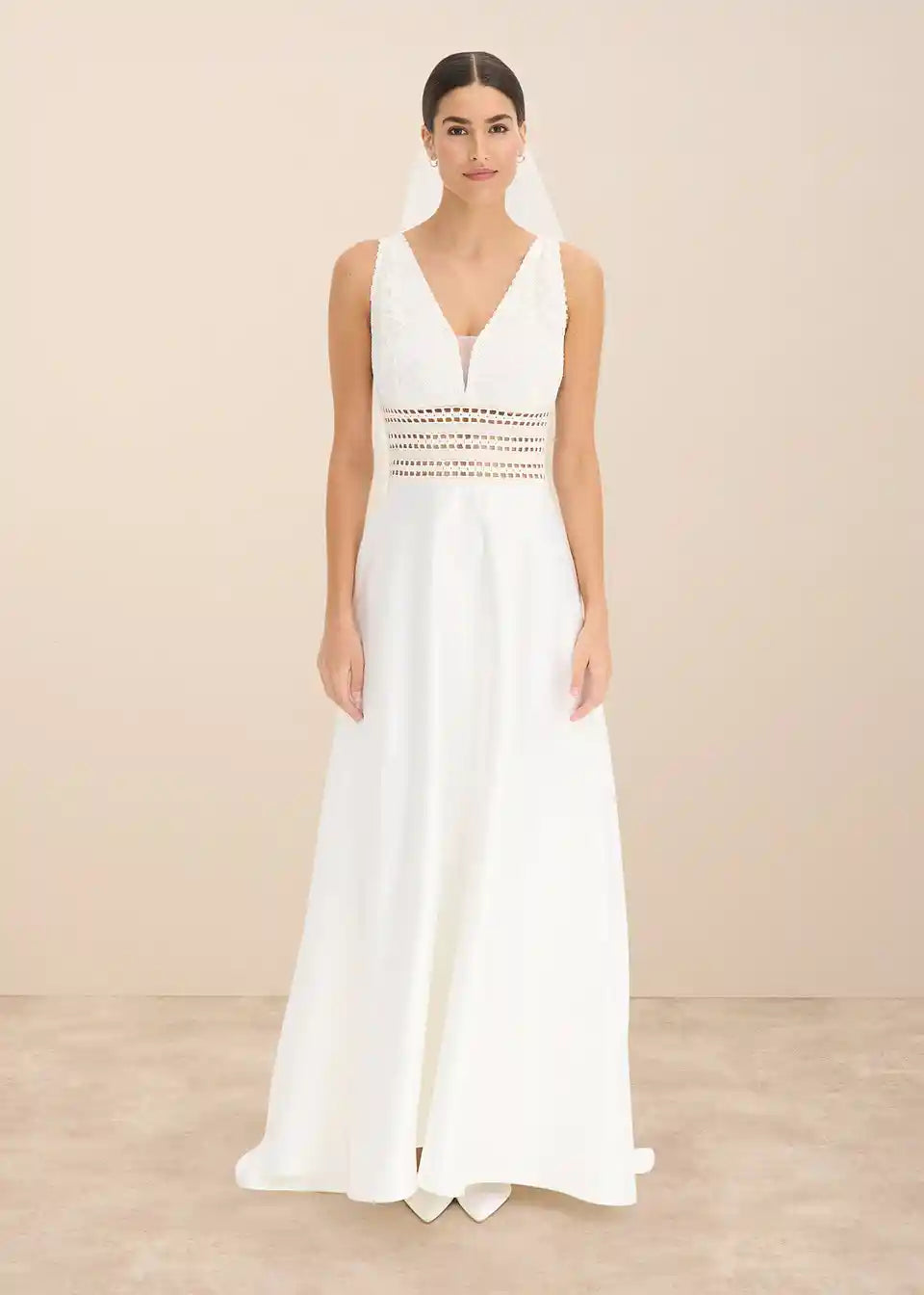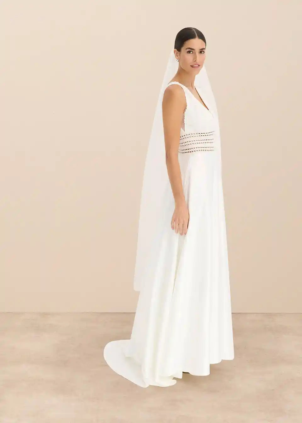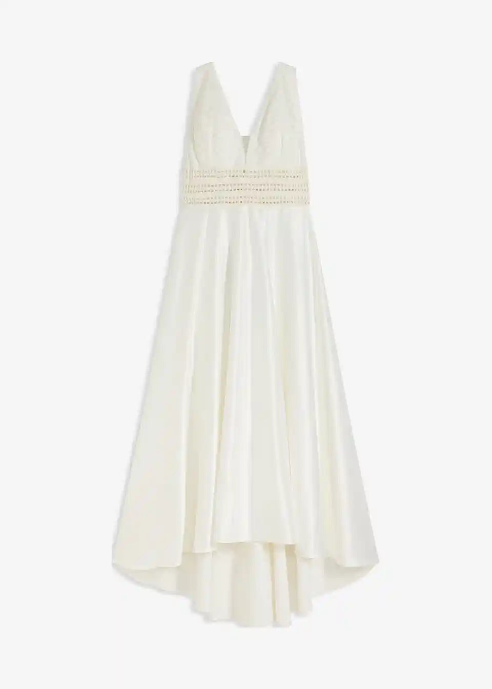 Moderno i ženstveno: Duga vjenčanica od sjajnog satena s čipkastim gornjim dijelom i kukičanim umetcima u struku