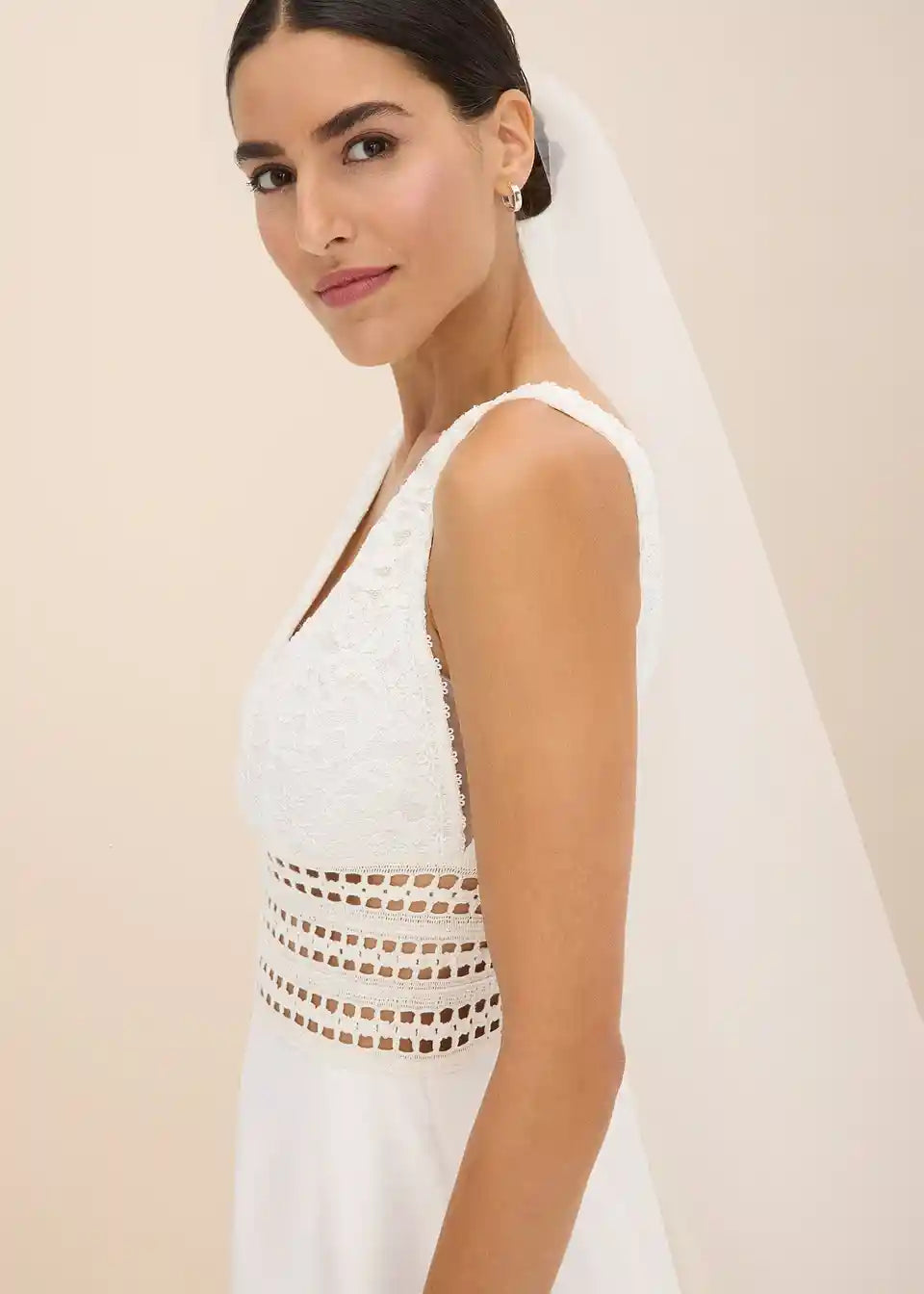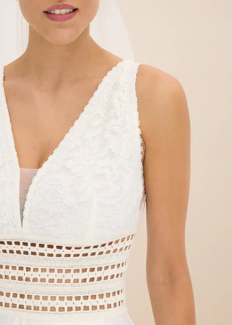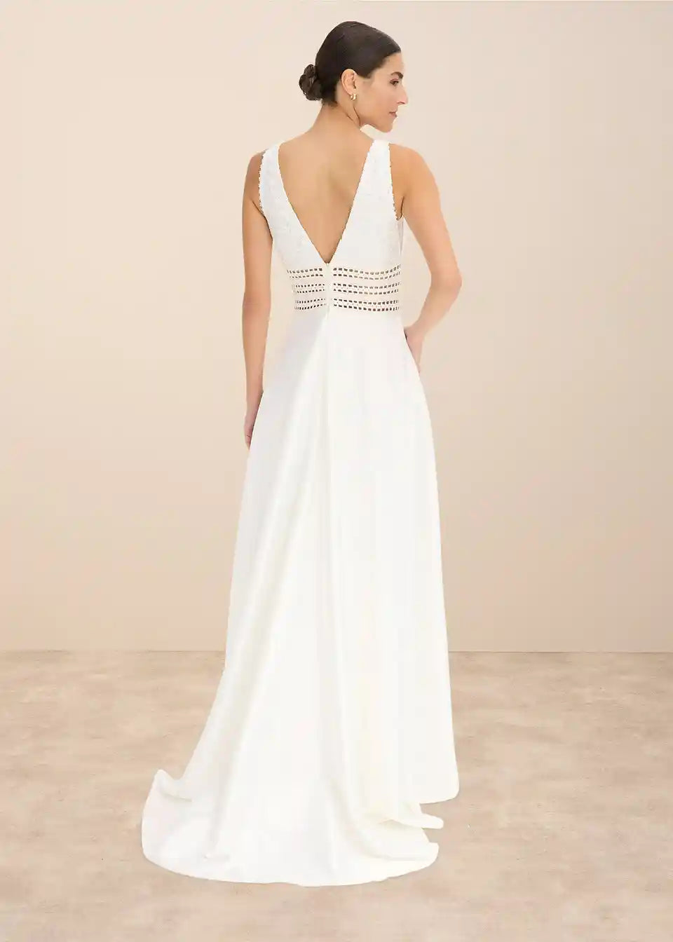 Moderno i ženstveno: Duga vjenčanica od sjajnog satena s čipkastim gornjim dijelom i kukičanim umetcima u struku