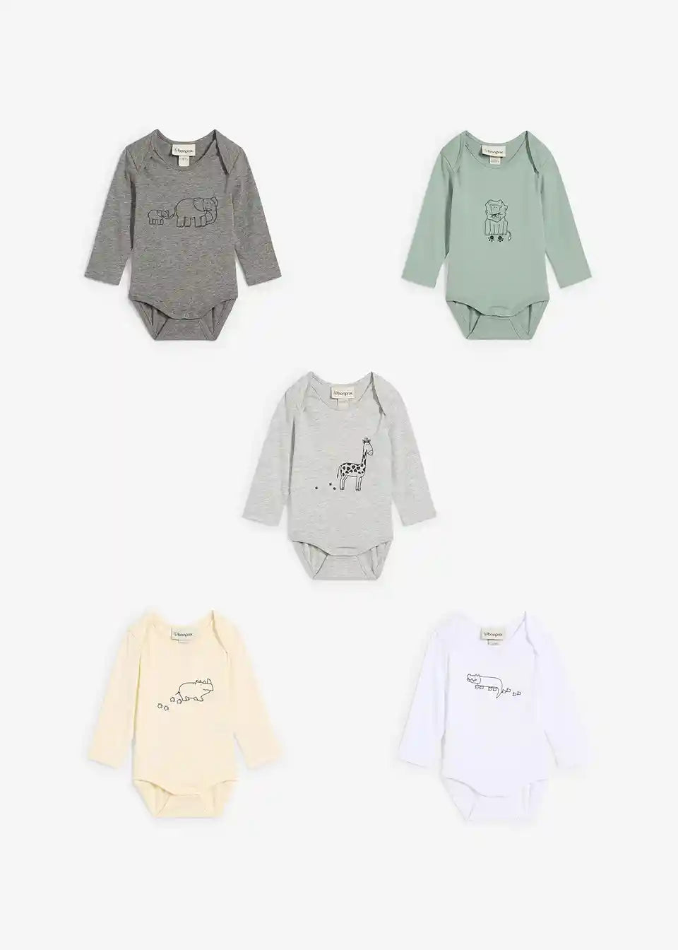 Jednostavno preslatki su ovi bodiji s dugim rukavima i različitim otiscima životinja na prednjoj strani. Dostupni su u pakiranju od 5 komada i lako se oblače zahvaljujući preklapajućim ramenima i 3 drukera u području prepona!