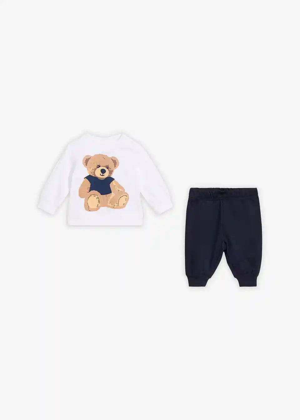 Slatka Teddy majica + jednobojne tamnoplave trenirke s elastičnim pojasom.