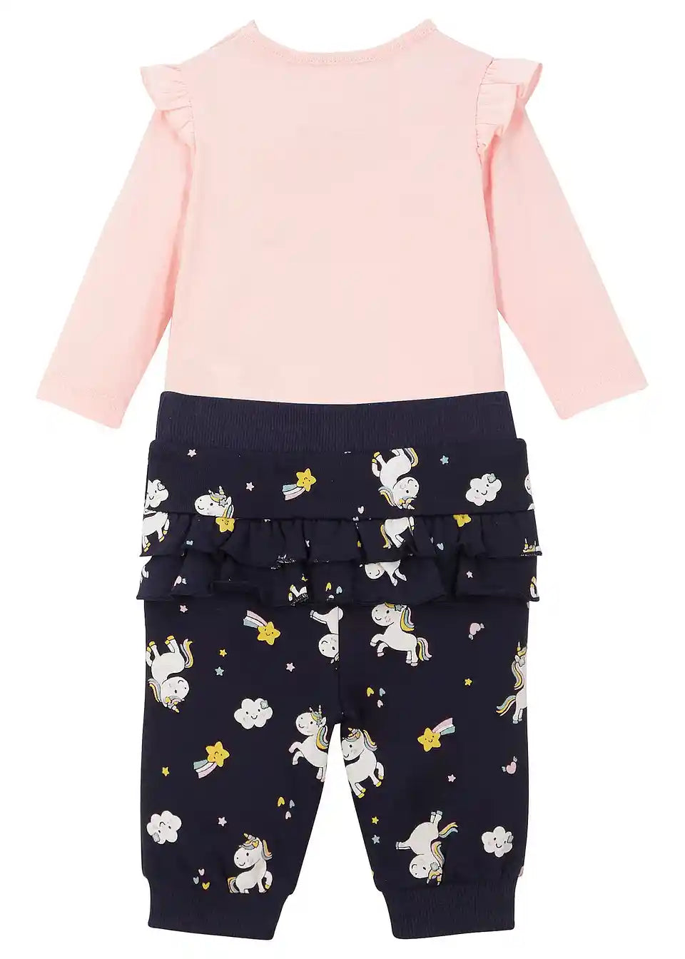 Predivan set koji se sastoji od slatko printanog bodyja i sweat hlača s odgovarajućim printom u cijelosti. Body se praktično zakopčava drukerima u području prepona i ramena.
