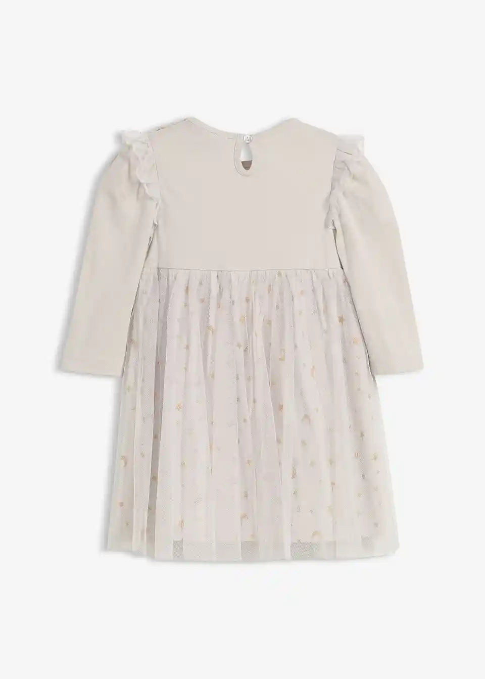 Praktična body haljina s til suknjom i svjetlucavim zvjezdicama. Integrirani body ima kopčanje na drukere u međunožju, što olakšava oblačenje, svlačenje i prematanje. Lagana til suknja s volanima daje haljini svečani karakter – idealno za posebne prigode.