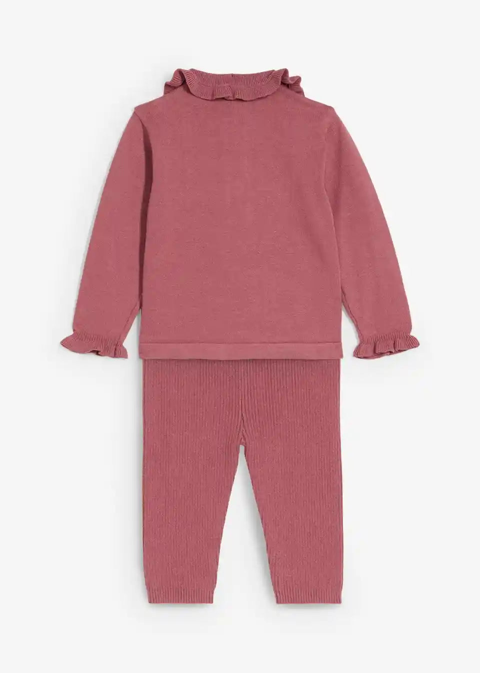 Mekani pleteni pulover s volan-ovratnikom i tajice za male modne ikone! Ovaj moderan set svakom outfitu daje poseban štih. Mekani pleteni pulover sa šarmantnim volan-ovratnikom i volanima na rukavima pruža elegantan izgled, dok odgovarajuće tajice osiguravaju udobno pristajanje i veliku slobodu kretanja – idealno za aktivnu svakodnevicu vašeg djeteta. Uz ovaj set bebe odmah imaju čaroban outfit, savršen za igru, izlete ili posebne prigode. Izrađen od visokokvalitetne mješavine pamuka, udio sintetičkih vlakana smanjuje stvaranje mucica i pruža ugodan osjećaj na koži. Izvrstan izbor za male modne istraživačice s osjećajem za stil!