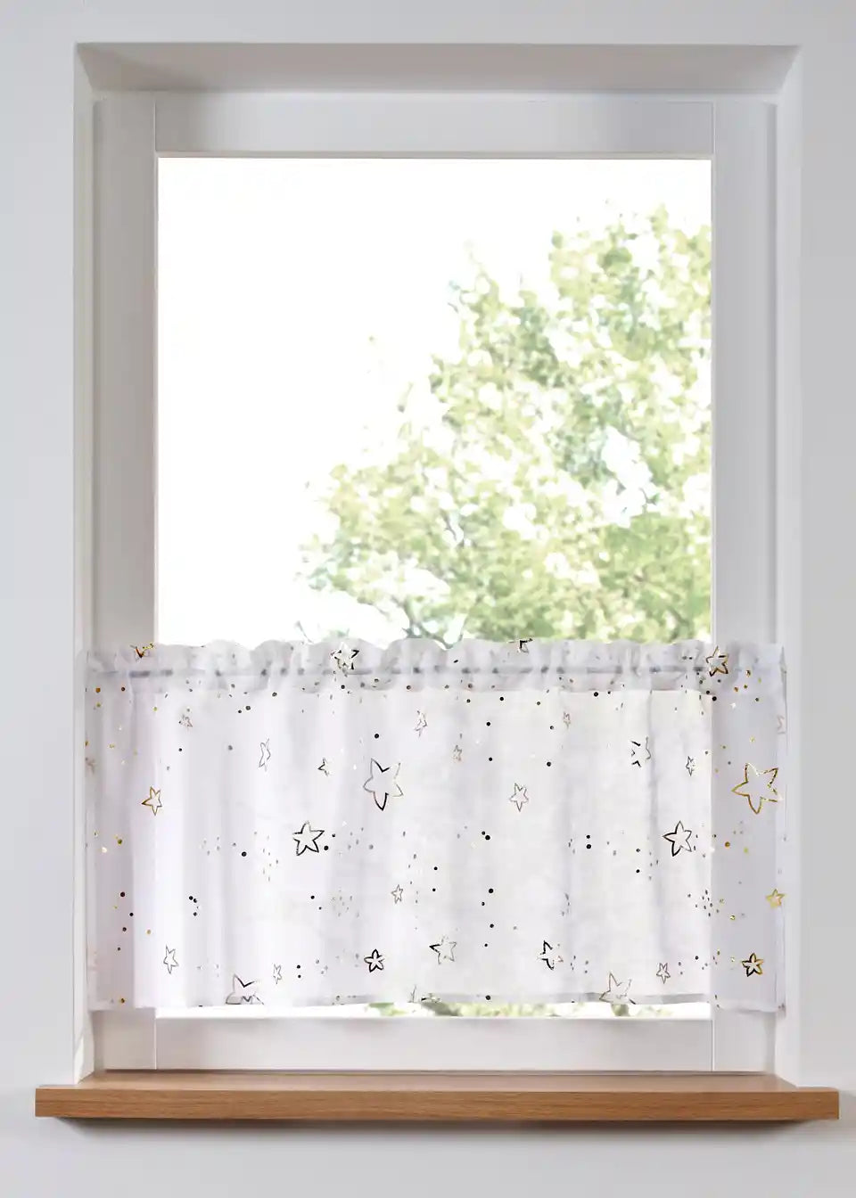 Svečana kratka zavjesa izrađena od recikliranog poliestera s elegantnim sjajnim printom. Tunelska traka omogućuje jednostavno postavljanje, a materijal jednostavno održavanje.
