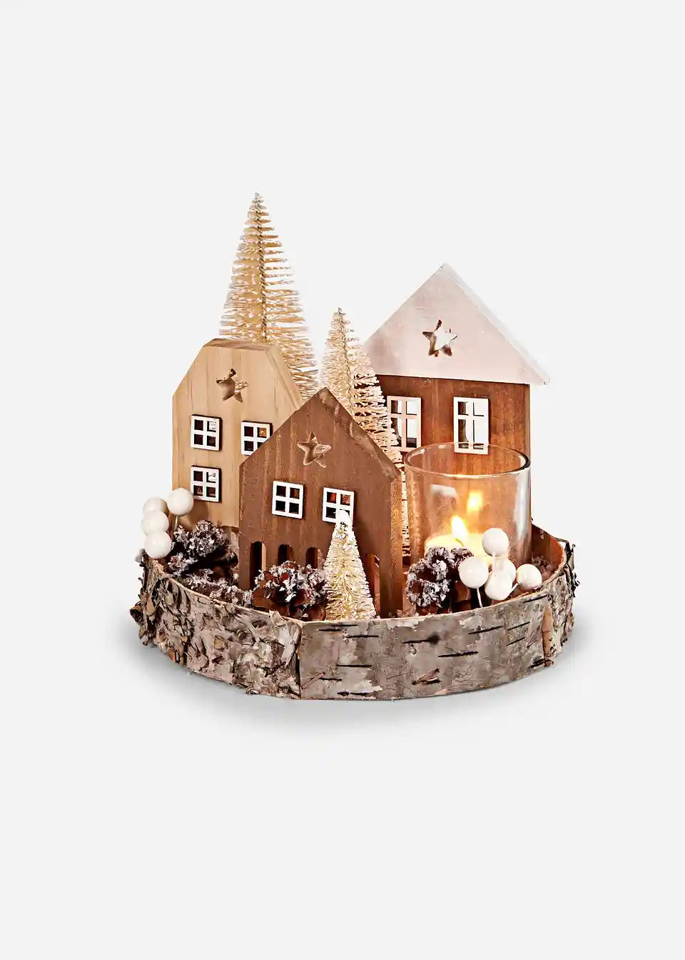 Dekorativni objekt s čašom za lučicu je šarmantan ukras koji donosi blagdansko raspoloženje i ugodu u svaki dom. S ljubavlju dizajnirani zimski pejzaž od malih drvenih kućica, češera i stabala stvara pozivajuću atmosferu. Čaša za lučicu pruža toplo svjetlo i naglašava svečani dekor. Idealan je za postavljanje na stolove, police ili prozorske daske, ovaj deko-objekt savršen je za pojačavanje iščekivanja božićnog razdoblja. Bezvremenski je naglasak koji veseli tijekom blagdana i ostatka zime te unosi ljepotu zimskog krajolika u dom.
