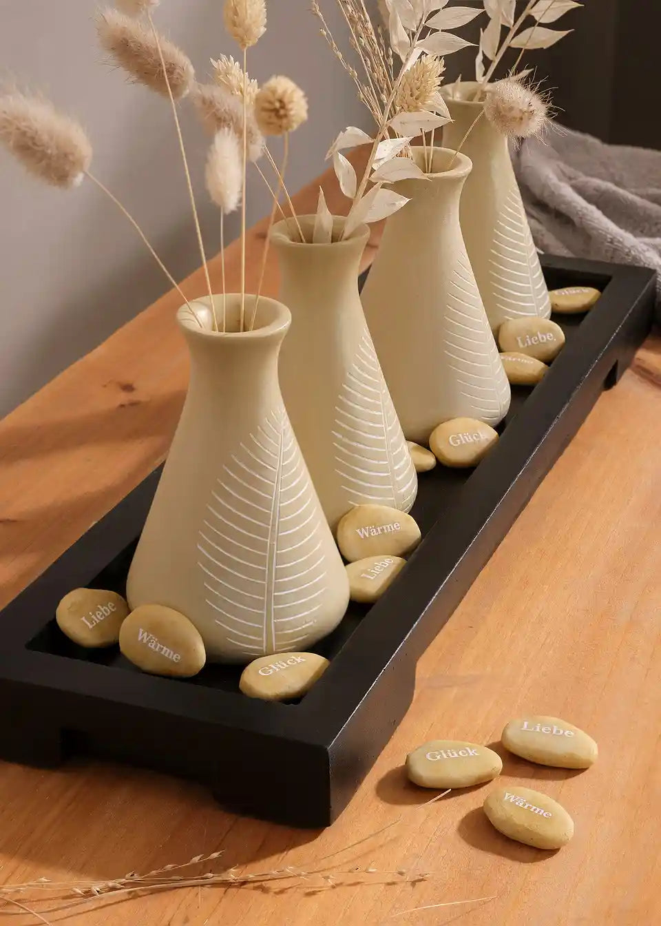 Ovaj dekorativni set inspiriran Azijom odiše mirom i harmonijom. Male vaze s filigranskim uzorkom lista i dekorativno kamenje na pladnju čine skladnu cjelinu. Svi kameni imaju natpis s pozitivnim vibracijama. Nijanse boja podsjećaju na smirenost Buddhe. Ovaj set idealan je za stvaranje opuštene atmosfere i unošenje daška Zena u tvoj dom.