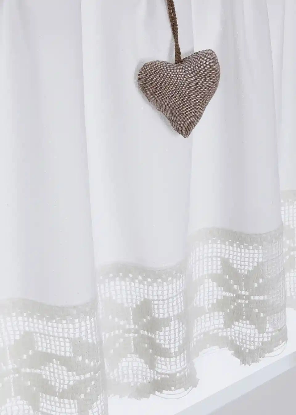 Romantična kuhinjska zavjesa s visokokvalitetnim kukičanim obrubom i aplikacijama u obliku srca
