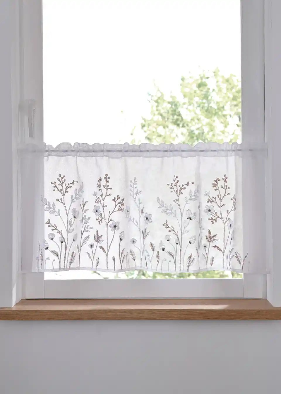 Veselite se našoj očaravajućoj kuhinjskoj zavjesi s cvjetnim vezom – pravi ukras za vašu kuhinju. Fini vez s sjajnim koncem privlači poglede i daje vašem prozoru šarmantnu i ugodnu atmosferu. Posebnost: ova zavjesa je djelomično izrađena od recikliranog poliestera. Tako kombinirate moderan dizajn sa svjesnim doprinosom zaštiti okoliša.