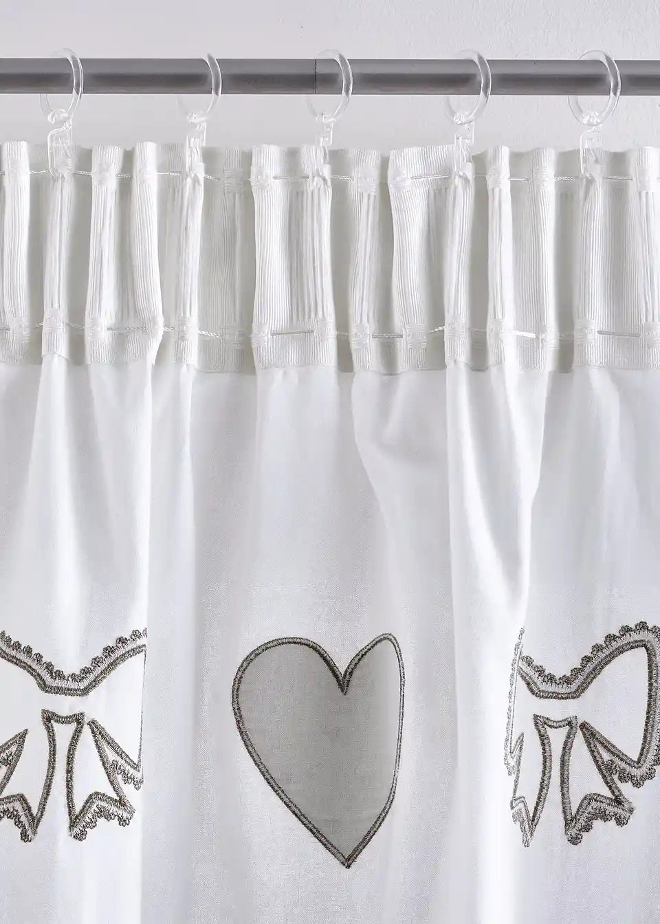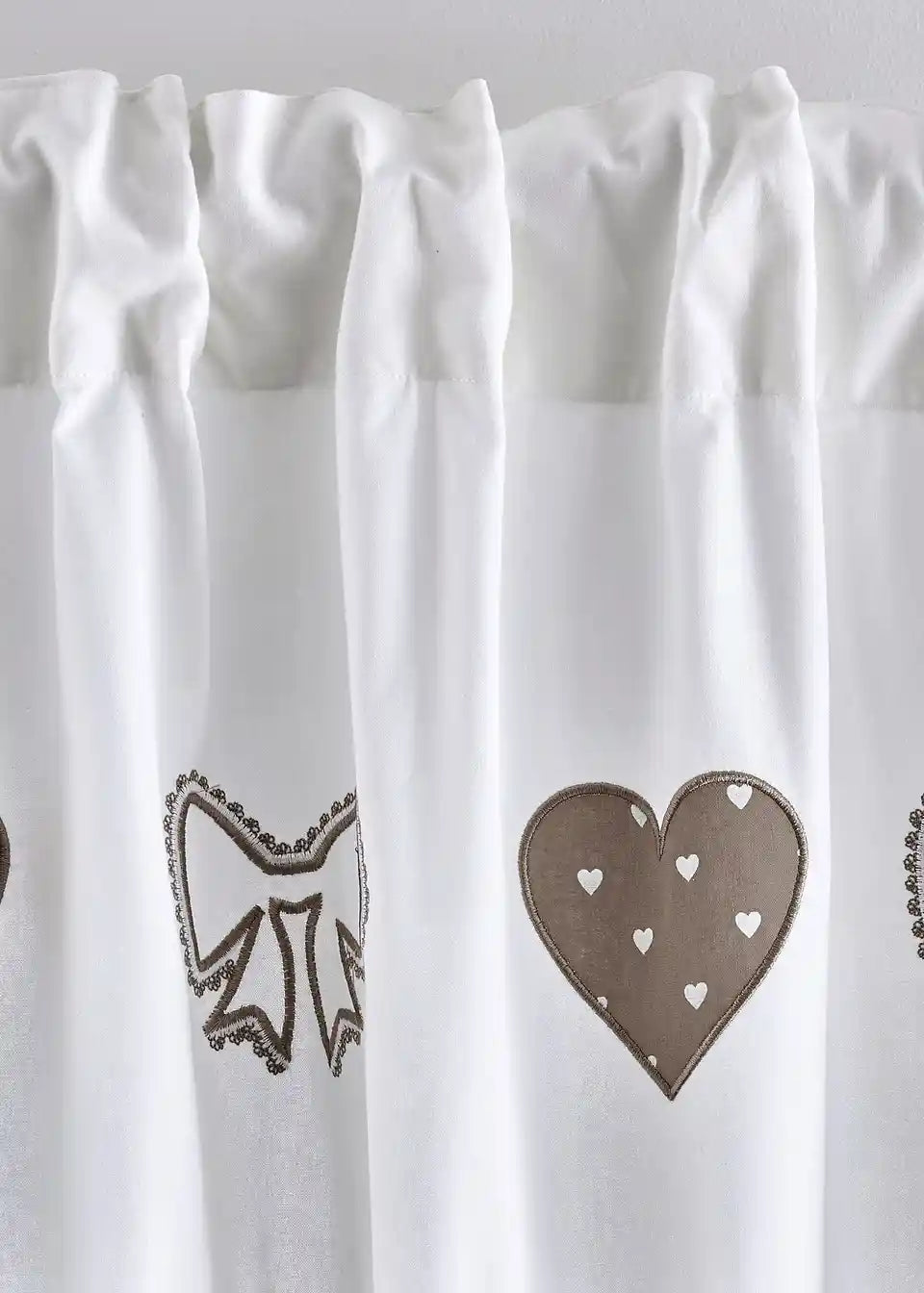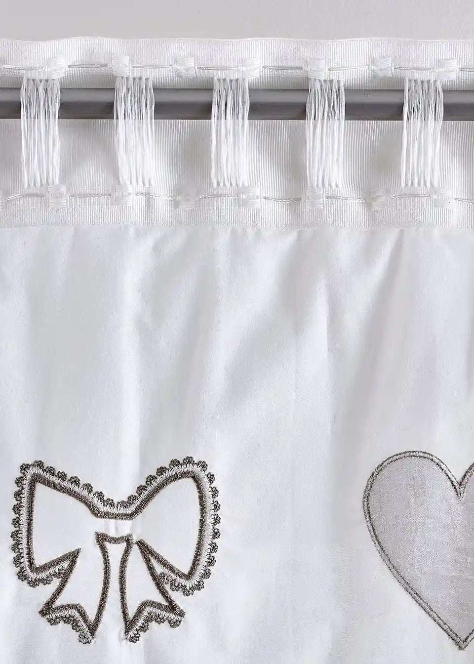 Ova romantična zavjesa od čiste bio pamuka dolazi u prekrasnom rustikalnom stilu. Gornji dio je ukrašen lijepim vezom s mašnama i srcima. Rustikalni izgled dodatno naglašavaju sitni otisci srca. Odgovarajuća uvlačna vezica daje zavjesi završni dodir.