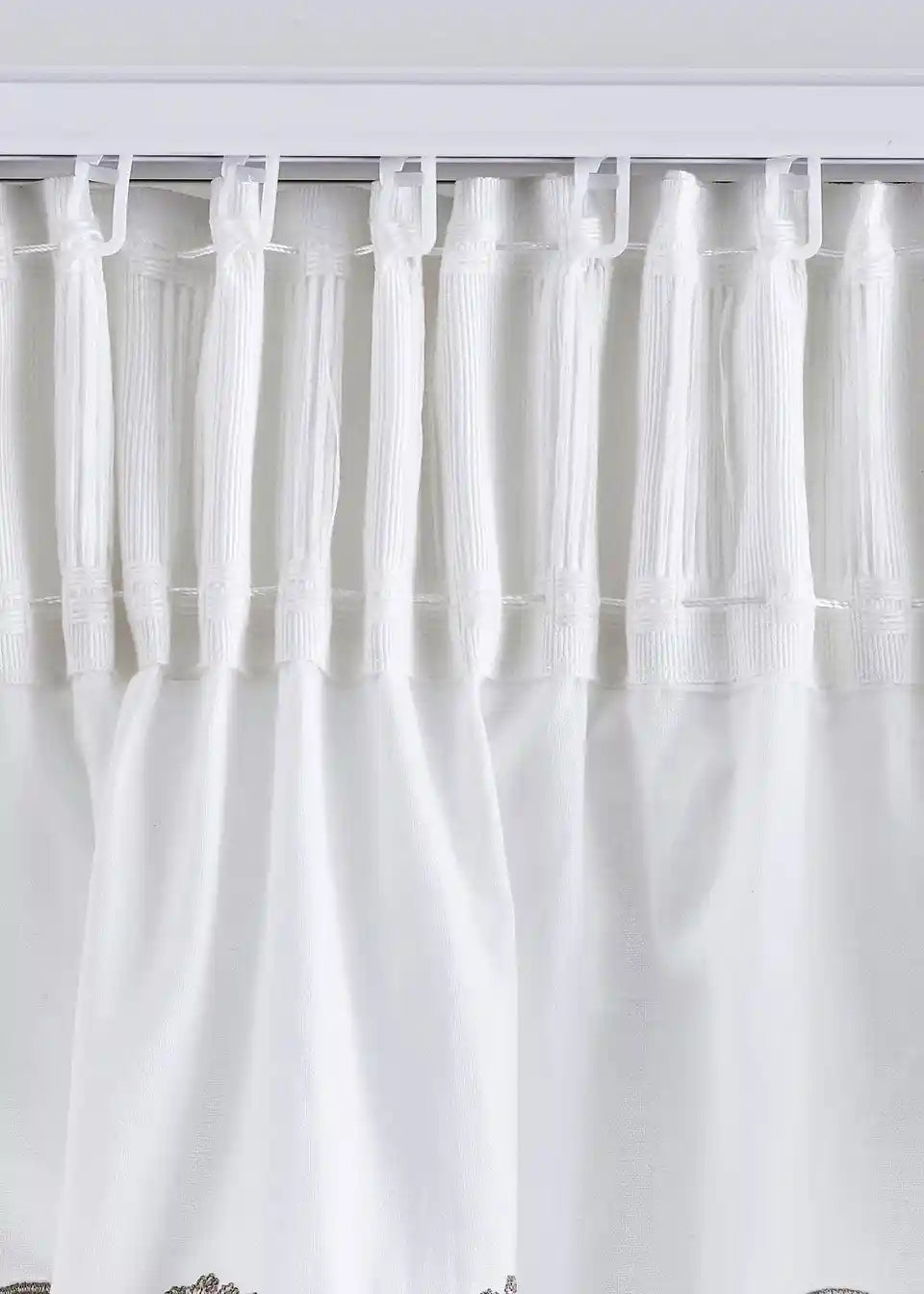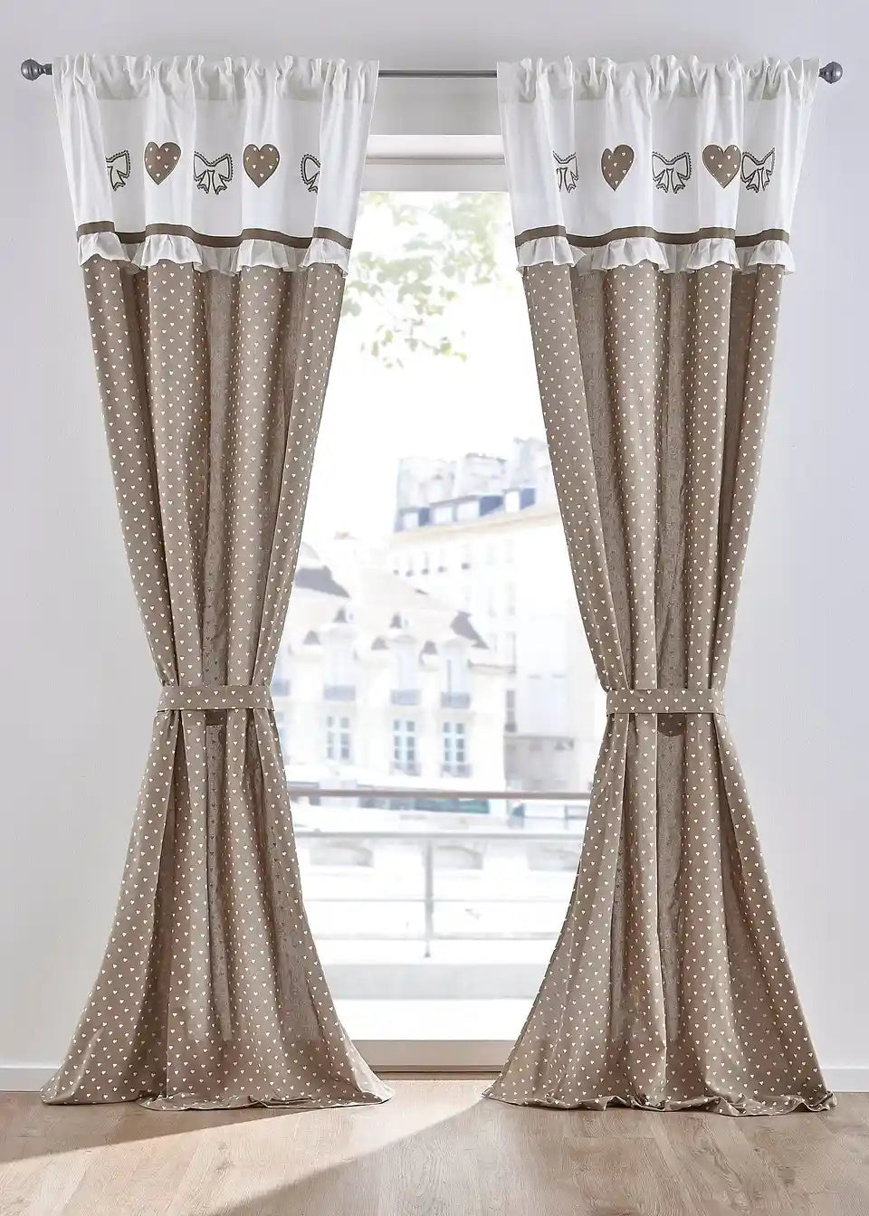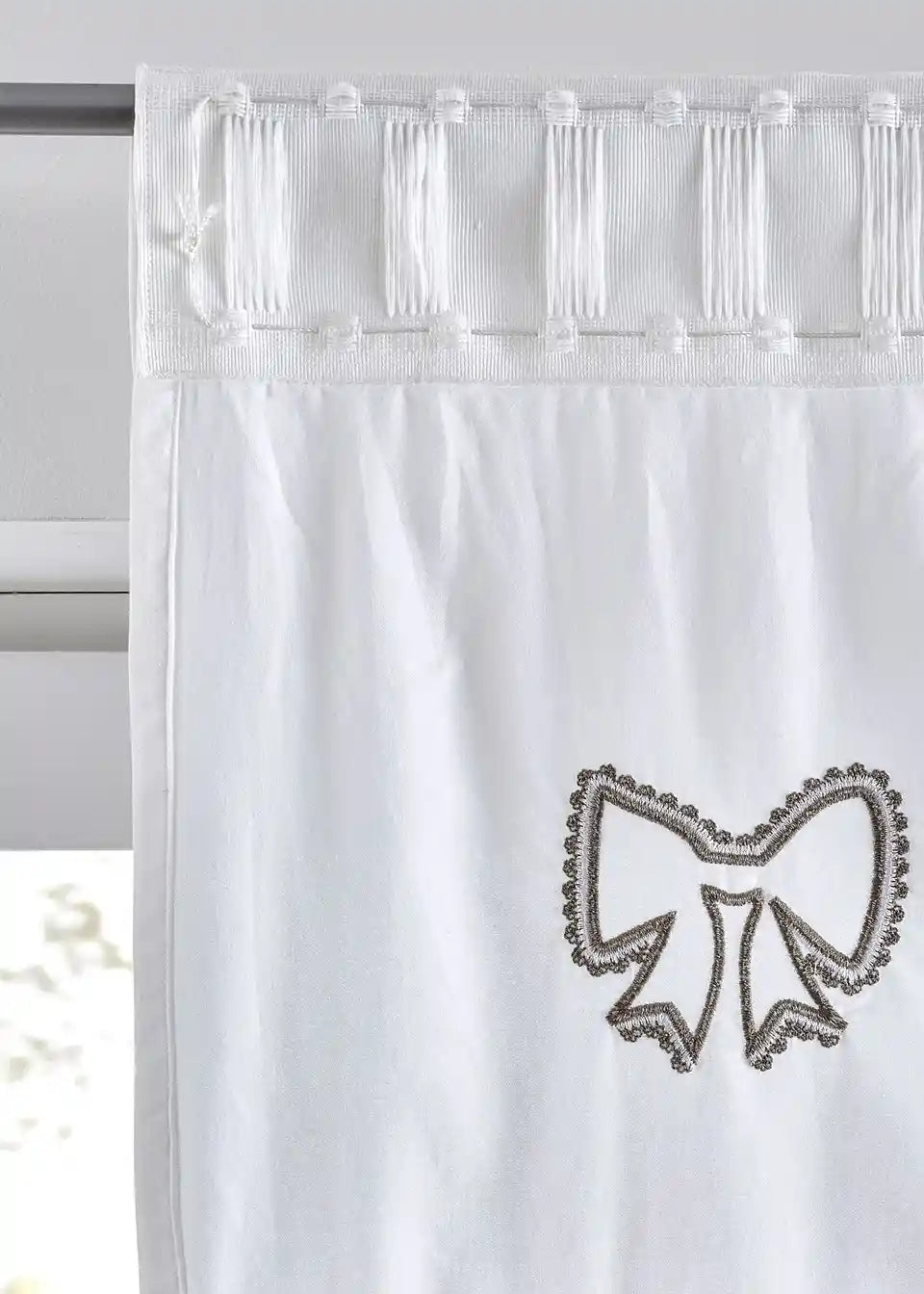 Ova romantična zavjesa od čiste bio pamuka dolazi u prekrasnom rustikalnom stilu. Gornji dio je ukrašen lijepim vezom s mašnama i srcima. Rustikalni izgled dodatno naglašavaju sitni otisci srca. Odgovarajuća uvlačna vezica daje zavjesi završni dodir.