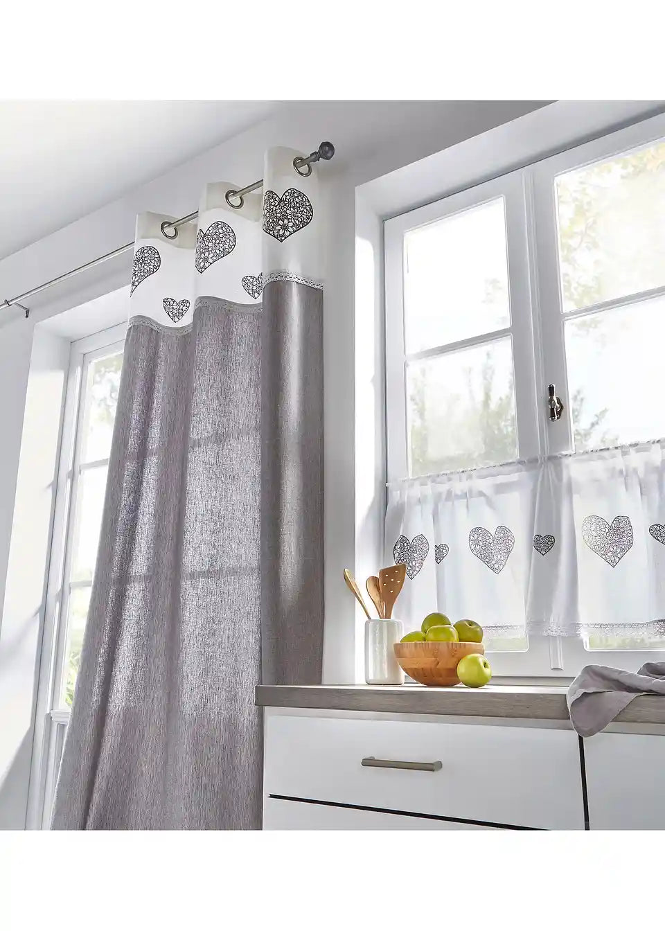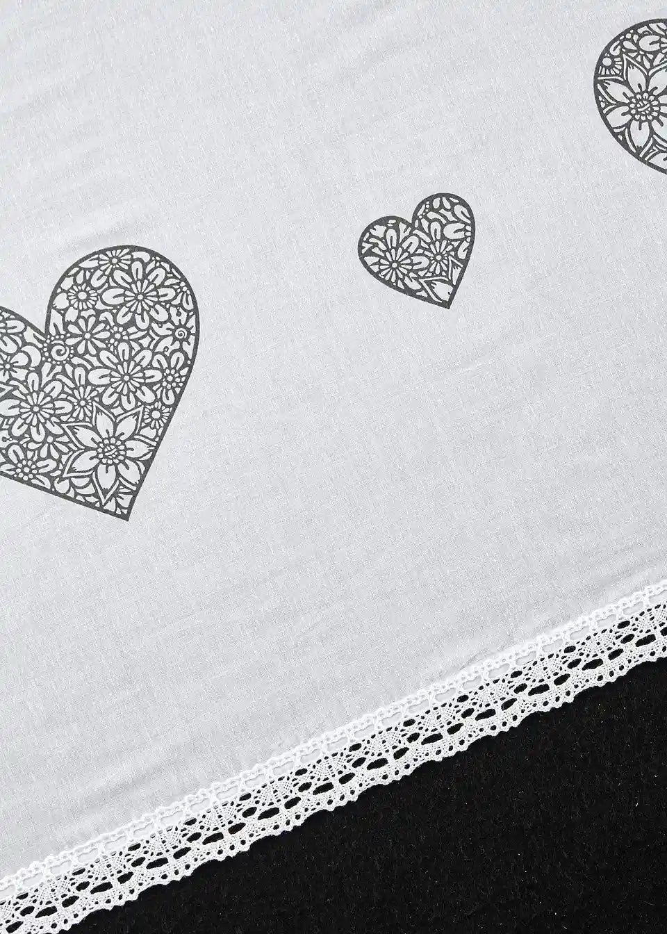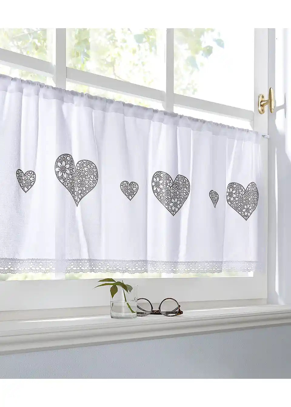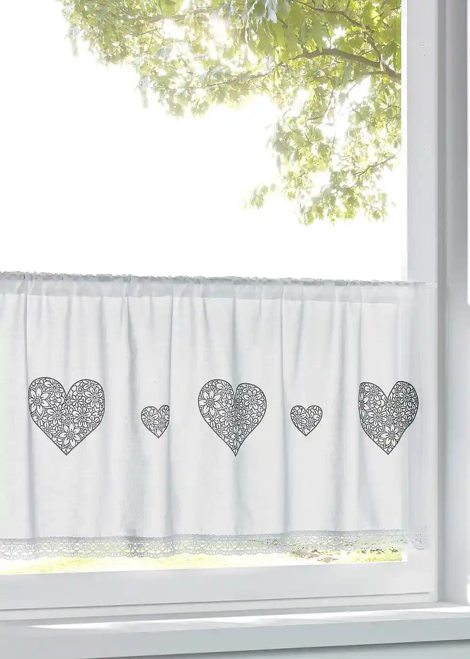 ova kuhinjska zavjesa spaja nježnu čipkastu rubnu traku s ukrašenim srcima!