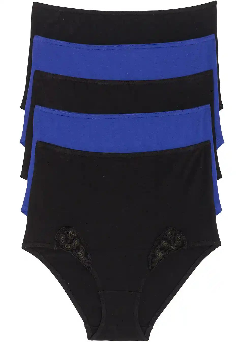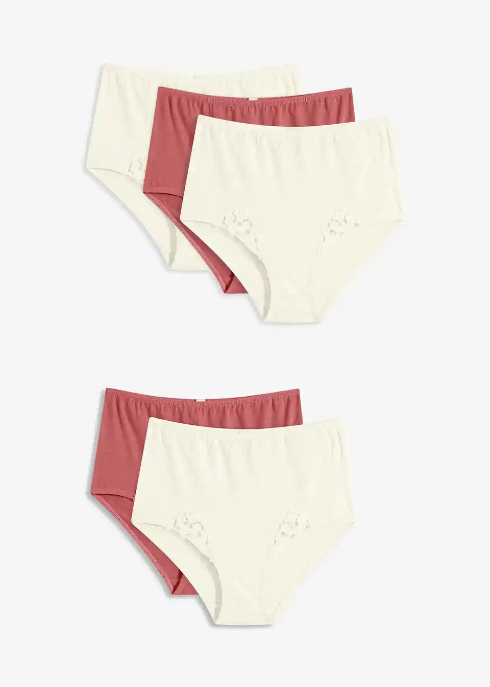Ovaj petodijelni set gaćica dobiva efektno osvježenje na prednjim izrezima za noge i pruža diskretan uvid. Gaćice perite u mrežici za rublje.