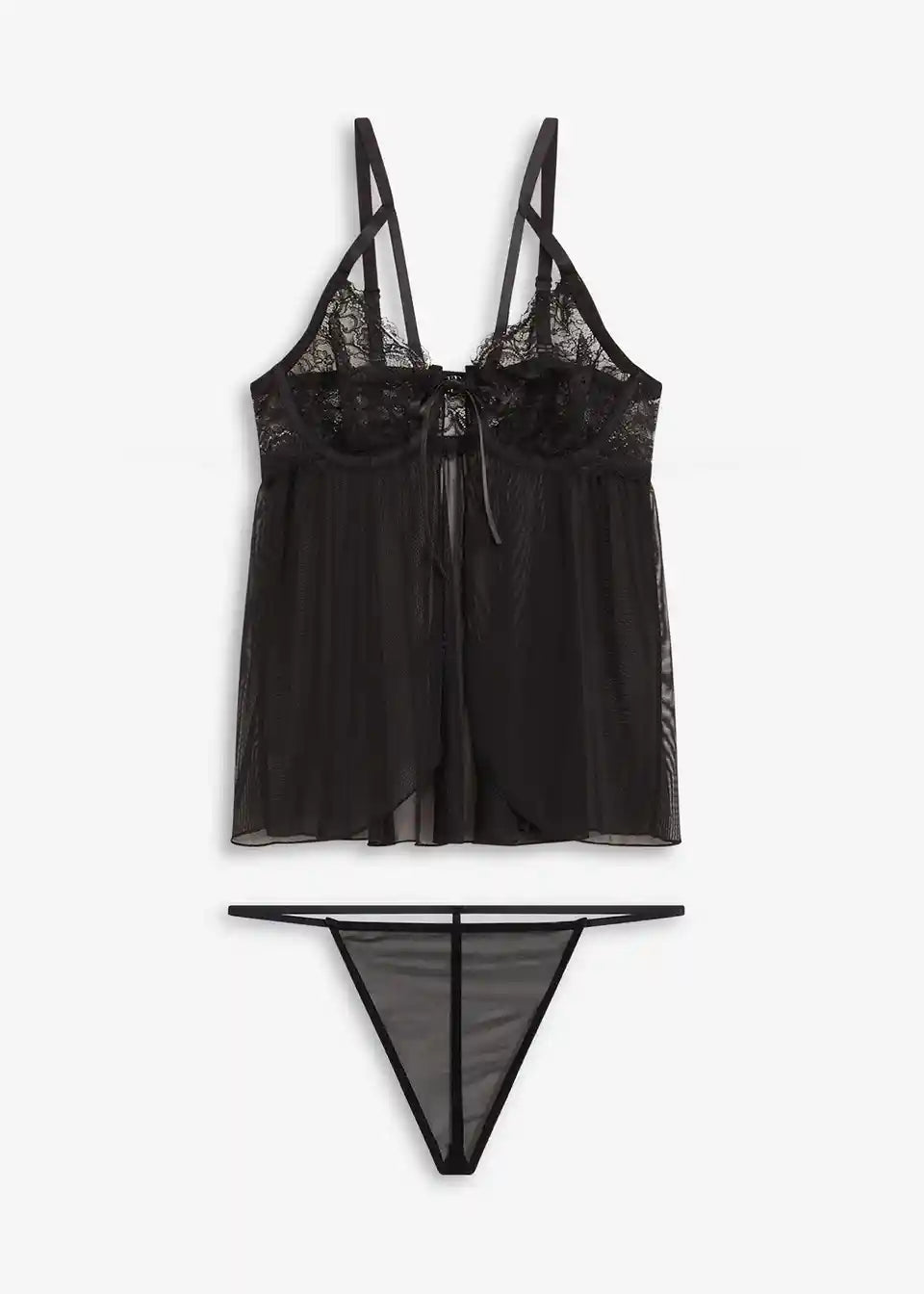 Babydoll + tanga gaćice (set od 2 dijela) od fine čipke i prozirnog mesh materijala.