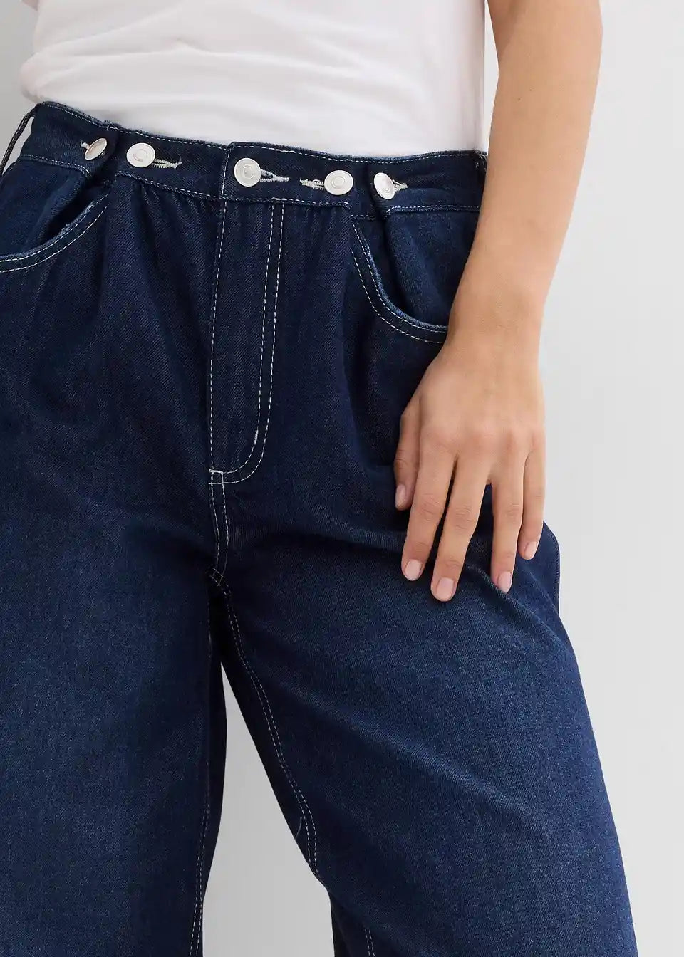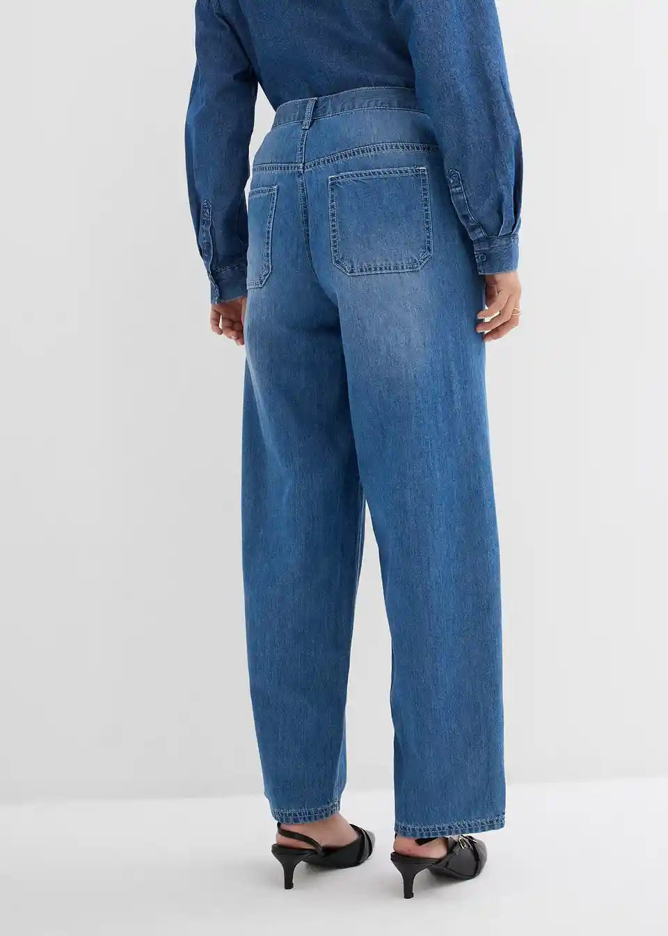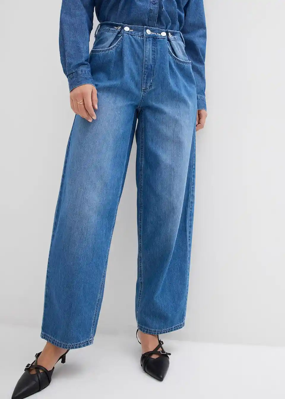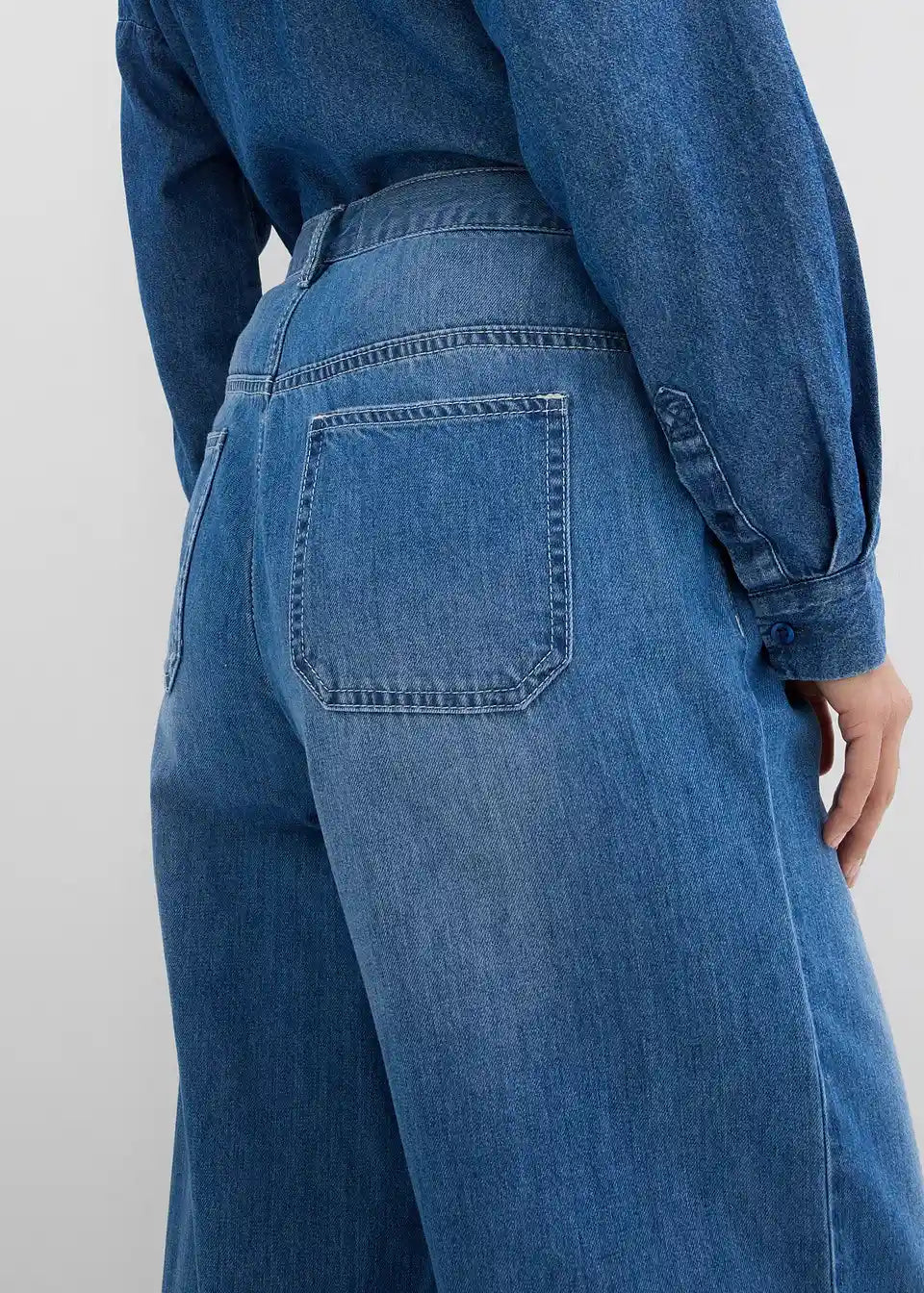 5-Pocket traperice od supermekanog, laganog denima. Labav kroj s voluminoznim, zaobljenim nogavicama od bokova do bedara i suženim krojem prema dolje. Srednje visoki struk. Duljina unutarnje nogavice u veličini 42 cca. 73,5 cm, perivo u perilici.