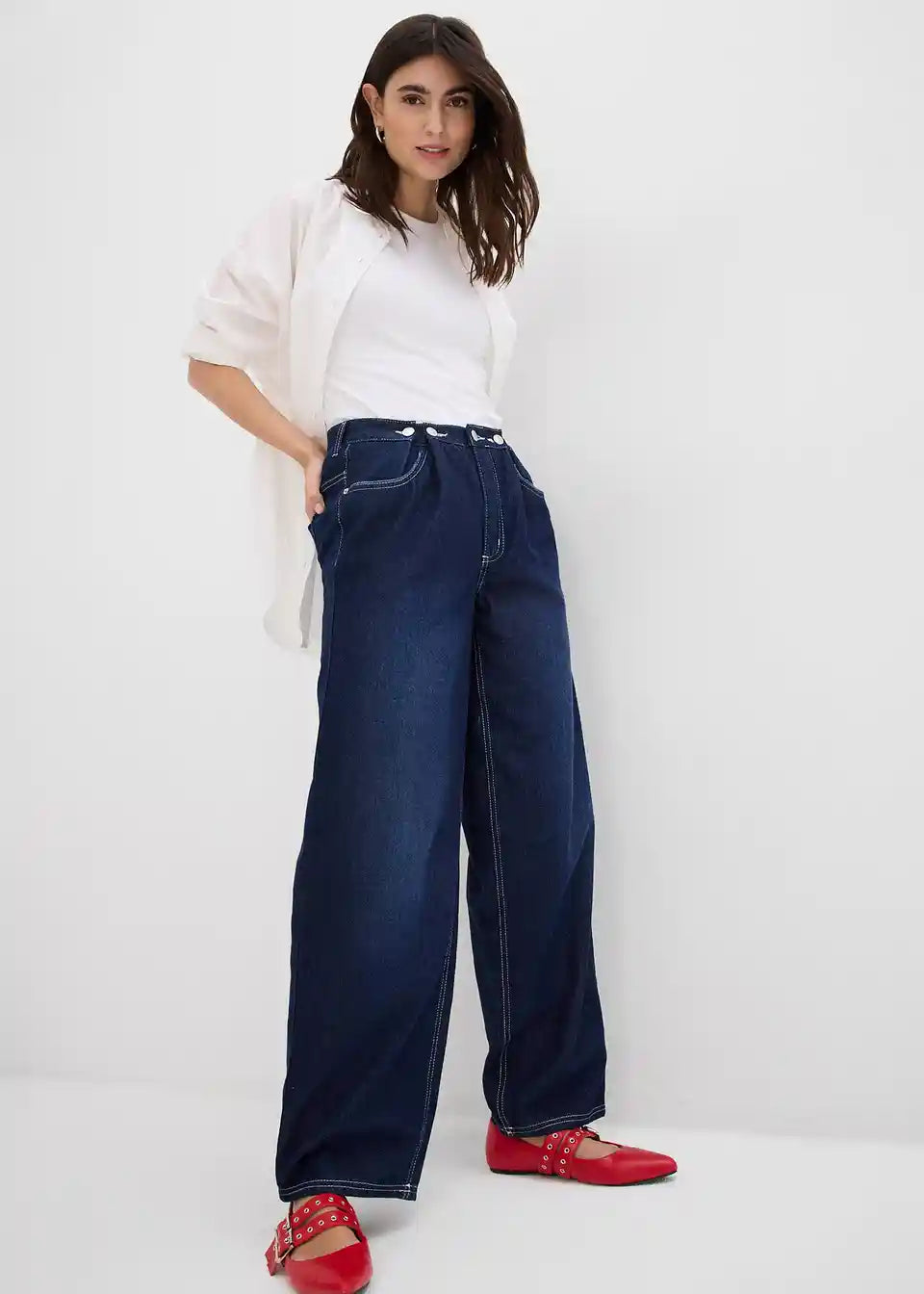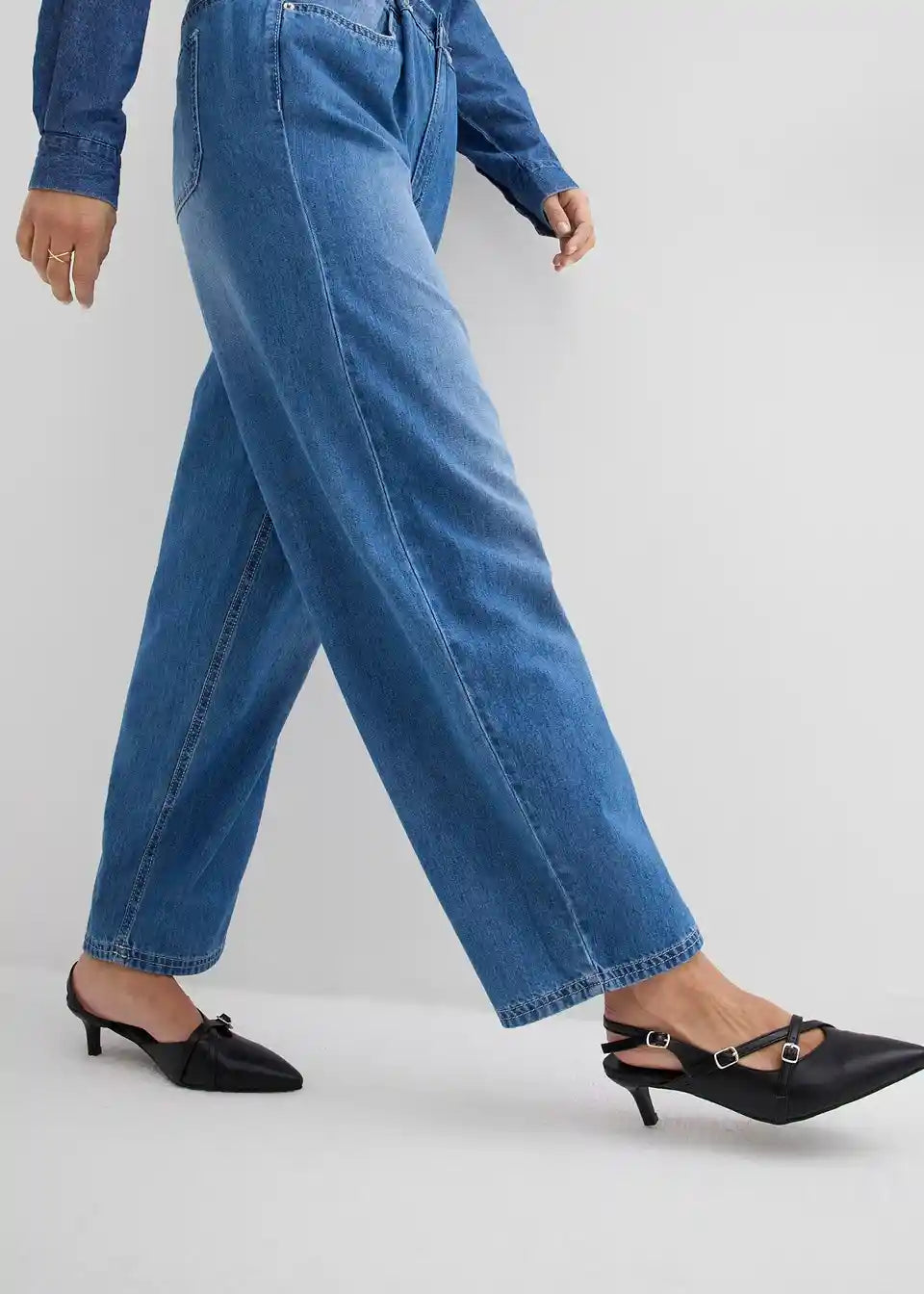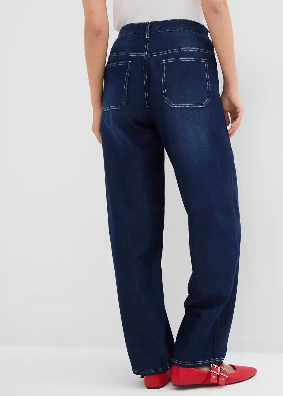 5-Pocket traperice od supermekanog, laganog denima. Labav kroj s voluminoznim, zaobljenim nogavicama od bokova do bedara i suženim krojem prema dolje. Srednje visoki struk. Duljina unutarnje nogavice u veličini 42 cca. 73,5 cm, perivo u perilici.