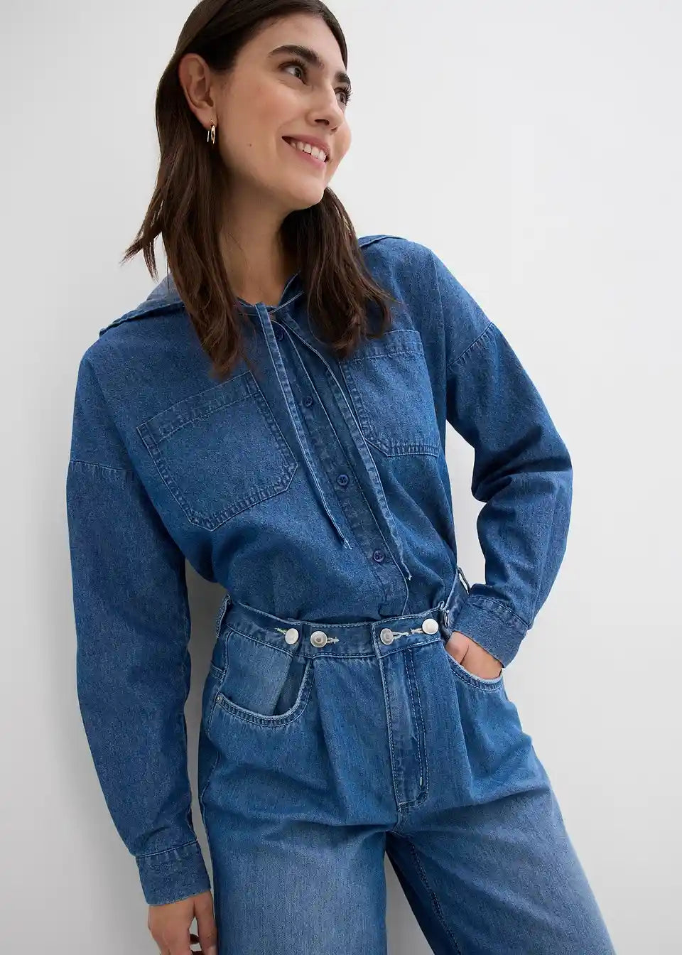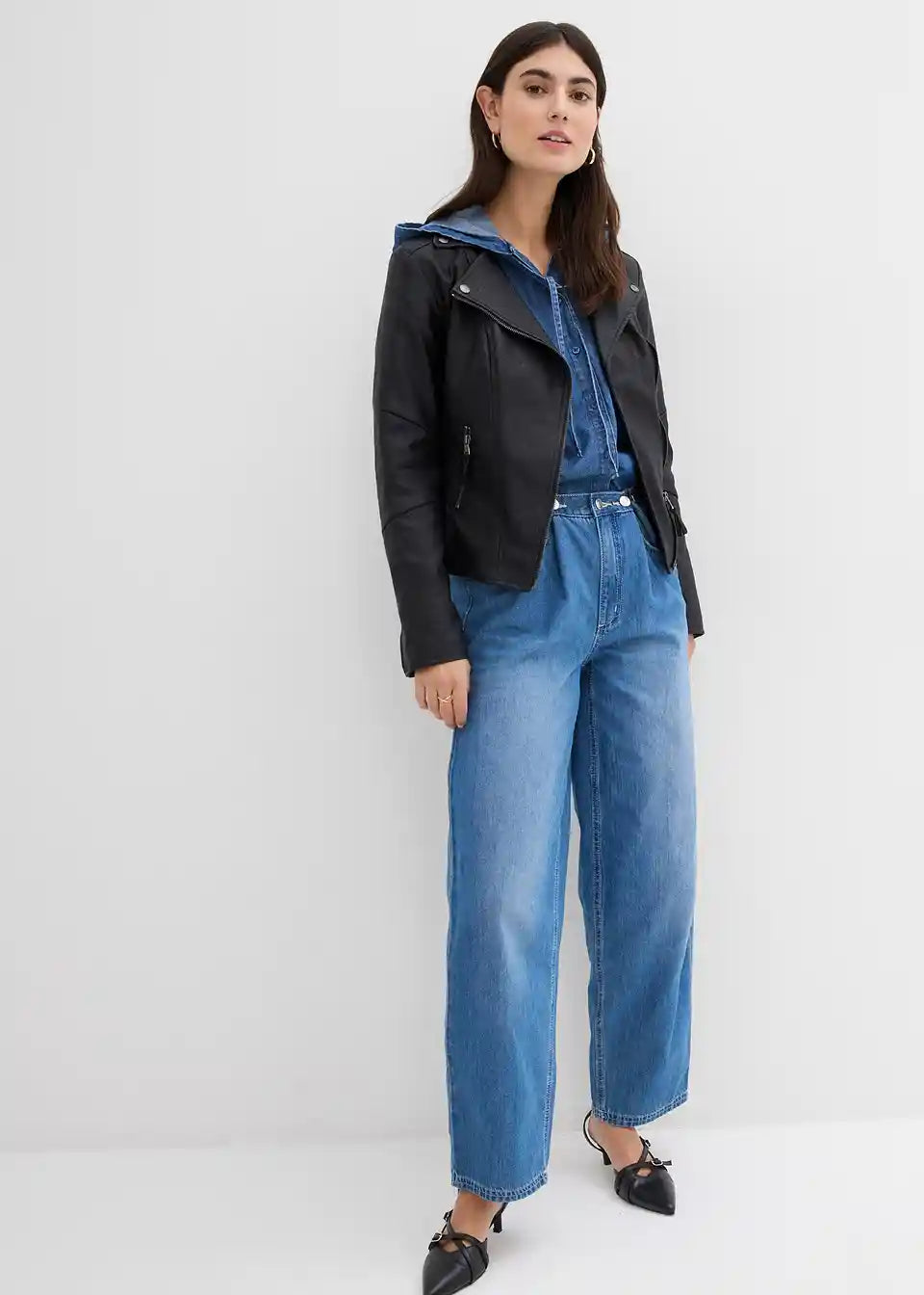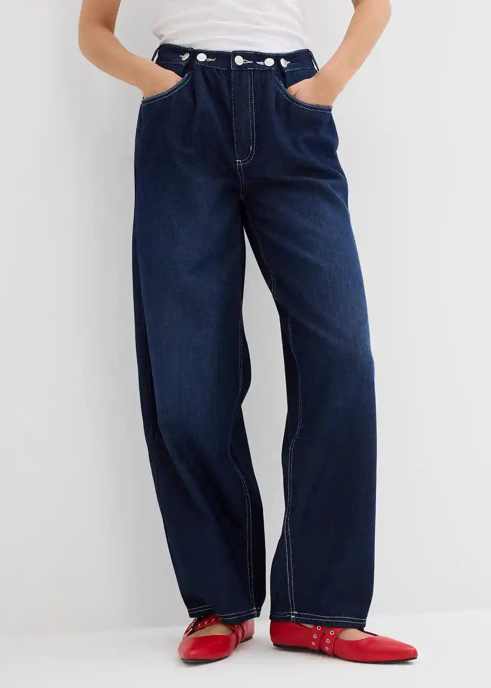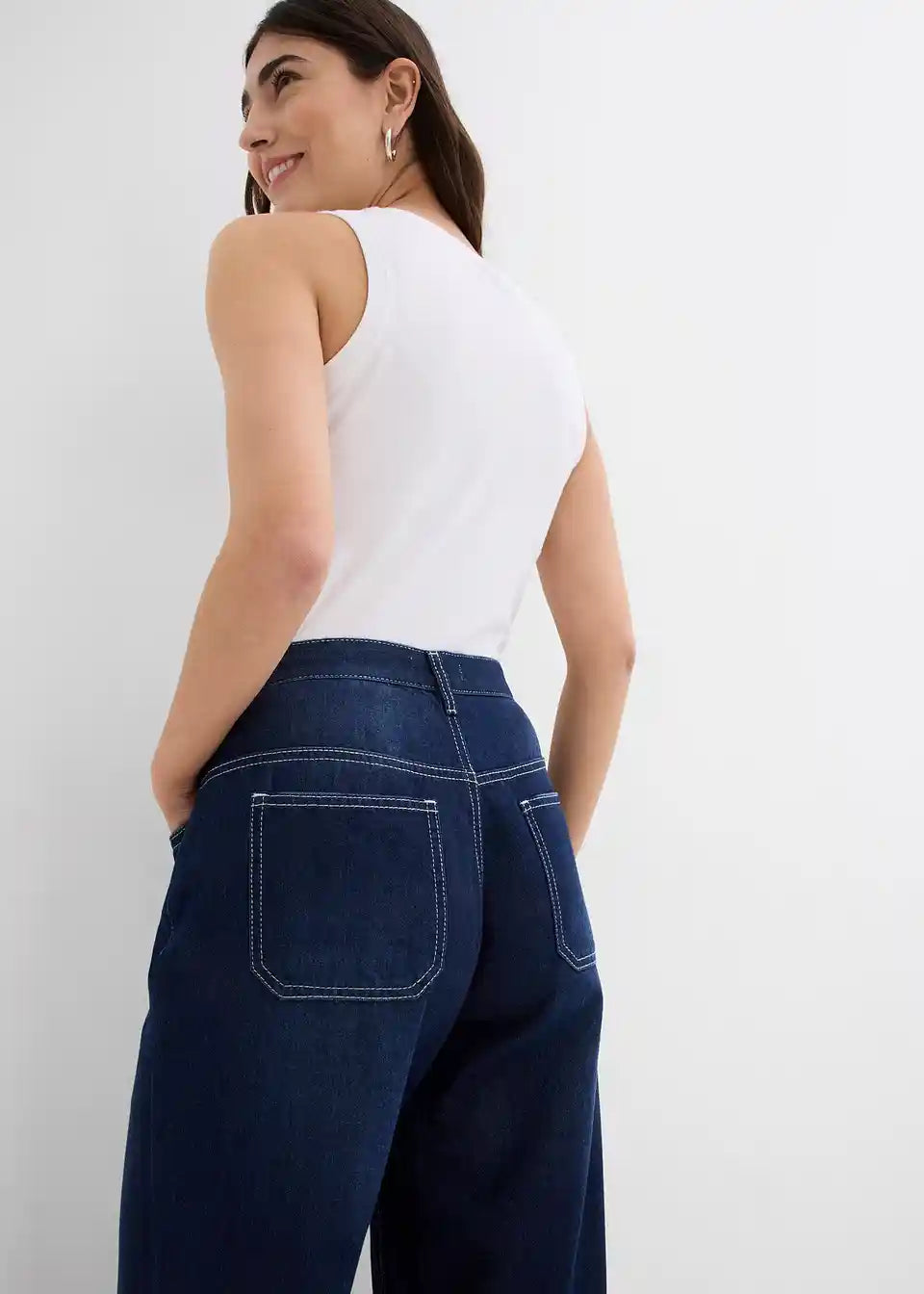 5-Pocket traperice od supermekanog, laganog denima. Labav kroj s voluminoznim, zaobljenim nogavicama od bokova do bedara i suženim krojem prema dolje. Srednje visoki struk. Duljina unutarnje nogavice u veličini 42 cca. 73,5 cm, perivo u perilici.